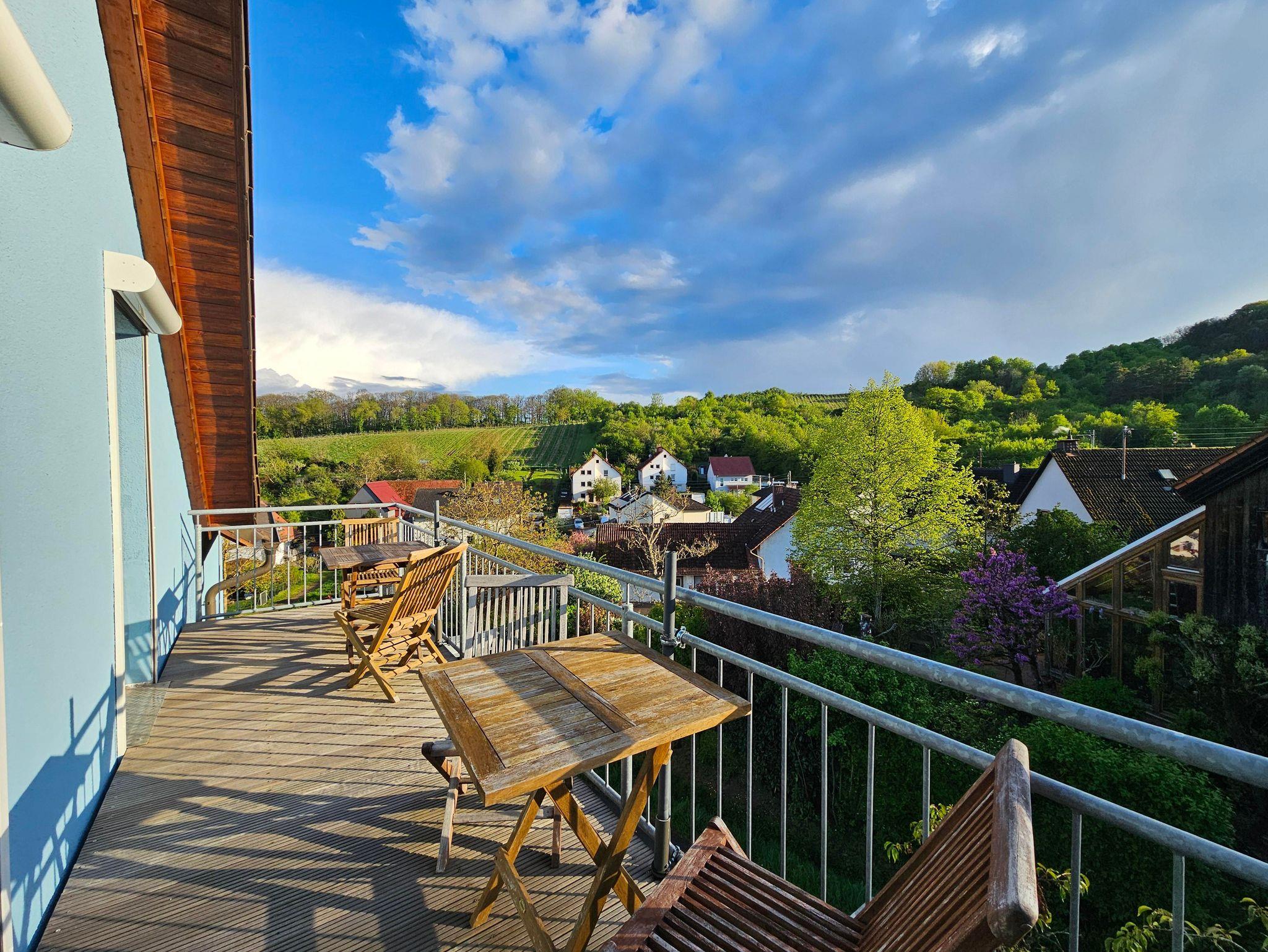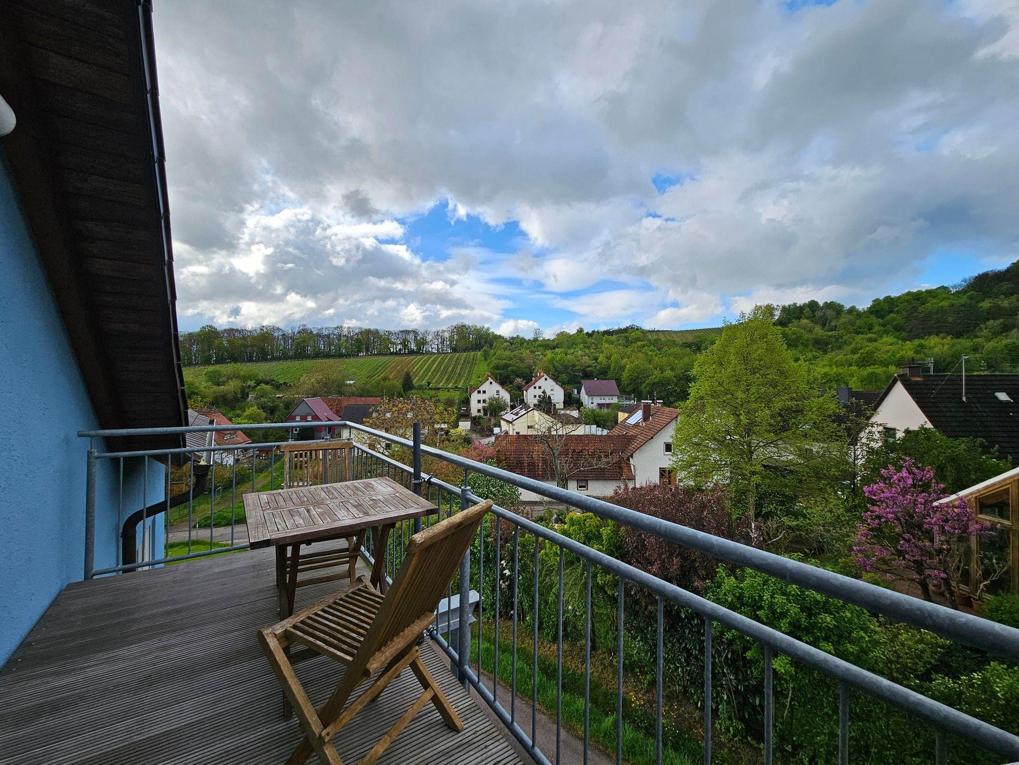 Ihr großer Balkon mit Ausblick auf Wald und Weinberge ist mit Gartenmöbel und Sonnenschirm bestückt.