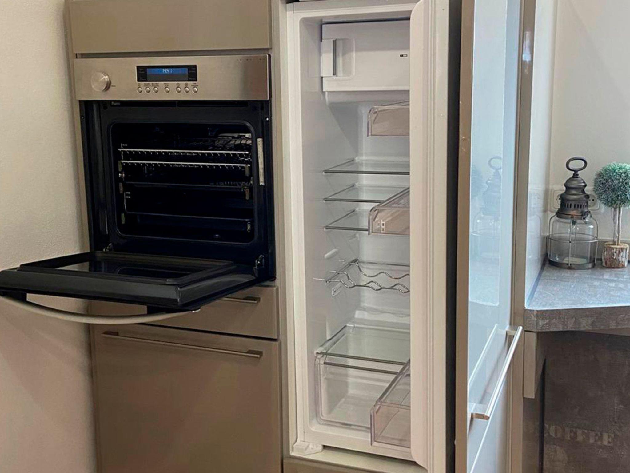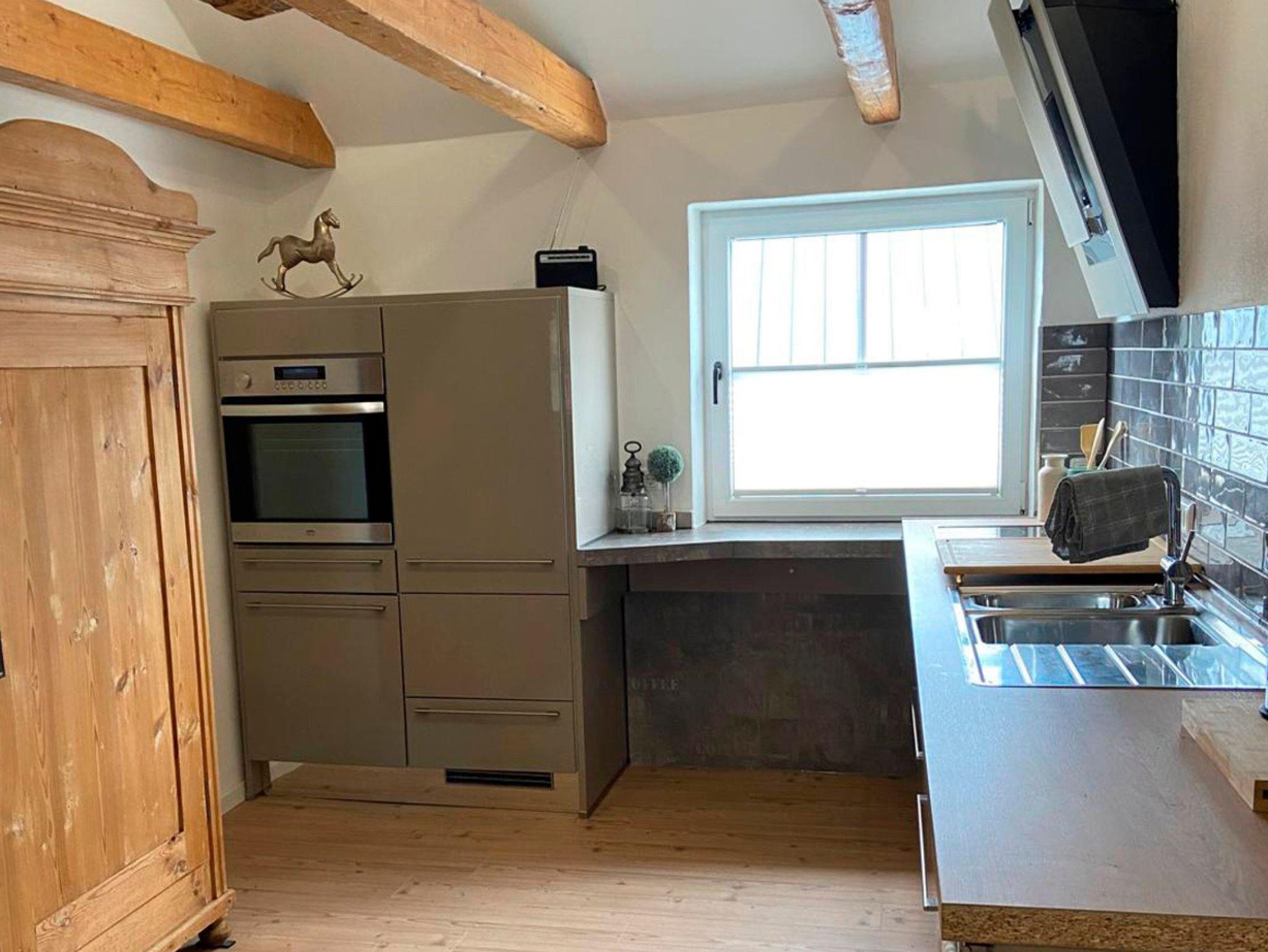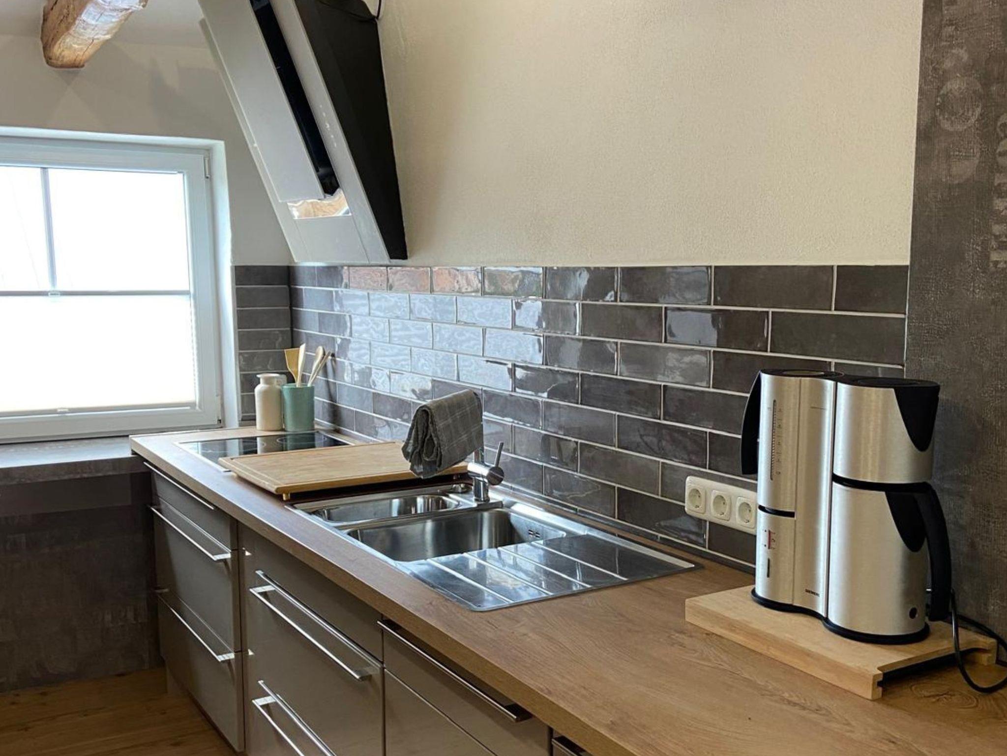 An den Flur grenzt das große Wohn- und Esszimmer mit einer voll ausgestatteten Küche: Spülmaschine, Backofen, Kühlschrank mit 4****-Gefrierfach, Filterkaffeemaschine und Induktionskochfeld, Toaster, Wasserkocher stehen Ihnen ebenso zur Verfügung wie Geschirr, Gläser, Tassen, Kochutensilien, Pfannen, Töpfe und vieles mehr. Geschirrtücher stellen wir Ihnen natürlich auch.