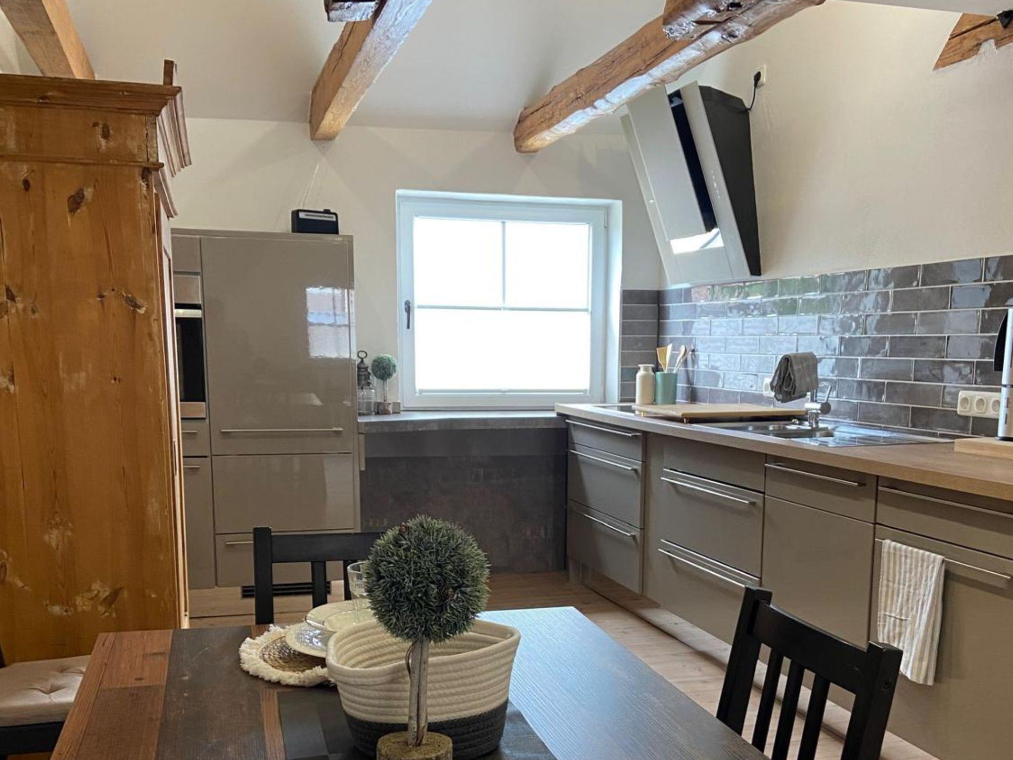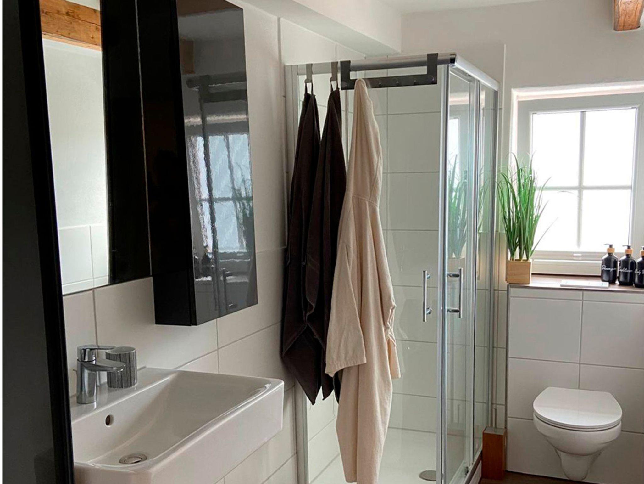 Unsere neu ausgebaute, ruhige und gemütliche Ferienwohnung befindet sich im 1. Stock, welchen Sie über einen separaten Eingang über den Innenhof erreichen. Im Obergeschoss über eine Treppe angekommen, finden Sie nach der Eingangstüre einen Flur mit Garderobe und Schuhschrank, zur rechten Hand ein modernes Bad mit Toilette, Dusche, Waschbecken und Schränken mit frischen Handtüchern und Toilettenpapier.