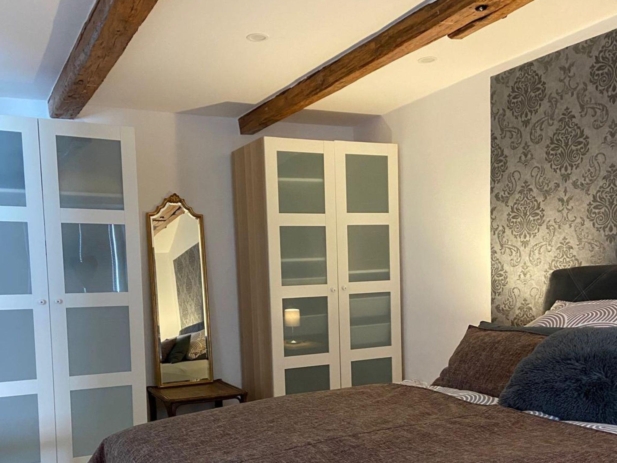 Im Schlafzimmer finden Sie erholsamen Schlaf im großen, gemütlichen, fertig bezogenen Boxspringbett für 2 Personen, in den beiden großen Kleiderschränken (mit vielen Kleiderbügeln) haben Hosen, Pullis und Co. genügend Platz. Auch vom Bett aus können Sie TV schauen, es gibt einen weiteren Flachbildfernseher (ebenfalls Satellit, zusätzlich Möglichkeit für Prime, Youtube ...). WLAN ist überall in der Wohnung verfügbar.