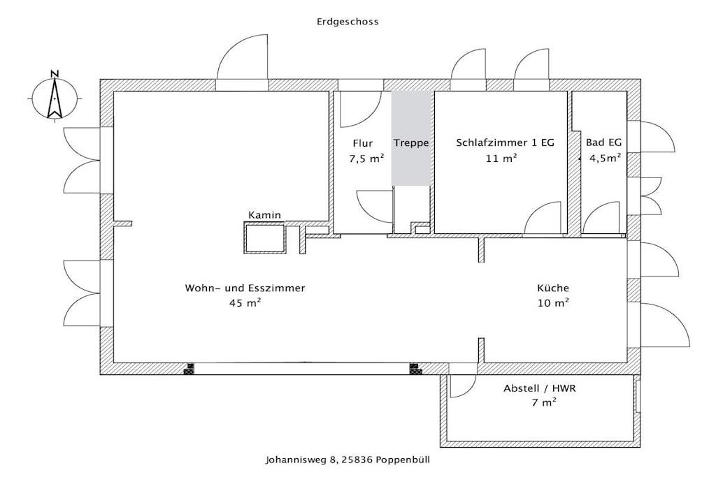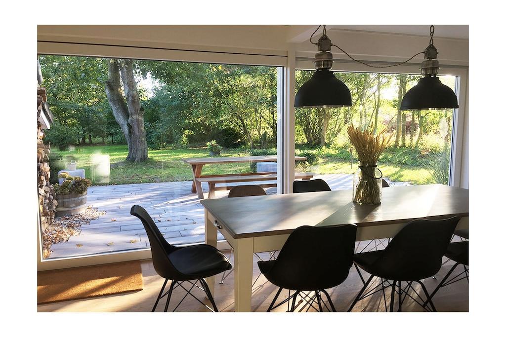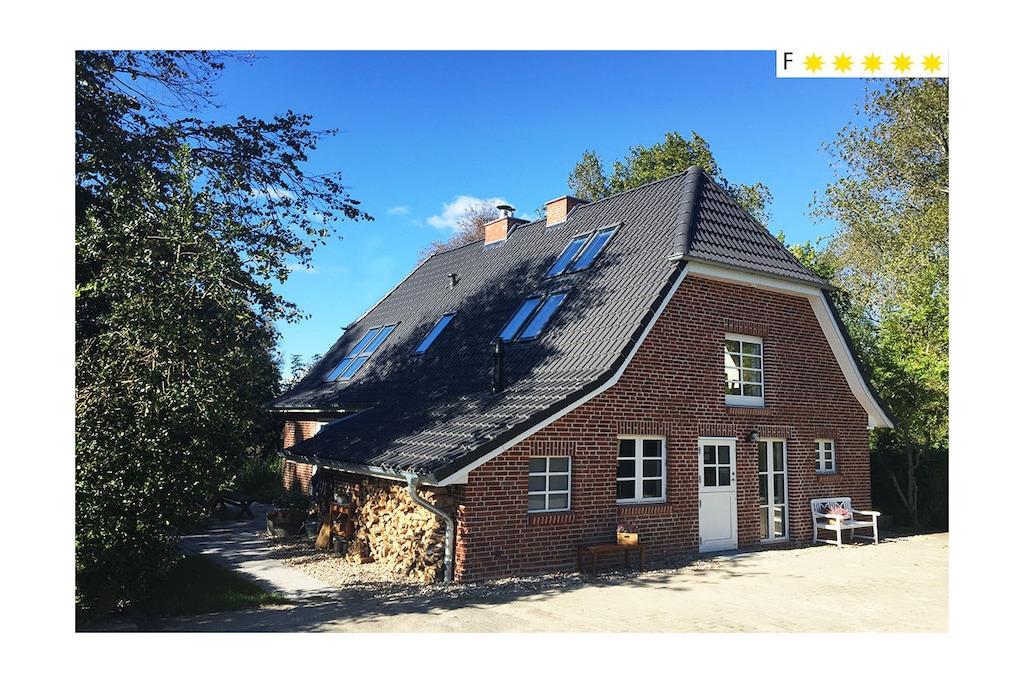 Das Ferienhaus JohannisNest bietet viel Platz - 6 plus 2 Schlafplätze. Der Panoramakamin ergänzt die Fußbodenheizung in der ganzen Ferienwohnung und verbindet Wohn- und Essbereich und spendet nicht nur an kalten Tagen wohlige Wärme, sondern auch in den Abendstunden ein wunderbares Licht. Das 1500 m² Grundstück ist von einem Graben umschlossen, sodass keine Zäune den Weitblick stören. Es gibt Holunder, Ahorn, Weiden, Mirabellen, Johannisbeeren, Brombeeren, eine Garten-Sauna mit Holzofen, ein Weidenhaus für Kinder zum Spielen, einen großen Gasgrill, einen Feuerplatz und vieles mehr als nur ein Platz an der Nordseeluft für Ihre Aktivitäten.