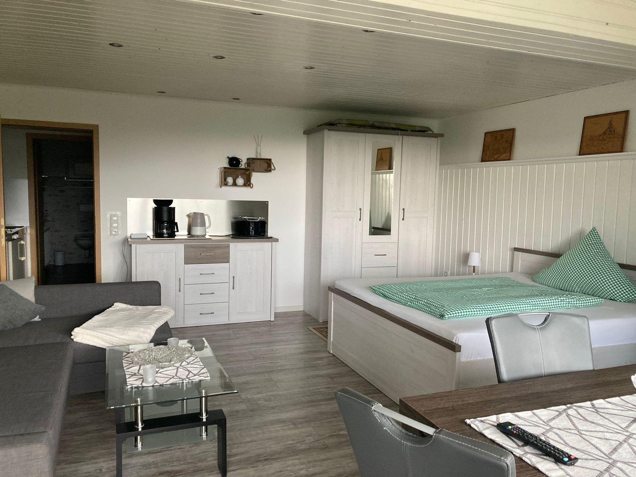 Die Ferienwohnung 4 (45qm) eignet sich für 2 Erwachsene und 2 Kinder. Ein heller großer Wohnraum mit Doppelbett und Schlafcouch, eine komplett eingerichtete Küchenzeile sowie Kaffeemaschinen (Filter und Senseo), Wasserkocher und Toaster, Bad mit Dusche/WC laden zum Erholen ein. Möblierte Terrasse Im großzügigen Eingang können Flugmodelle gebaut und repariert werden.