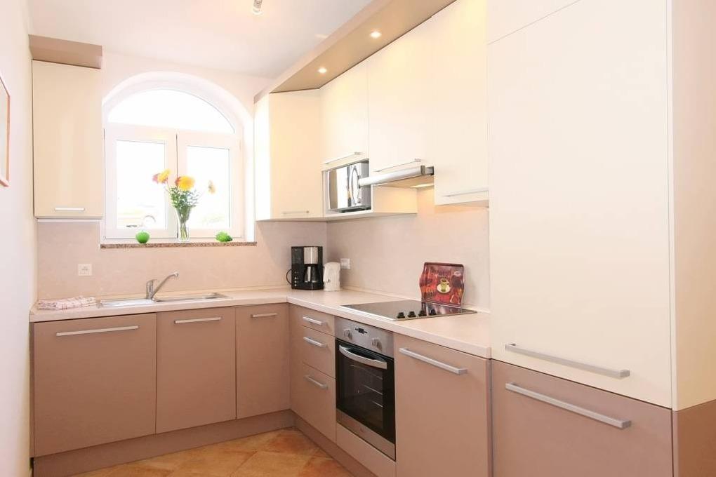 In den Schränken der Küche finden Sie ausreichend Platz für Stauraum und die Küchenkomplettausstattung. Ein 4-Platten-Herd mit Ceranfeld und Backofen, Dunstabzugshaube, Kühlschrank, Tiefkühlschrank, Kaffeemaschine, Mikrowelle, Spülmaschine, Elektrogrill, Wasserkocher, Staubsauger sowie die eingebaute Waschmaschine runden das Angebot ab.