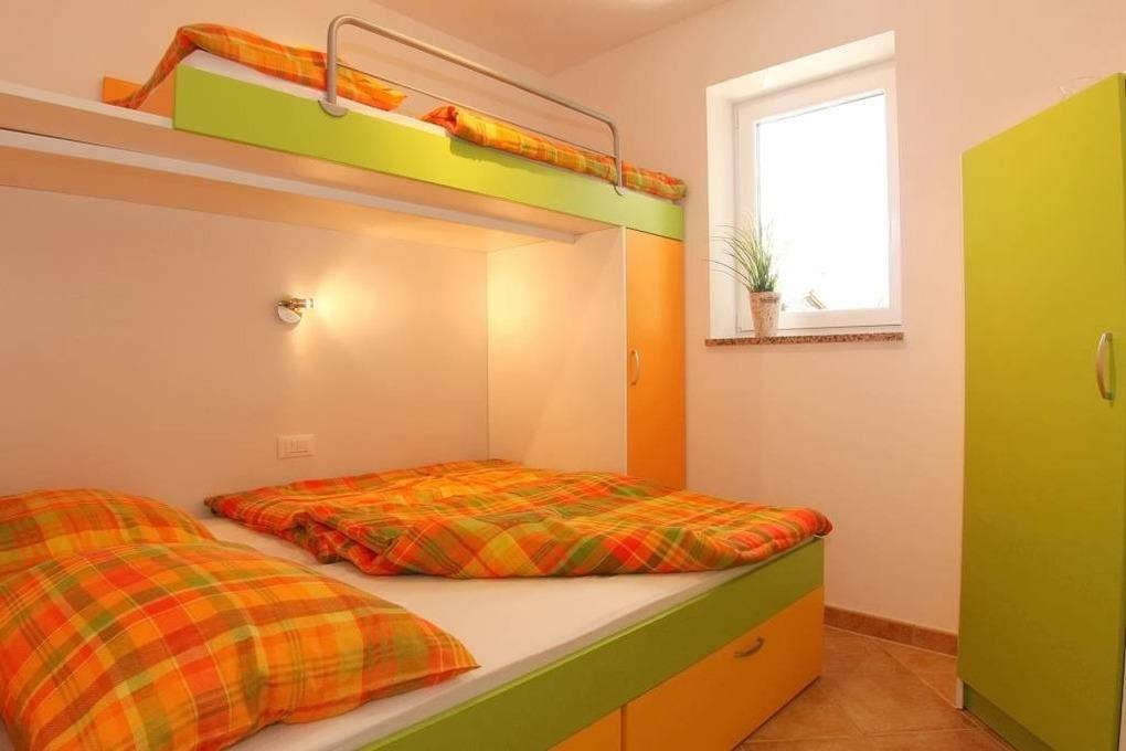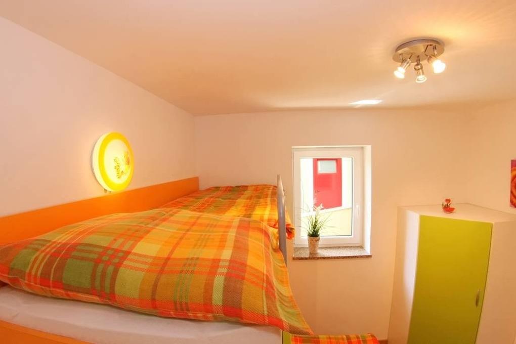 Das Elternschlafzimmer ( 2 x 90 x 200 cm ) hat einen direkten Badzugang. Das Kinderzimmer mit Doppelstockbett[nbsp] ( 150 x 180 und[nbsp] 70 x 180 cm ) für 3 Kinder hat ebenfalls ein separates Bad. Bedingt durch die eingebauten Kleiderschränke ist genügend Stauraum vorhanden.