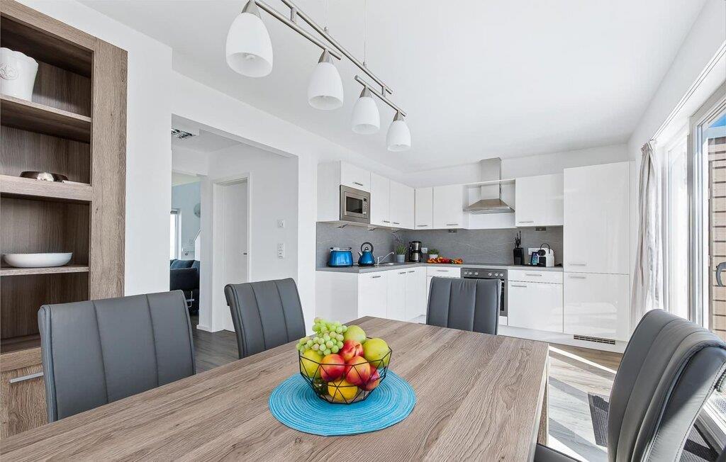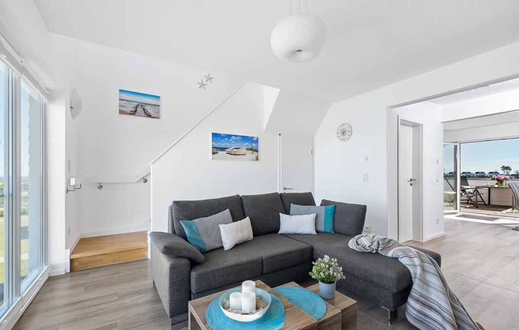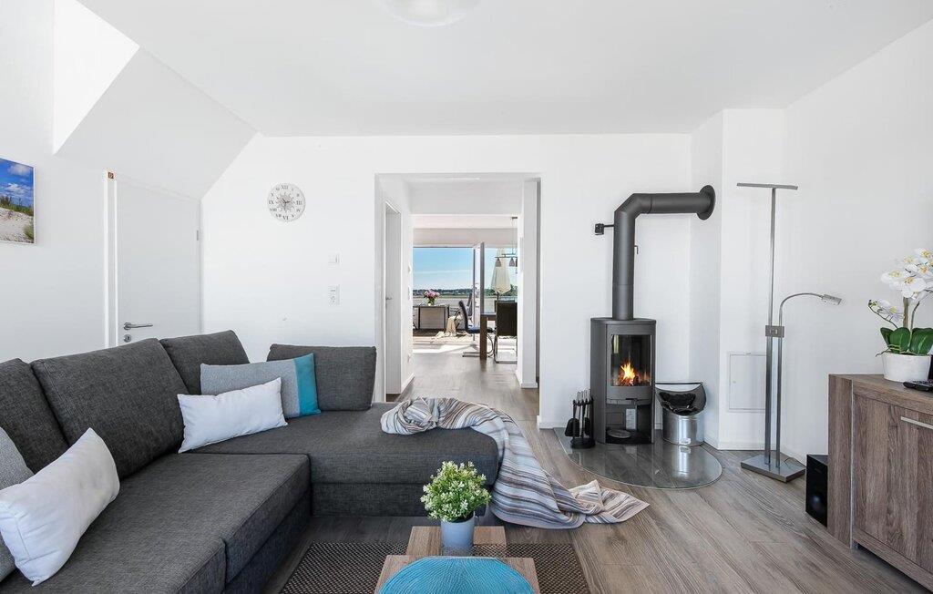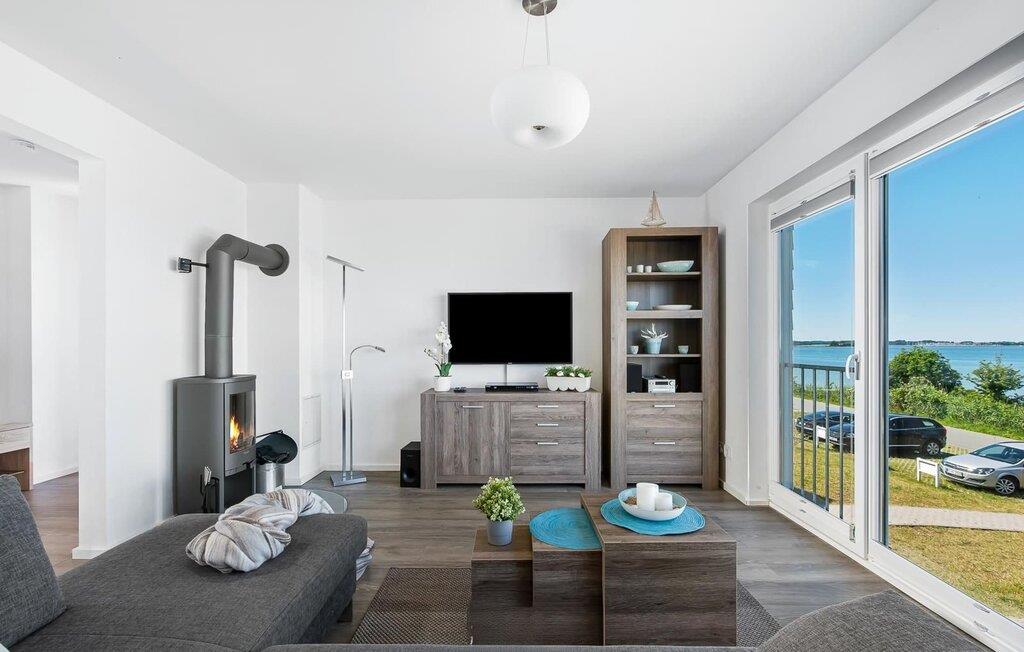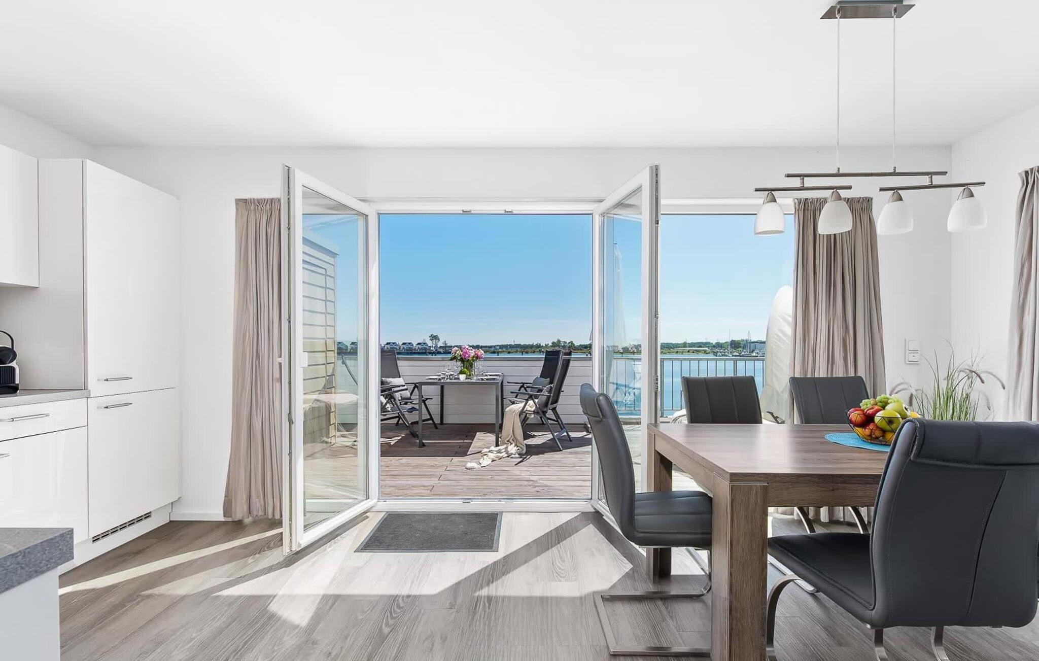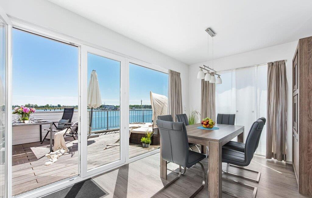 Ferielejligheden Port 55 ligger på et smalt næs mellem Slien og Østersøhavnen og er præget af en fantastisk panoramaudsigt over Sleien på begge sider. Åbent designet, oversvømmet med lys og moderne møbleret, denne højkvalitets ferielejlighed tilbyder fuld feriekomfort. Stuen i ferielejligheden imponerer med gulv til loft vinduer ud mod Sleien. På det hyggelige opholdsområde kan I under en aften sammen foran pejsen nyde udsigten over Slien, dens munding ind i Østersøen og Schmelzünde fyrtårn. Det fuldt udstyrede køkken/alrum vender ud mod havnesiden og giver frit udsyn til havnebiografen. Foran gulv til loft-vinduer inviterer et massivt spisebord til seks personer jer til at nyde feriemåltider. Herfra er der adgang til den direkte tilstødende terrasse med syd-syd-vest orientering. Højdepunktet på den rummelige terrasse er den stilrene solø i lounge-look med optimal vindbeskyttelse. Soveområdet er på øverste stueplan. Begge soveværelser byder på ren afslapning med udsigt til vandet, mens højt til loftet og skrå loft sikrer en særlig hygge. Det store soveværelse har et ekstra tv. Der er to ekstra sovepladser på den komfortable sovesofa i opholdsstuen. Wellness på Schleiblick tilbyder det fuldt udstyrede badeværelse på øverste niveau med sauna (infrarød kabine) og spabad. Et brusebad på første sal i lejligheden giver ekstra komfort. Port 55 ferielejligheden er en etagelejlighed på første og anden sal. Der er en parkeringsplads lige foran husets indgang. WiFi er ikke tilgængeligt i denne ferielejlighed. Vores favoritsted: Sæt jer ned i opholds- eller spiseafdelingen med udsigt til den panoramiske vandfront, drej hovedet og se kun vand på den anden side. Bemærk venligst: OstseeResort Olpenitz er meget populært, og der bygges fortsat i parken. Ikke desto mindre kan I se frem til en 5-stjernet standard og et førsteklasses ophold. Byggeaktiviteterne kommer ikke til at forstyrre jer på ferien, og derfor gives der ikke yderligere afslag i prisen.