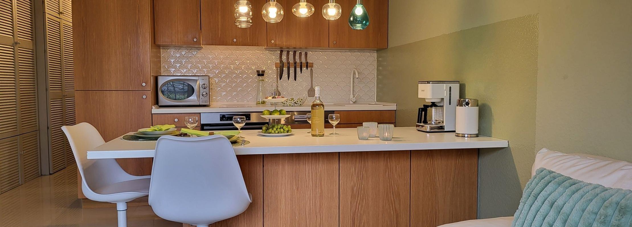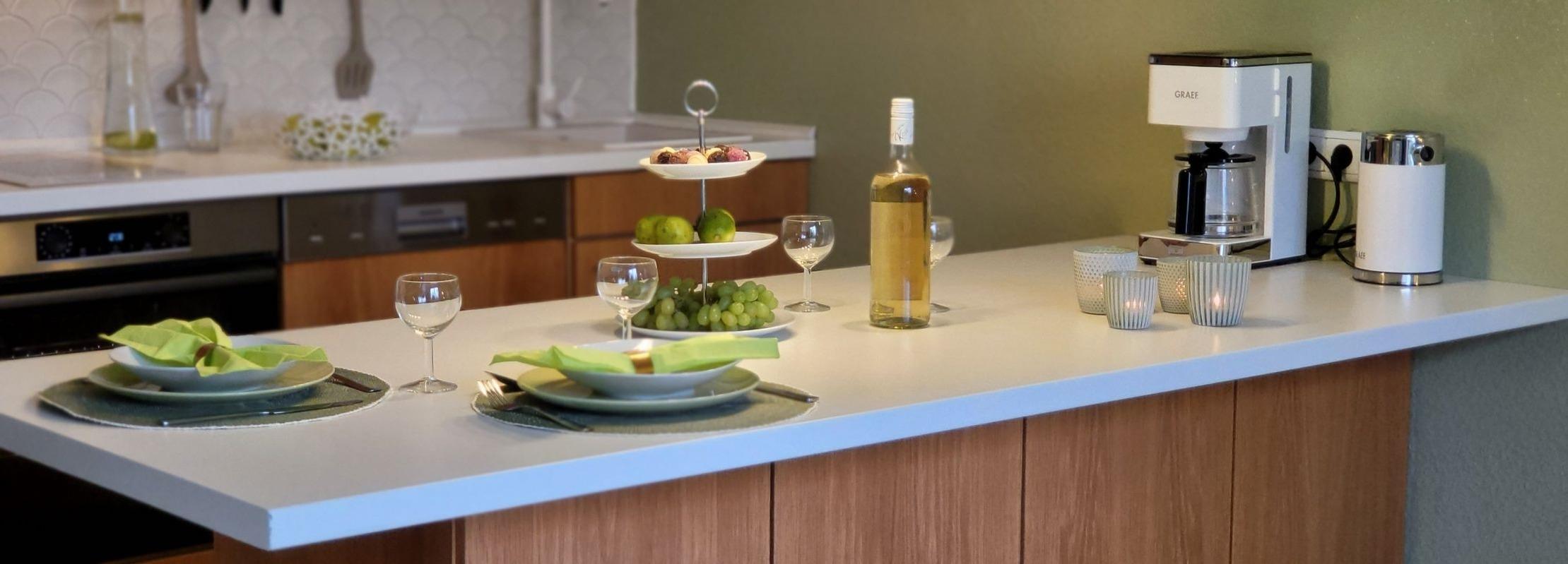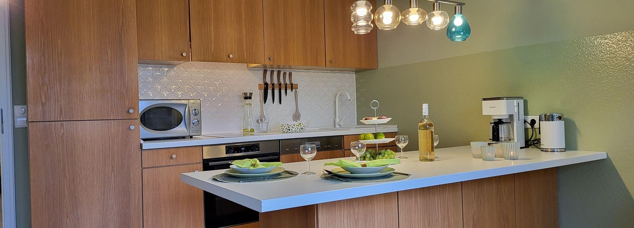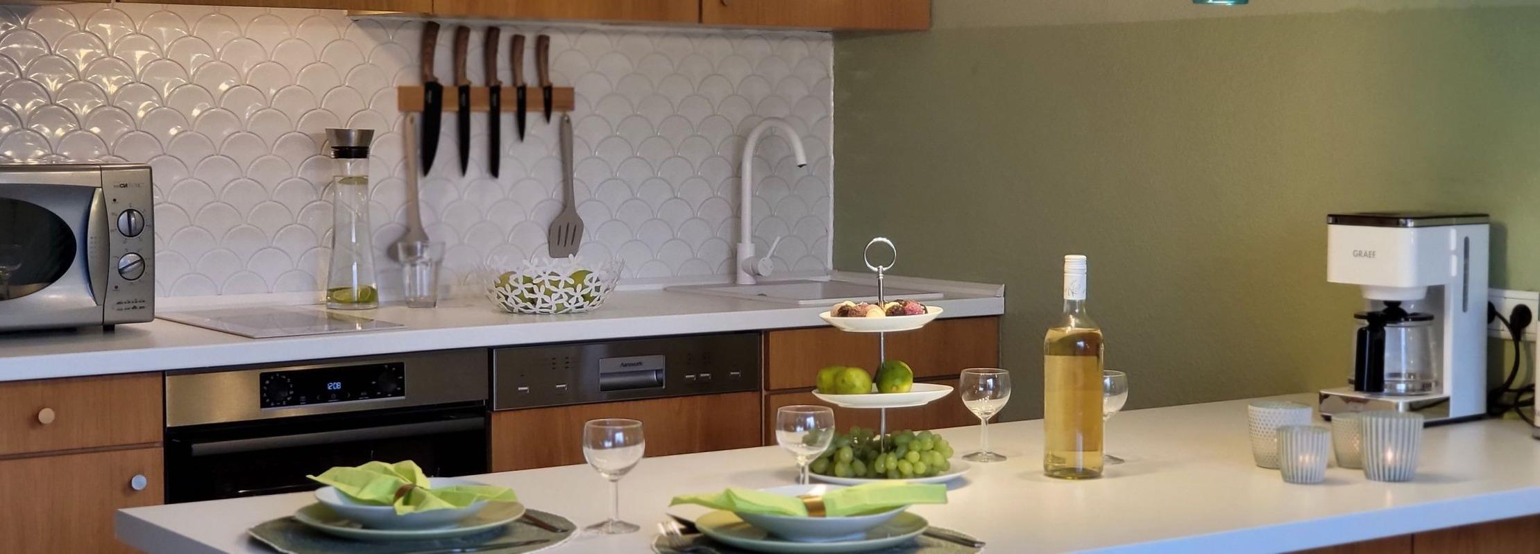 Die Küche bietet alles, um sich selbst zu verpflegen (voll ausgestattete Einbauku¨che mit Herd, Induktionskochfeld, Backofen, Geschirrspu¨ler, Mikrowelle, Toaster, Kaffeemaschine und Wasserkocher).