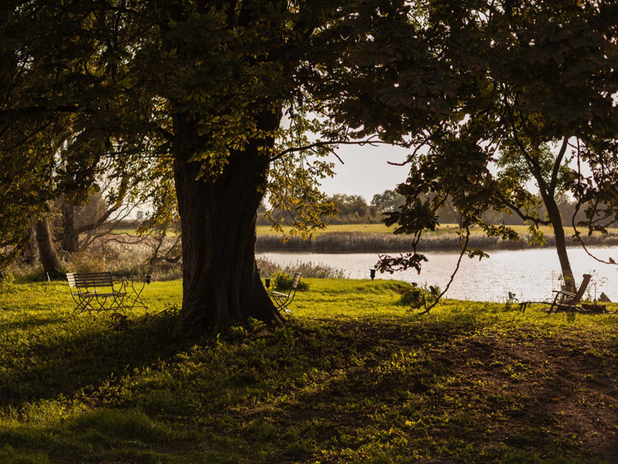 Die Grundmauern der alten Scheunenflächen des ehemaligen landwirtschaftlichen Guts sind wieder sichtbar gemacht worden. Der Ausblick von Haus und Park ist zu allen Seiten geprägt durch die Lage direkt am Wasser.