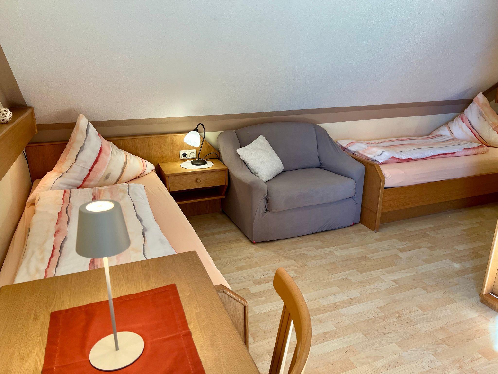 In unserer Ferienwohnung 2 (65 qm) können Sie auf dem gemütlichen Balkon die Abendsonne genießen. Zwei bis sechs Personen haben Platz in einem großen Schlafzimmer mit Doppelbett und Schlafcouch und einem weiteren Schlafzimmer mit zwei Einzelbetten und einem Zustellbett.