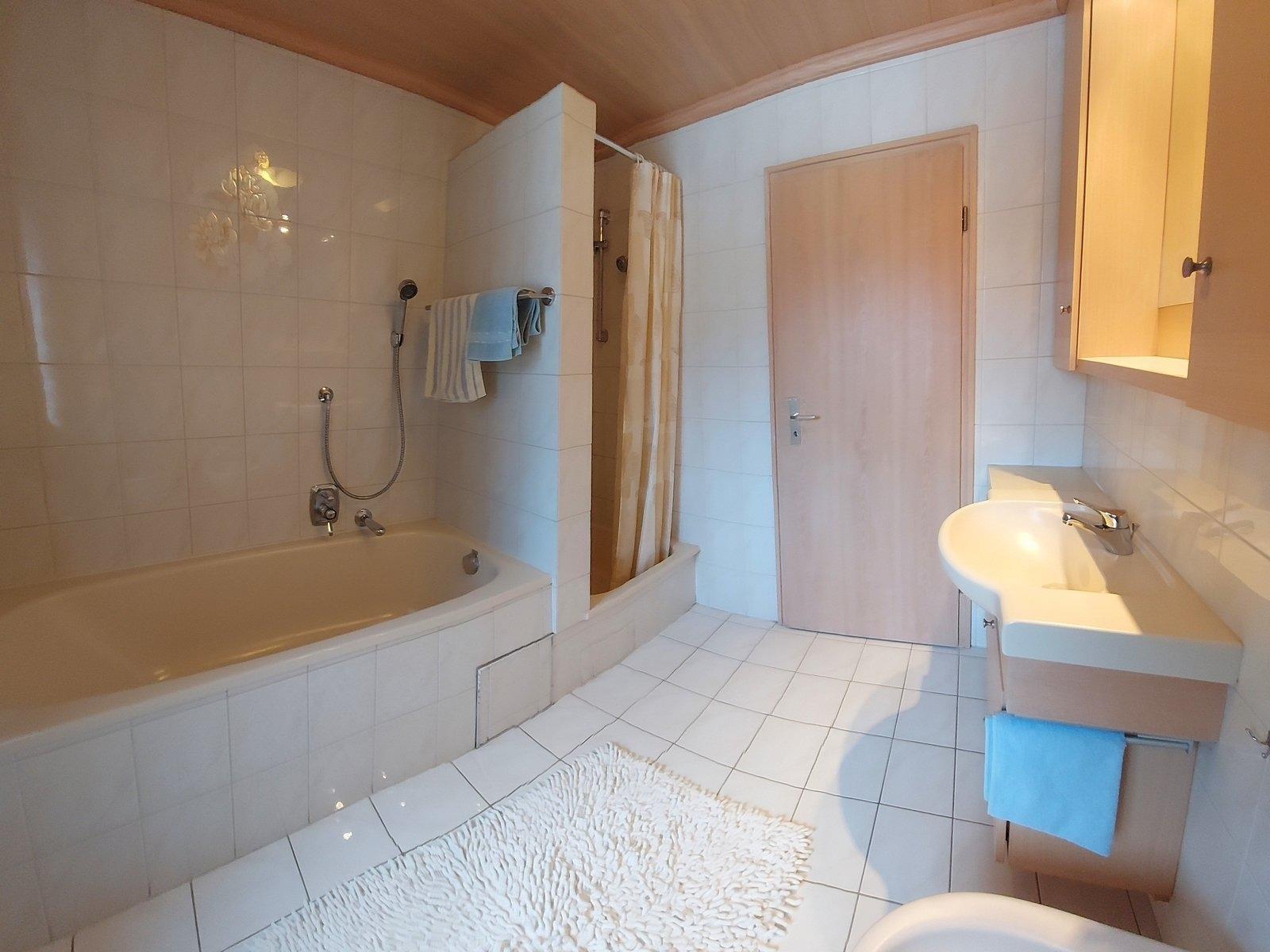 Das schöne, großzügig eingerichtete Badezimmer verfügt über Badewanne, Dusche, Bidet, Waschtisch und WC.