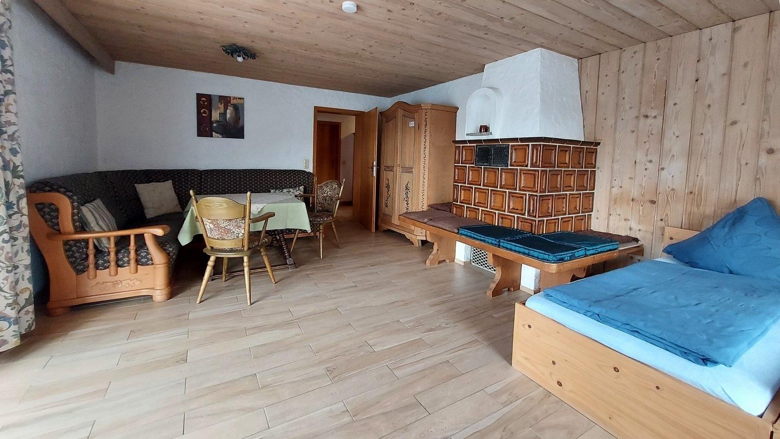 Ein gemütliches und geräumiges Wohn-/Esszimmer mit Eckbank und Polstersitzgruppe, TV, Radio und Kachelofen lädt zum gemeinsamen Essen und Beisammensitzen ein, WLAN ist vorhanden.