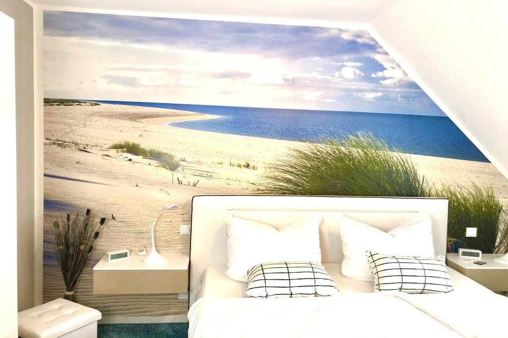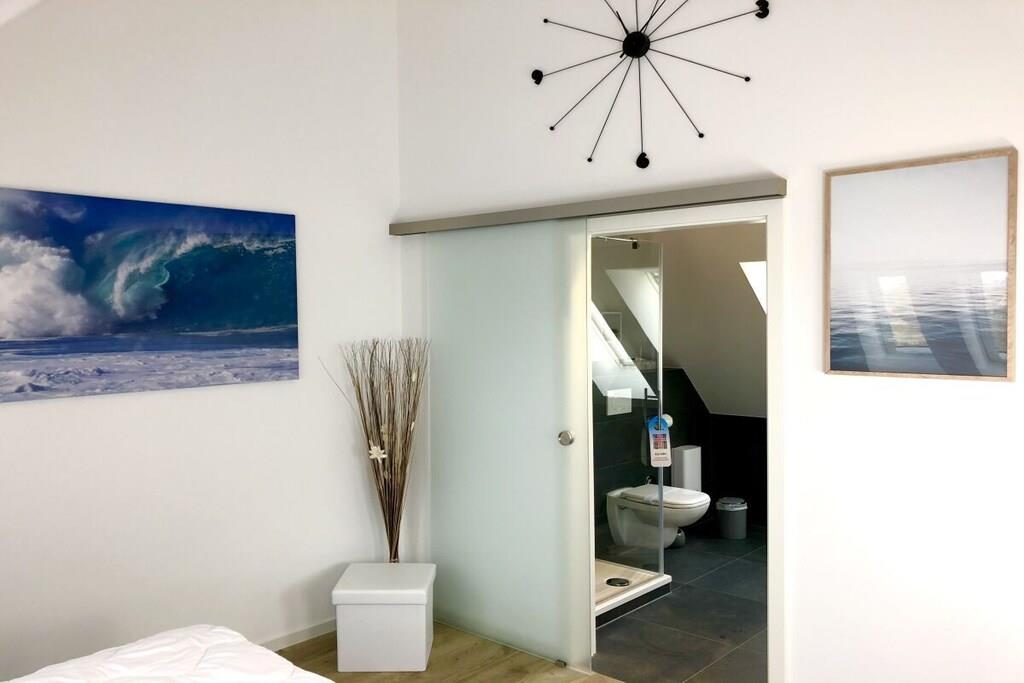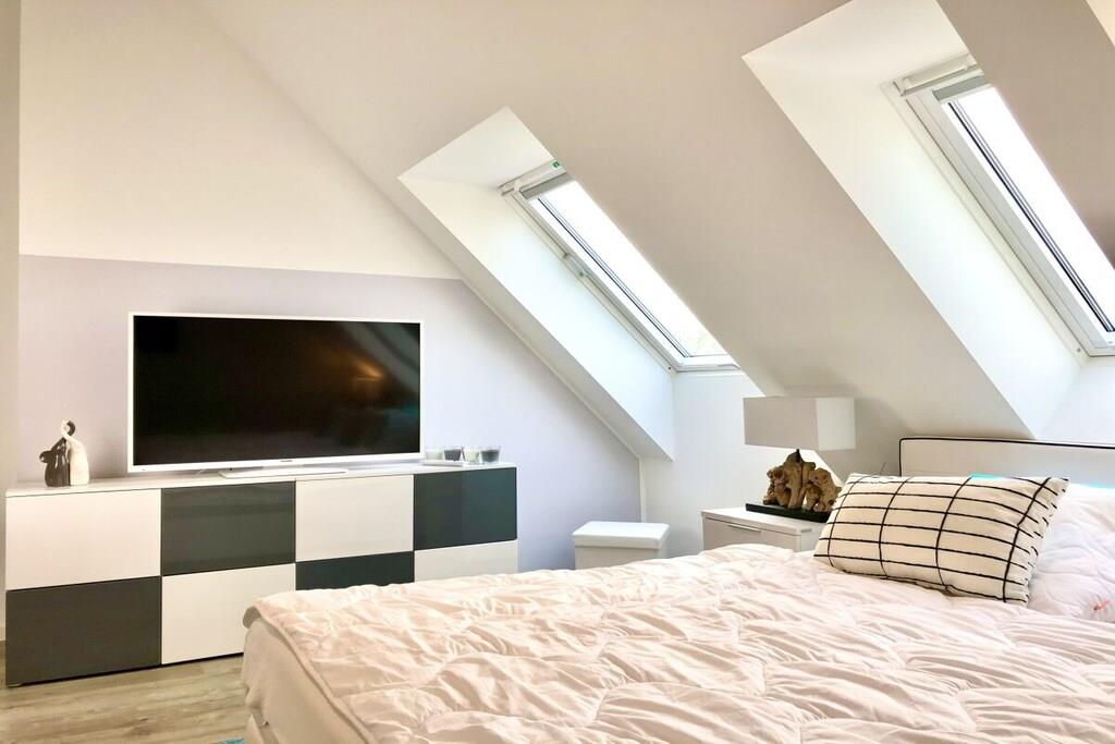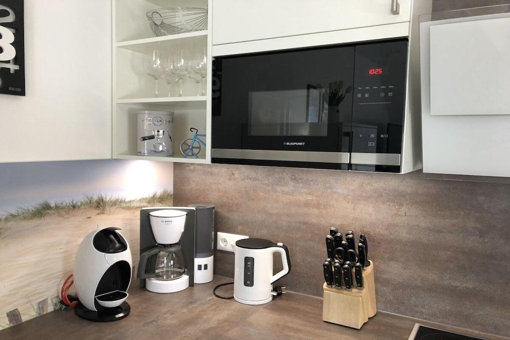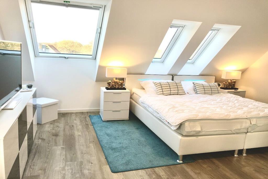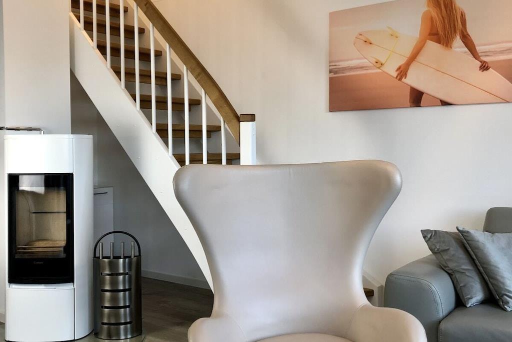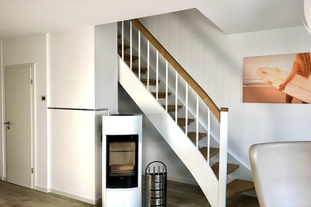 På 1. etage: (entre(varme), Stue(enkeltsovesofa, Fjernsyn, DVD-afspiller, Blu-ray afspiller, radio, CD-afspiller, spilcomputer, varme, hyggespil, insektnet), Køkken(spisebord, kakkelovn, kogeplade, elkedel, brødrister, kaffemaskine, ovn, mikrobølgeovn, opvaskemaskine , køleskab, fryser, varme), badeværelse(bruser, håndvask, toilet, varme, Håndklæder inkl.), pulterkammer(vaskemaskine, strygebræt, strygejern, tørreskab)) På 2. etage: (soveværelse(king size-seng, king size-seng, Fjernsyn, radio, tremmeseng, varme, insektnet), soveværelse(dobbeltseng, dobbeltseng, Fjernsyn, radio, varme, insektnet), badeværelse(bruser, håndvask, toilet, varme, Håndklæder inkl.)) balkon, havemøbler, Parasol