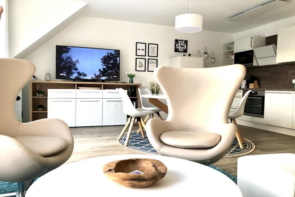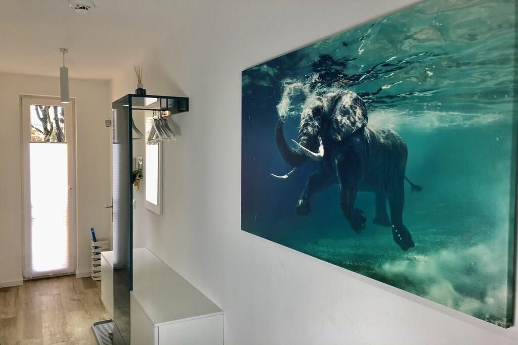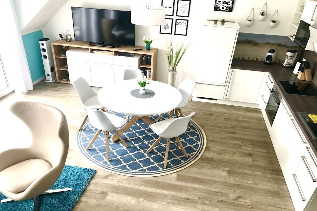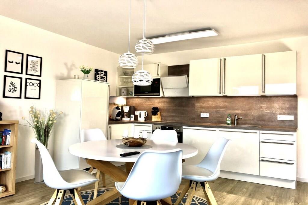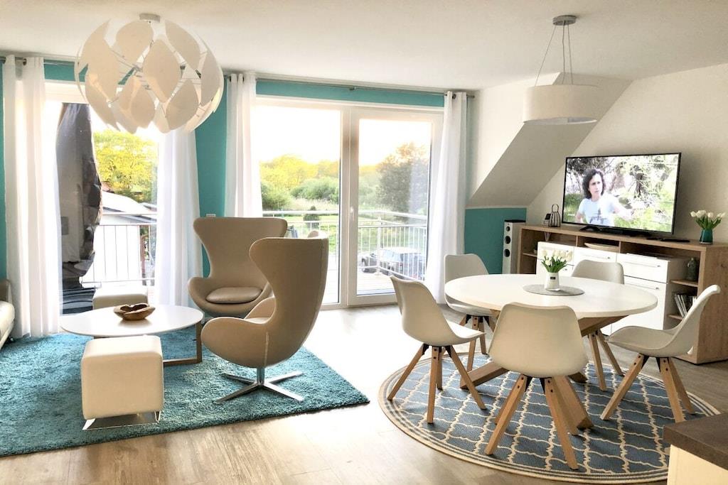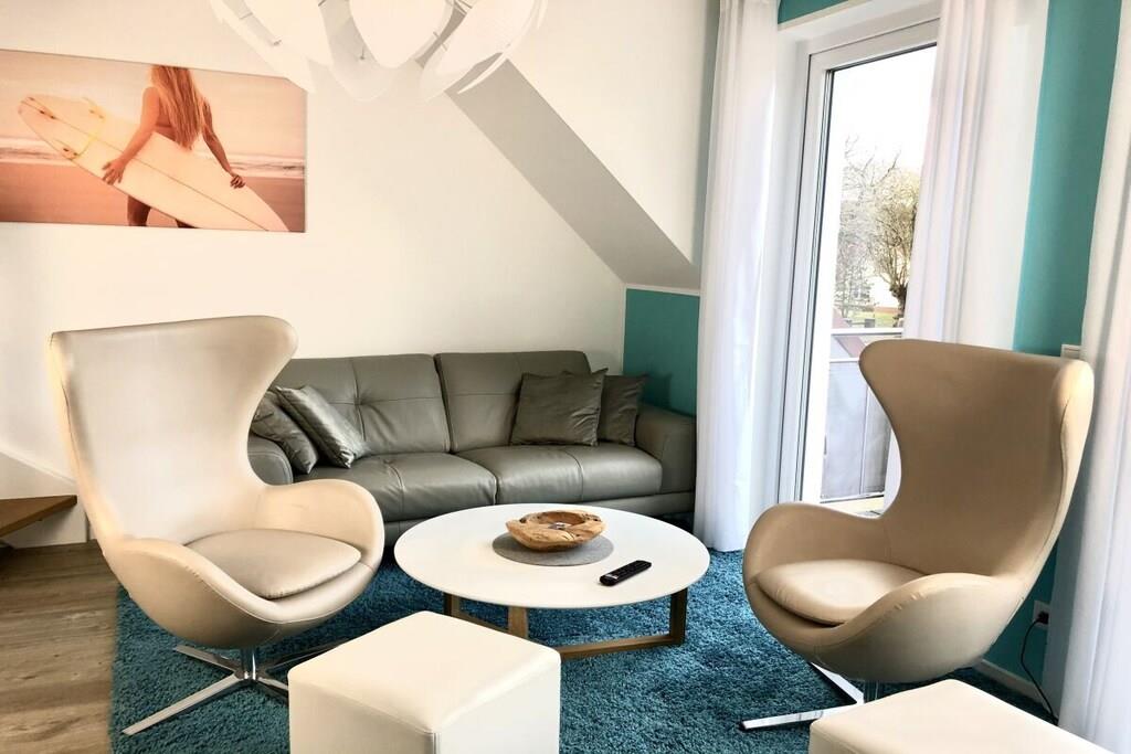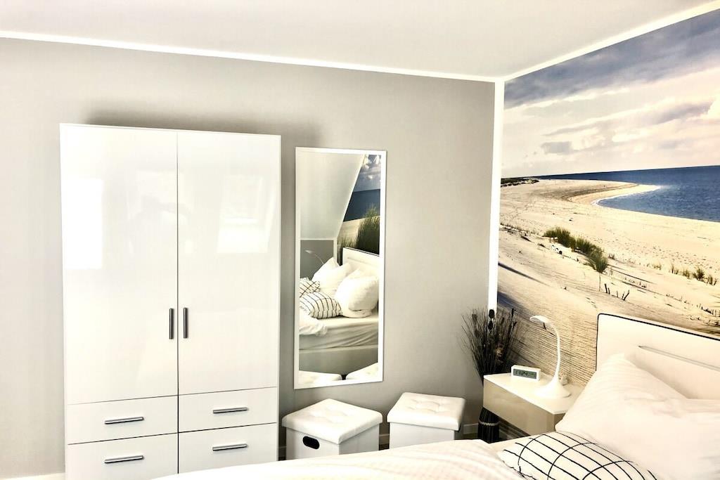 På 1. etage: (entre(varme), Stue(enkeltsovesofa, Fjernsyn, DVD-afspiller, Blu-ray afspiller, radio, CD-afspiller, spilcomputer, varme, hyggespil, insektnet), Køkken(spisebord, kakkelovn, kogeplade, elkedel, brødrister, kaffemaskine, ovn, mikrobølgeovn, opvaskemaskine , køleskab, fryser, varme), badeværelse(bruser, håndvask, toilet, varme, Håndklæder inkl.), pulterkammer(vaskemaskine, strygebræt, strygejern, tørreskab)) På 2. etage: (soveværelse(king size-seng, king size-seng, Fjernsyn, radio, tremmeseng, varme, insektnet), soveværelse(dobbeltseng, dobbeltseng, Fjernsyn, radio, varme, insektnet), badeværelse(bruser, håndvask, toilet, varme, Håndklæder inkl.)) balkon, havemøbler, Parasol