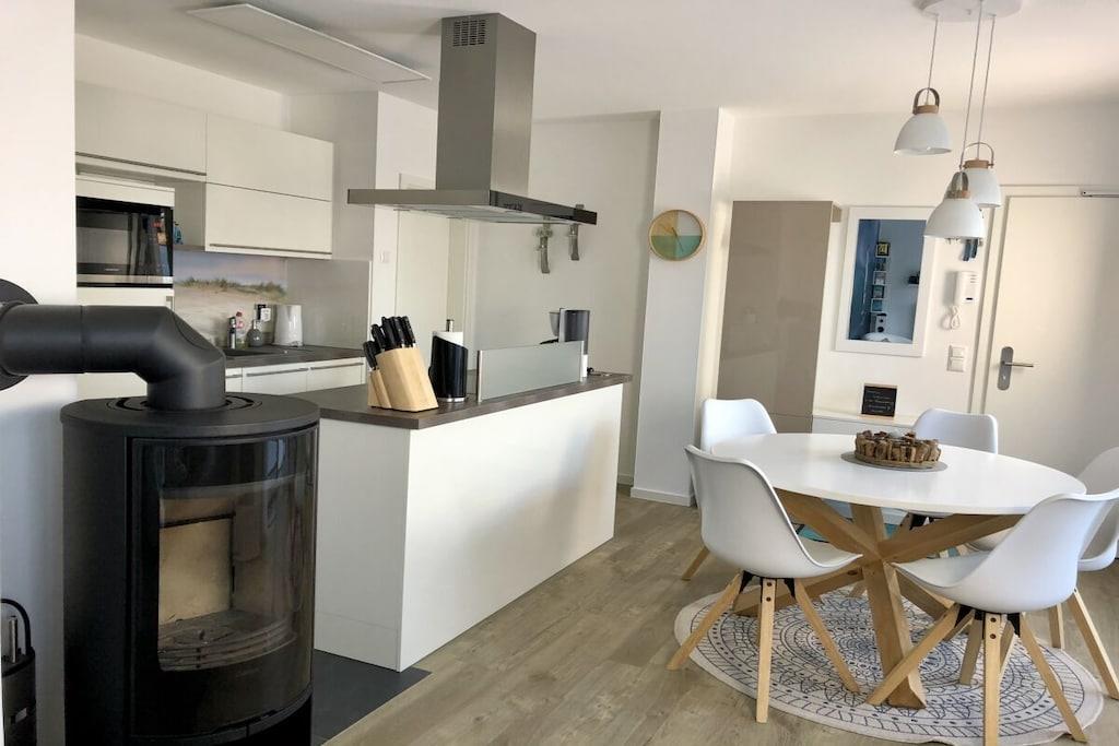 Denne ferielejlighed stod færdig i 2019 og er udstyret med al komfort til en behagelig ferie. Gulvvarme i alle rum, moderne nyt køkken med kogeø, opvaskemaskine, mikroovn, køleskab med fryser, komfur, kaffemaskine, elkedel, kapselmaskine og meget mere. Opholdsstue med sovesofa, lænestol, skammel, fladskærm, WiFi, PlayStation 4 og pejs. Soveværelse med boksmadrasser, stort skab, insektnet, mørklægning og TV. En spiseplads, stor terrasse med opholdsområde, grill og liggestole, moderne badeværelse med gulv til loft regnbruser. To parkeringspladser direkte ved ejendommen er gratis til rådighed.