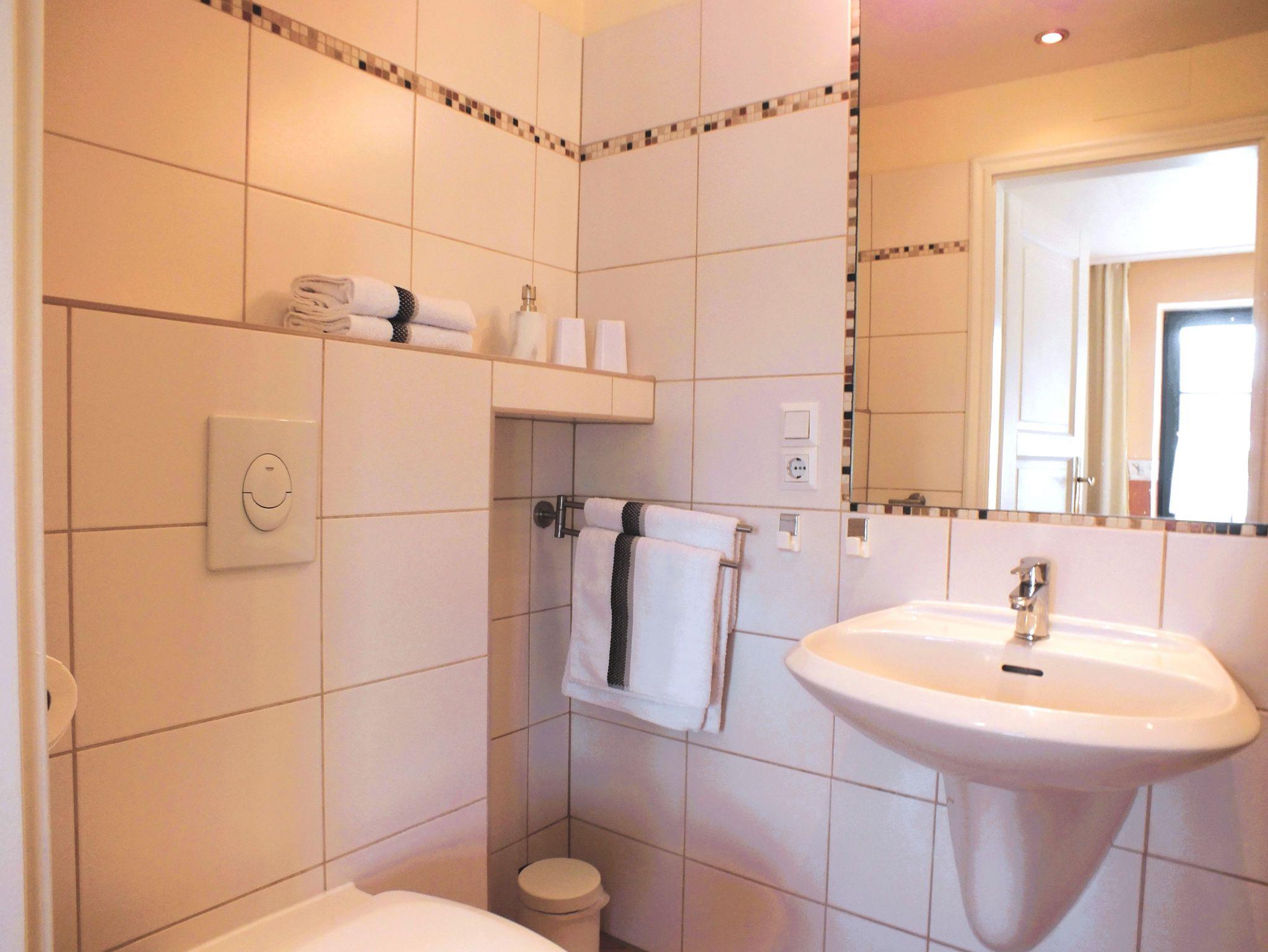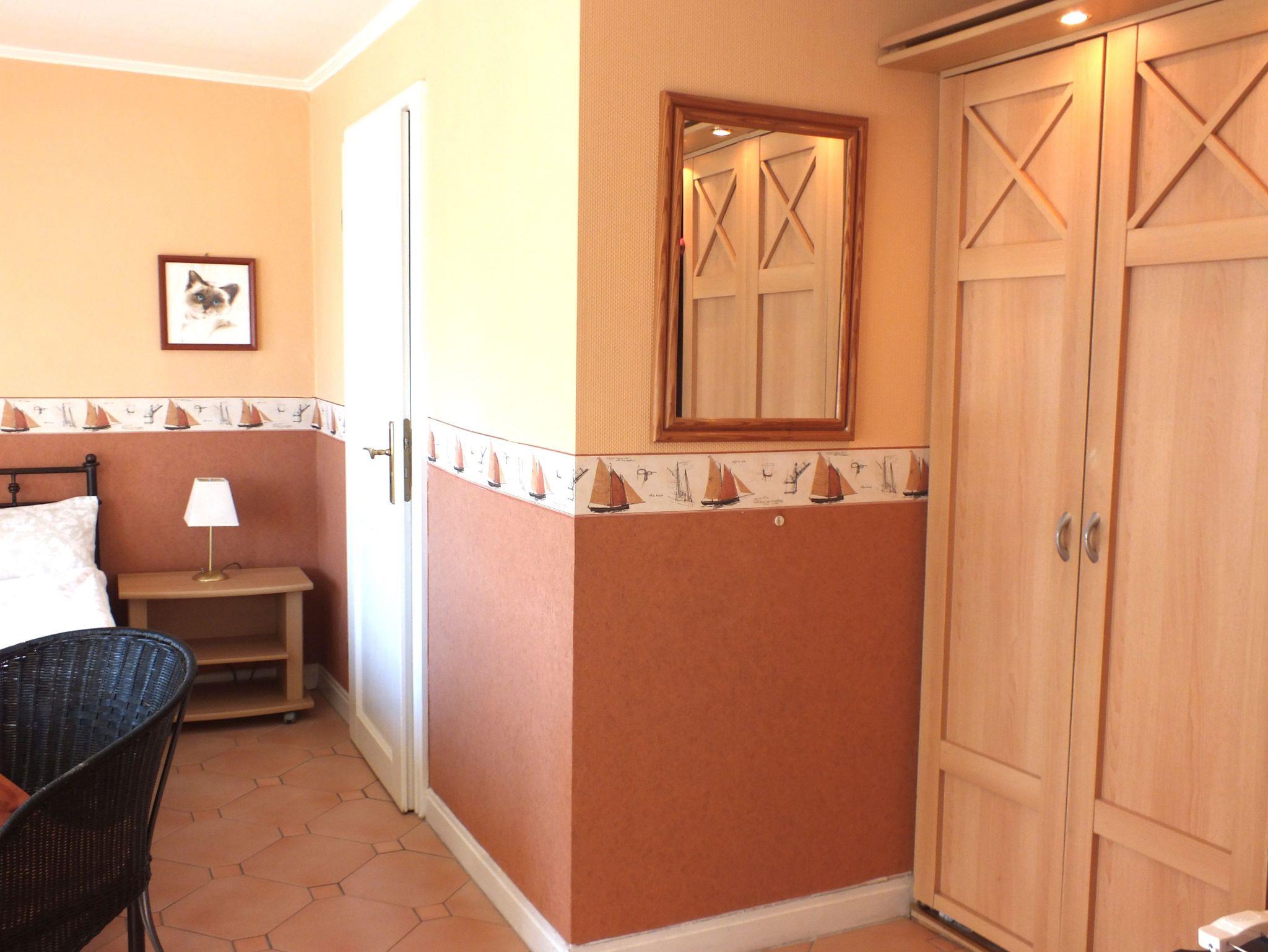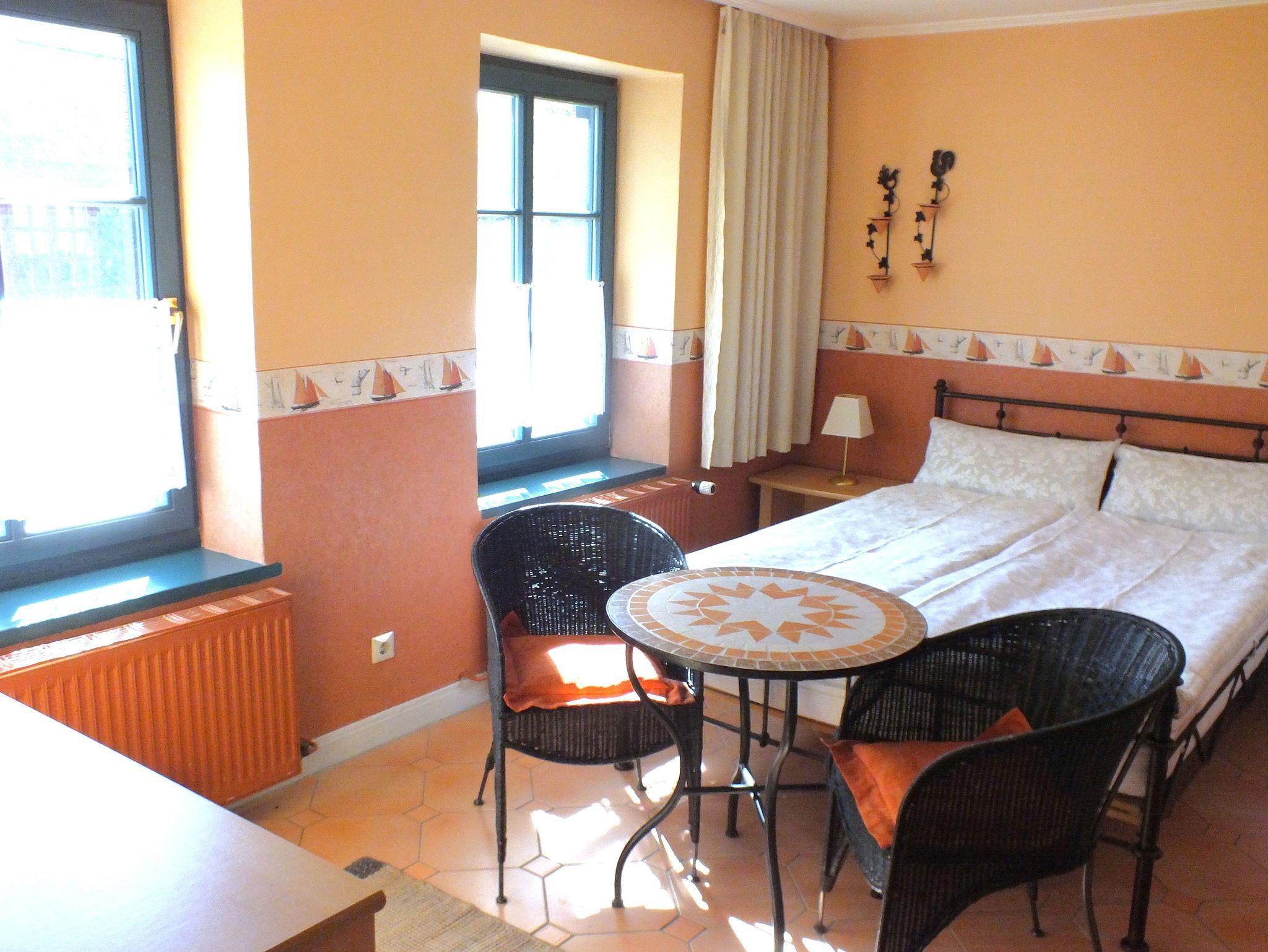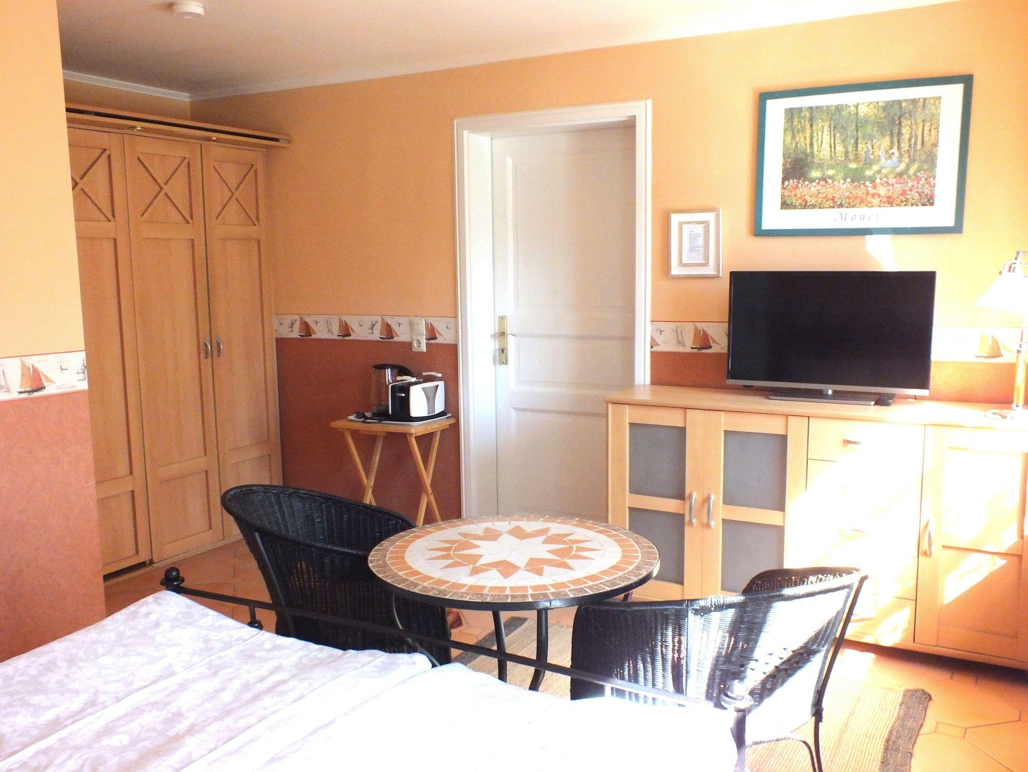 Unser Apartment, in dem Sie von der Morgensonne geweckt werden, beinhaltet alles für einen kochfreien Urlaub für ein bis zwei Gäste: ein schönes gefliestes Duschbad, WC und eine im Schrank integrierte kleine Teeküche mit Kühlschrank, Mini-Gefrierfach - Spüle - Geschirr - Kaffeemaschine ? Toaster ? Wasserkocher ? Spülmittel, optimal für eine Frühstückszubereitung. Desweiteren TV, Highboard, CD-Player, Bistrotisch mit Sesseln.