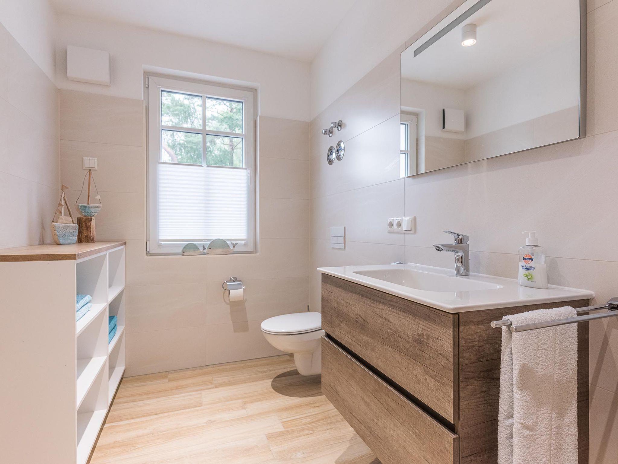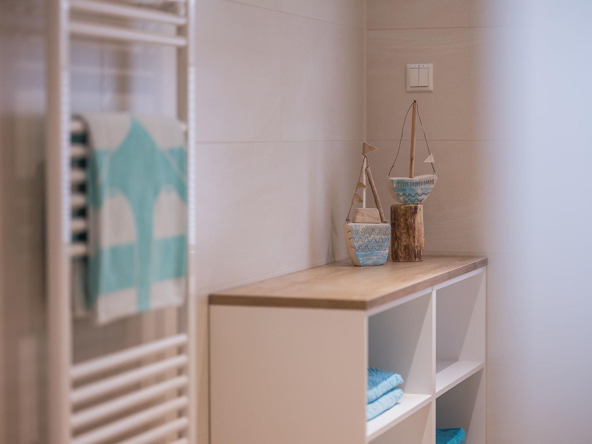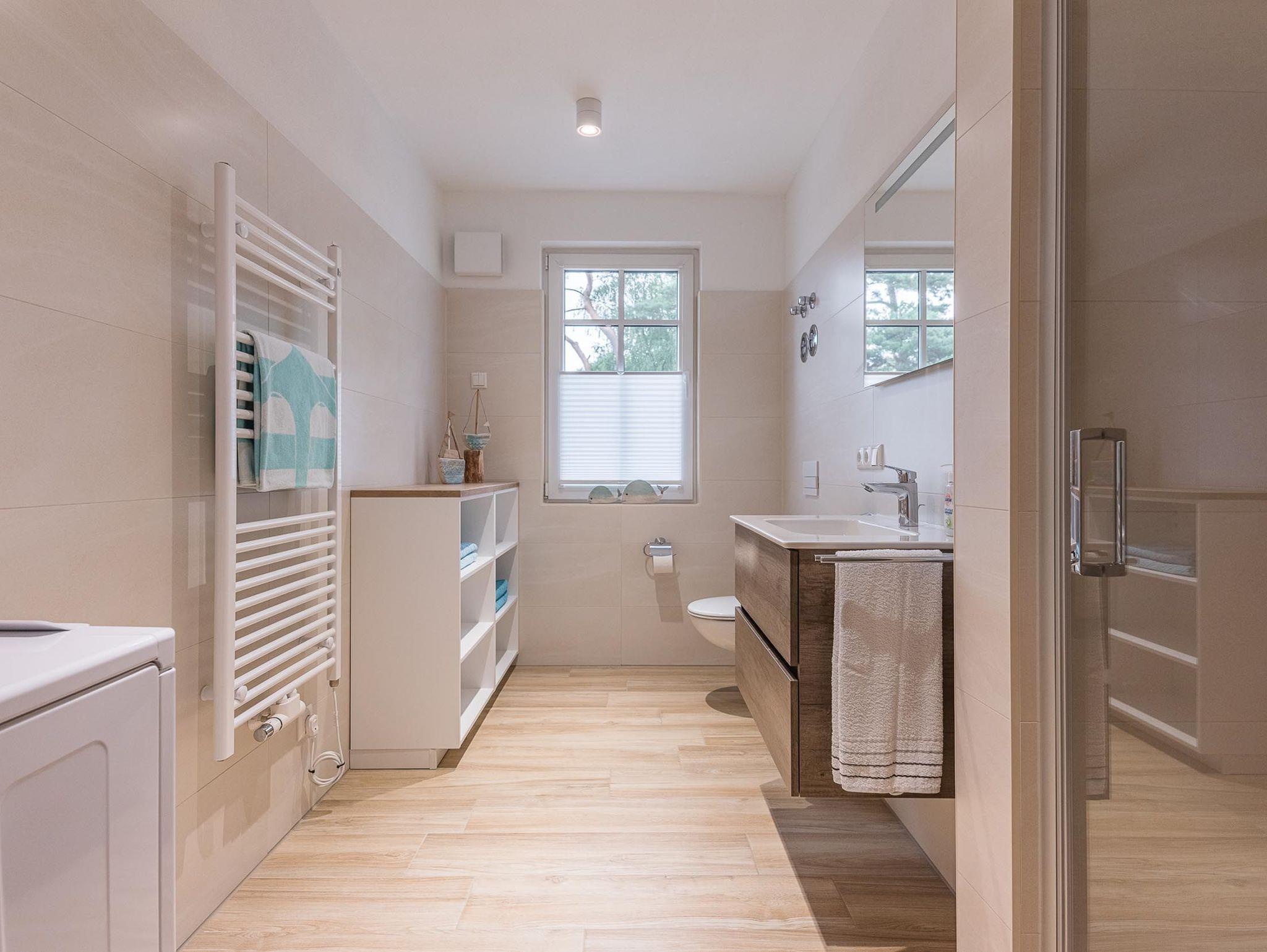 Das modern eingerichtete Badezimmer ist mit einer hochwertigen bodengleichen Dusche sowie einer Waschmaschine ausgestattet.