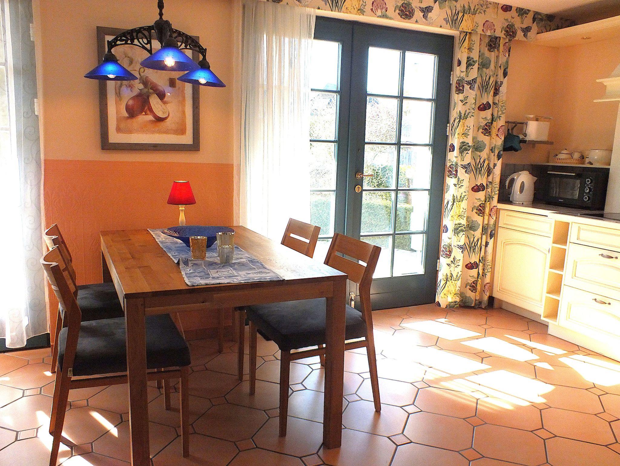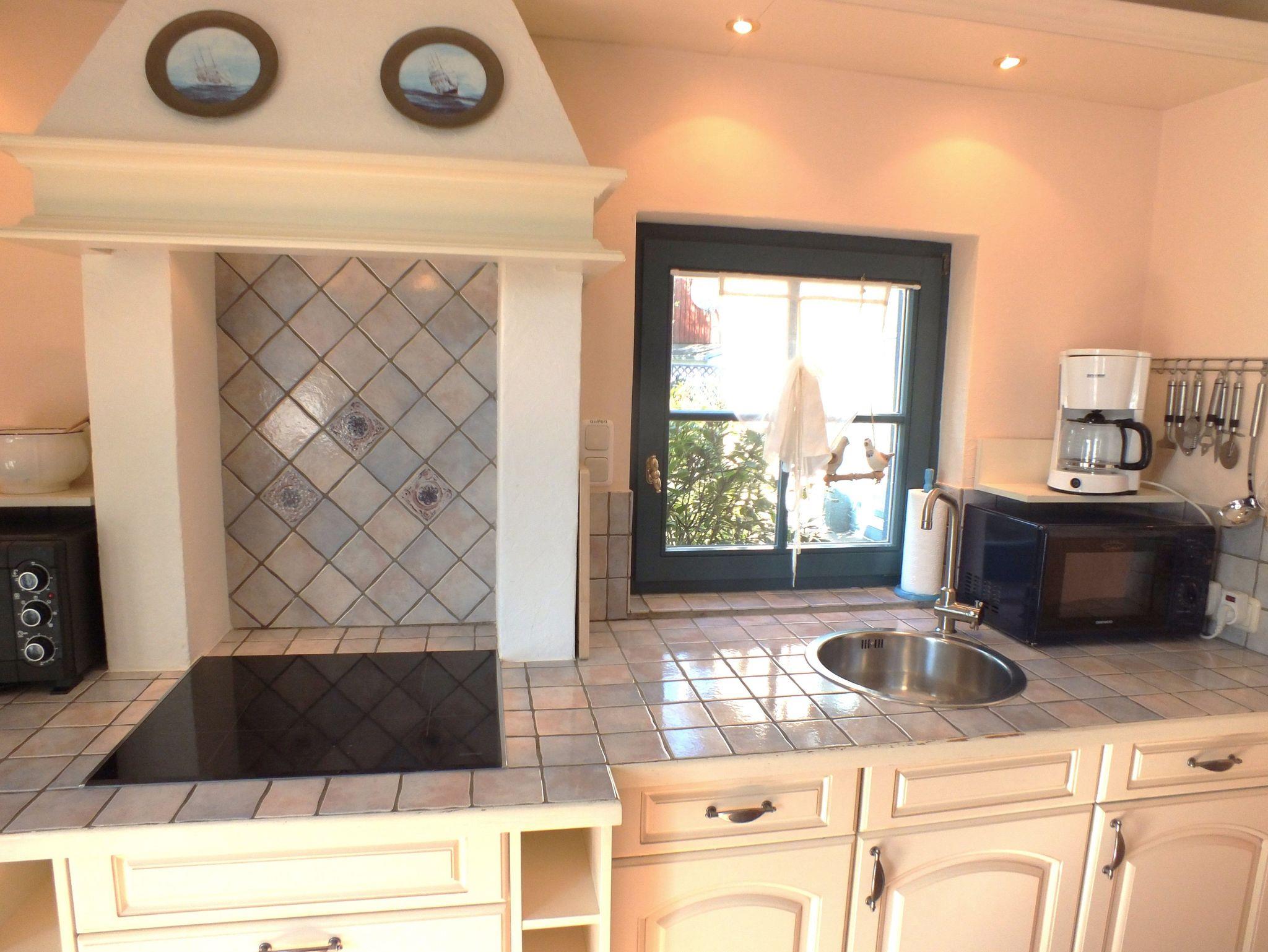 Unsere Ferienwohnung Käpt'n Blue empfängt Sie mit einer hellen, schmucken Wohnküche, von der aus Sie direkt auf die ungestörte Terrasse und in den schön eingewachsenen, gepflegten Garten gelangen. Auch hier haben wir ein offenes Wohnen bevorzugt, in dem Küchen-, Ess- und Wohnbereich ineinander übergehen. Vom Schlafzimmer mit Doppelbett (180 x 200) und gemütlicher Klön- und Lesecke haben Sie Zugang zum Bad mit einer geräumigen, gefliesten Dusche.