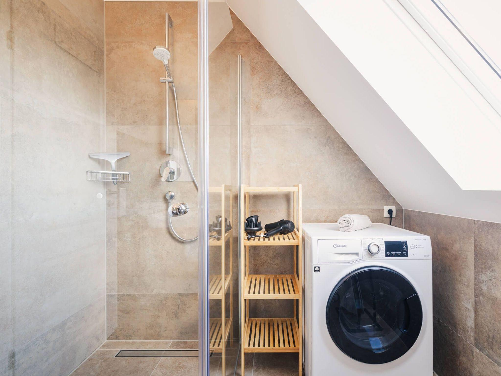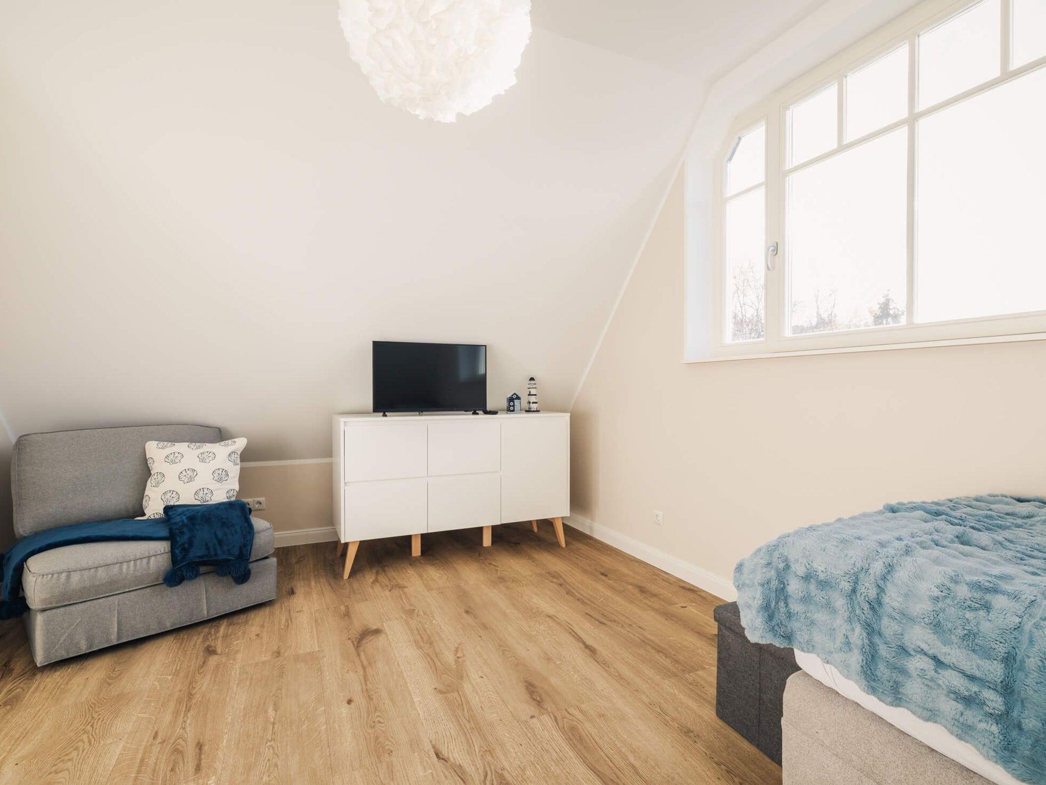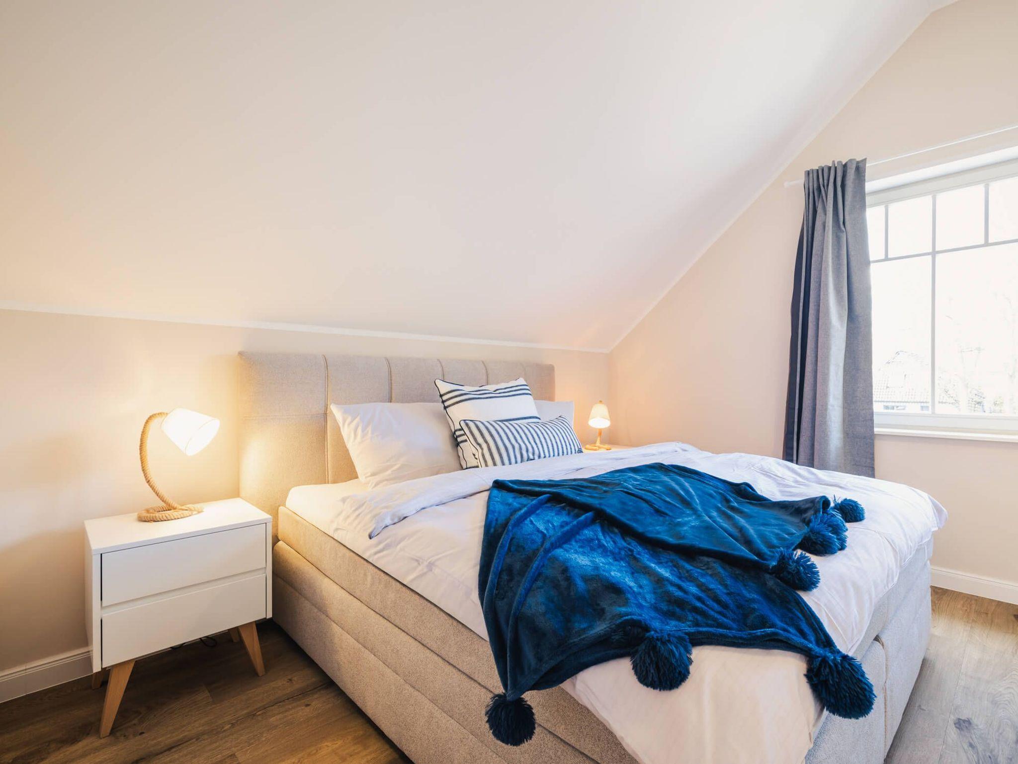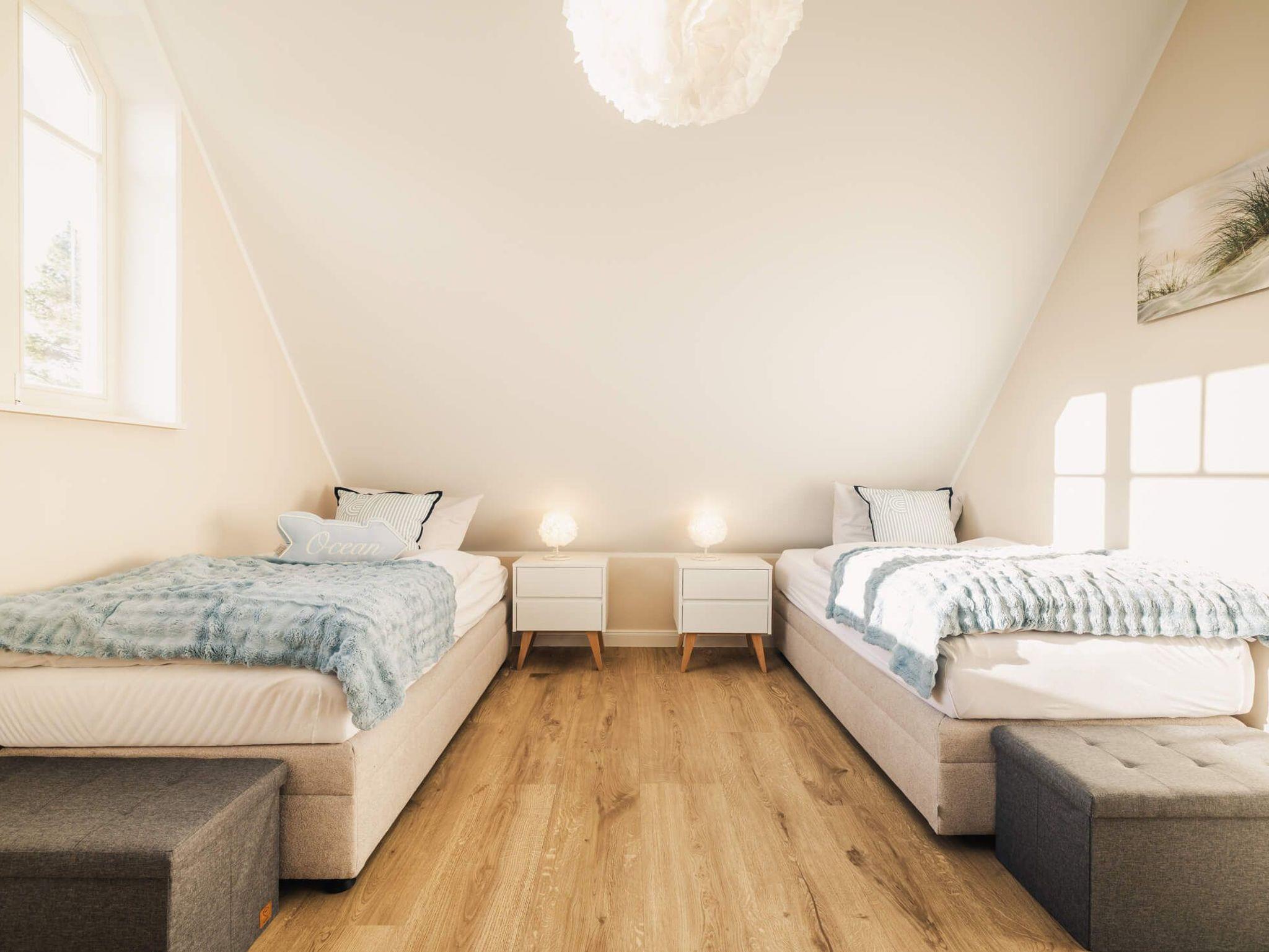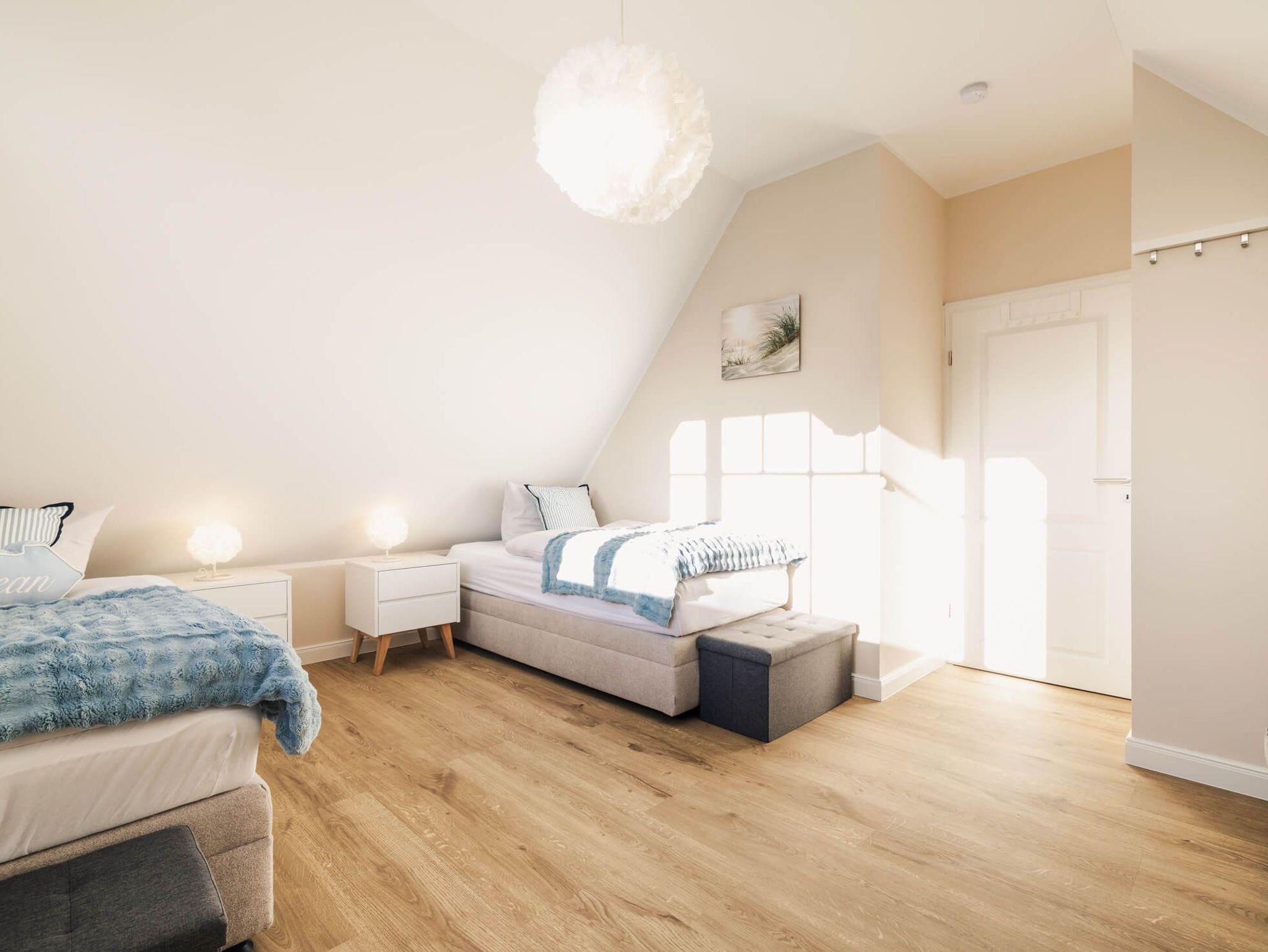 Die Wohnung verfügt über zwei separate Schlafzimmer. Das Hauptschlafzimmer ist mit einem Boxspring-Doppelbettausgestattet. Das zweite Schlafzimmer bietet flexible Schlafmöglichkeiten mit zwei Boxspring-Einzelbetten und einem komfortablen Schlafsessel für die 5. Person. Wohnzimmer und zweites Schlafzimmer verfügen über ein TV-Gerät. Eine moderne, voll ausgestattete Küche inkl. Nespressomaschine wartet auf Sie. Im Badezimmer befindet sich eine bodengleiche Dusche sowie ein Waschtrockner.