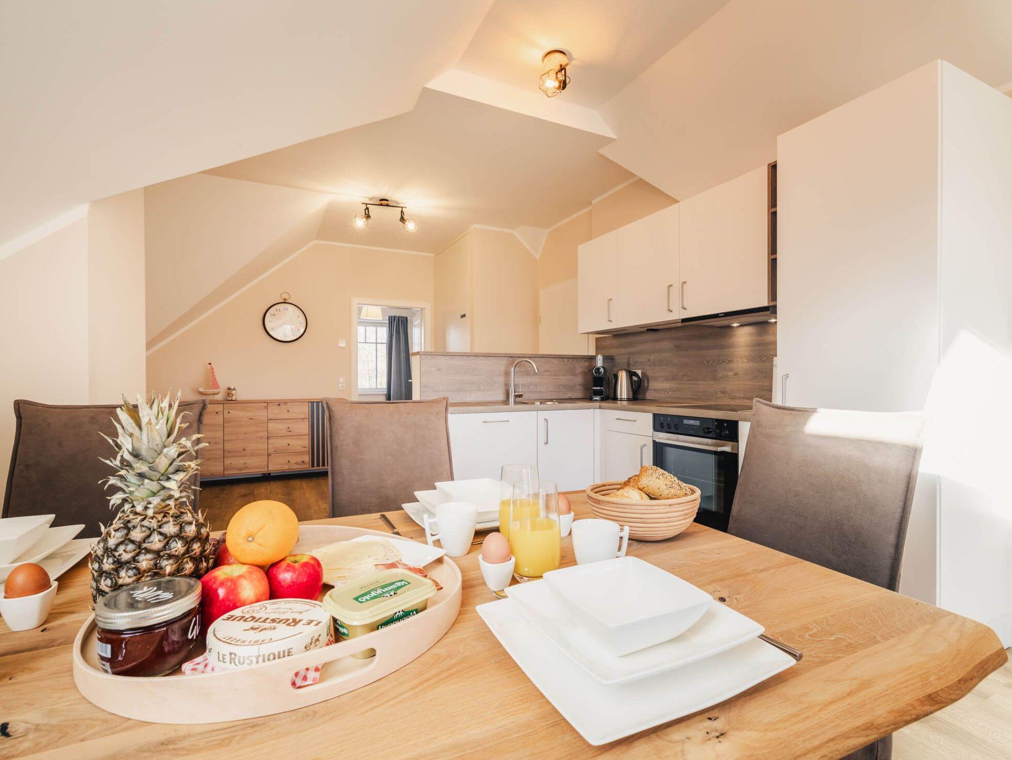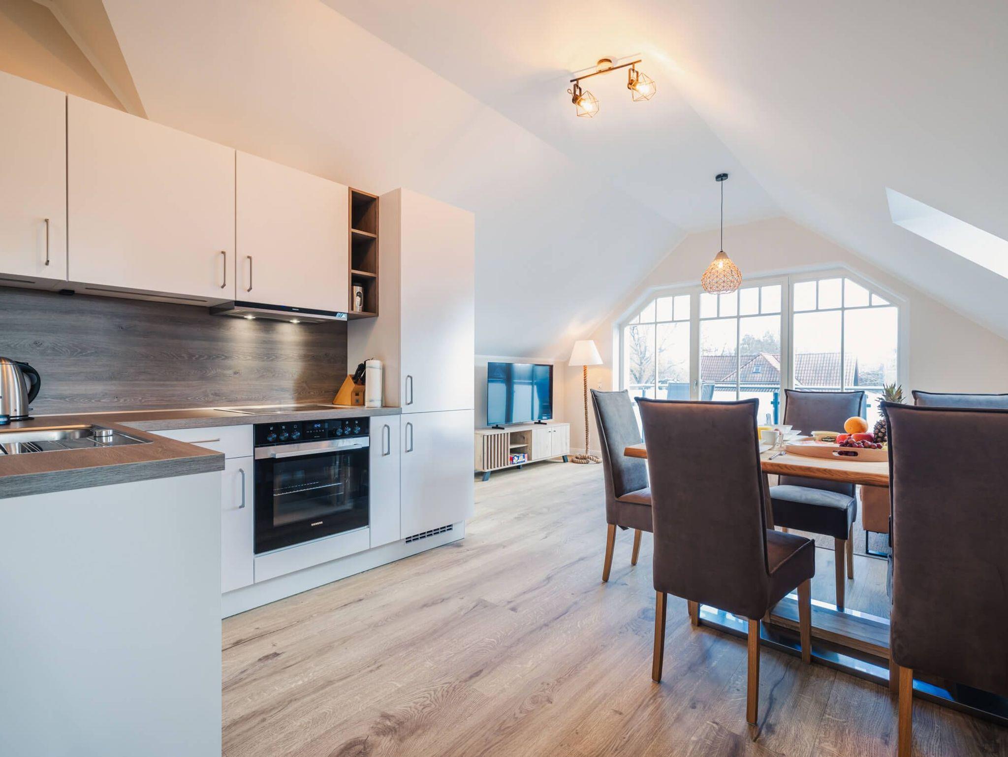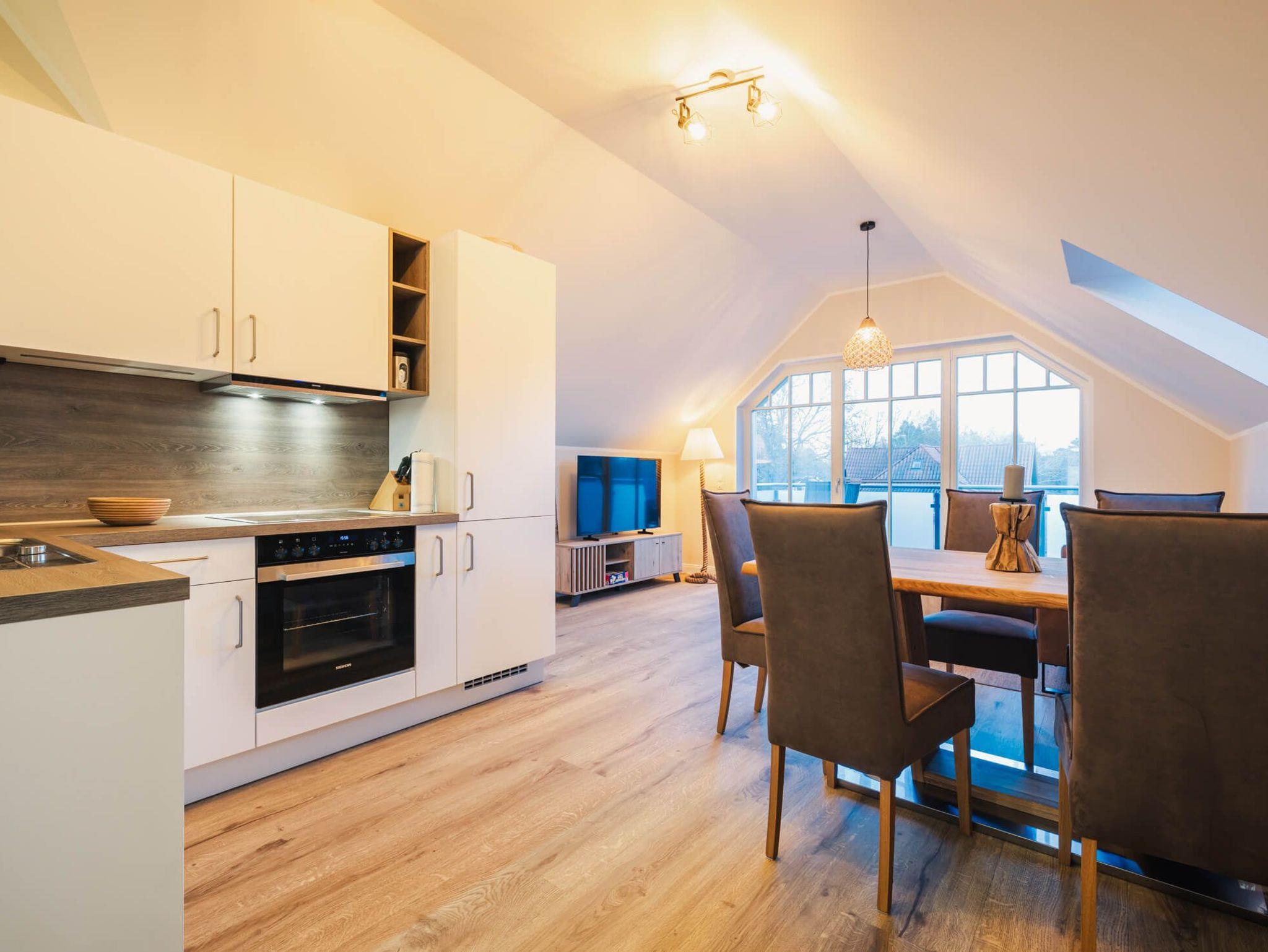Das lichtdurchflutete Apartment besticht durch eine einzigartige Loft-Atmosphäre. Der großzügige offene Wohn-, Ess- und Küchenbereich wird durch hohe Decken noch verstärkt. Das Design ist hell und freundlich, wobei viel Holz eine besonders gemütliche und moderne Wohlfühlatmosphäre kreiert.