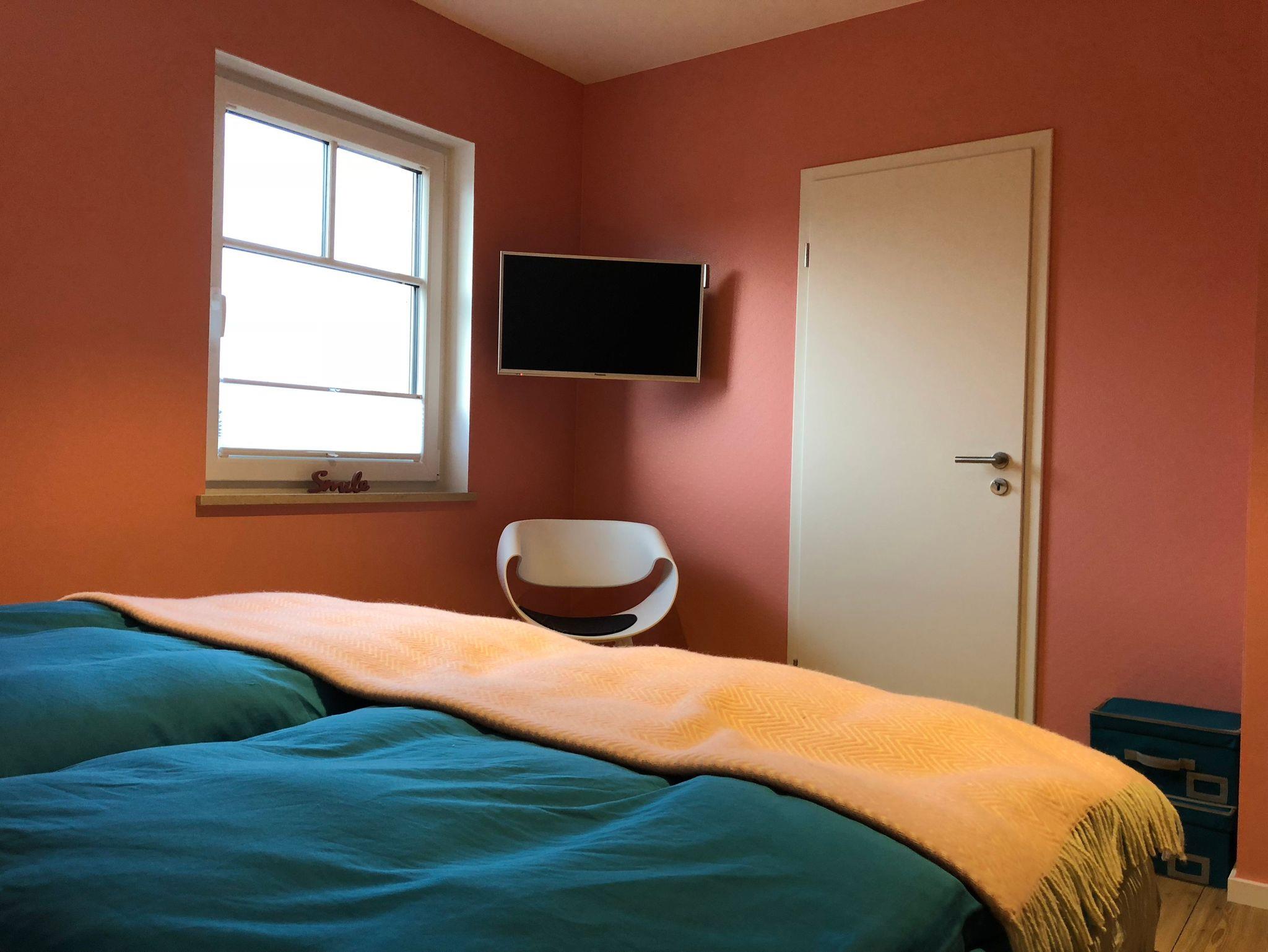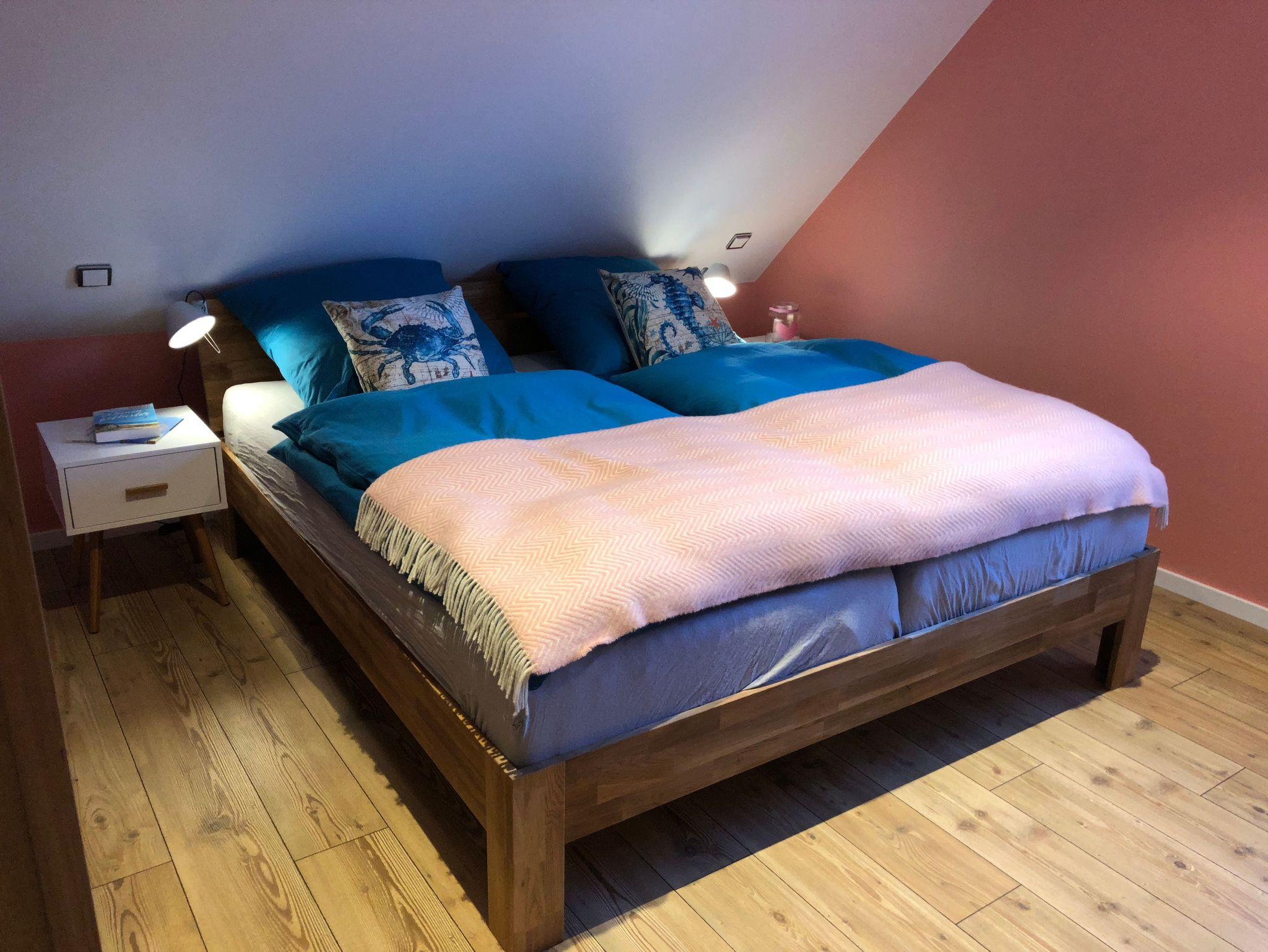 Im Obergeschoss finden Sie ein zweites Bad mit WC und großem Waschbecken sowie ein Raum mit Münz-Waschmaschine und integriertem Trockner. Die beiden separaten Schlafzimmer sind jeweils mit einem Smart-TV ausgestattet. Das eine Schlafzimmer bietet Ihnen ein großes Doppelbett, das zweite Schlafzimmer zwei Einzelbetten, die bei Bedarf zusammengeschoben werden können.