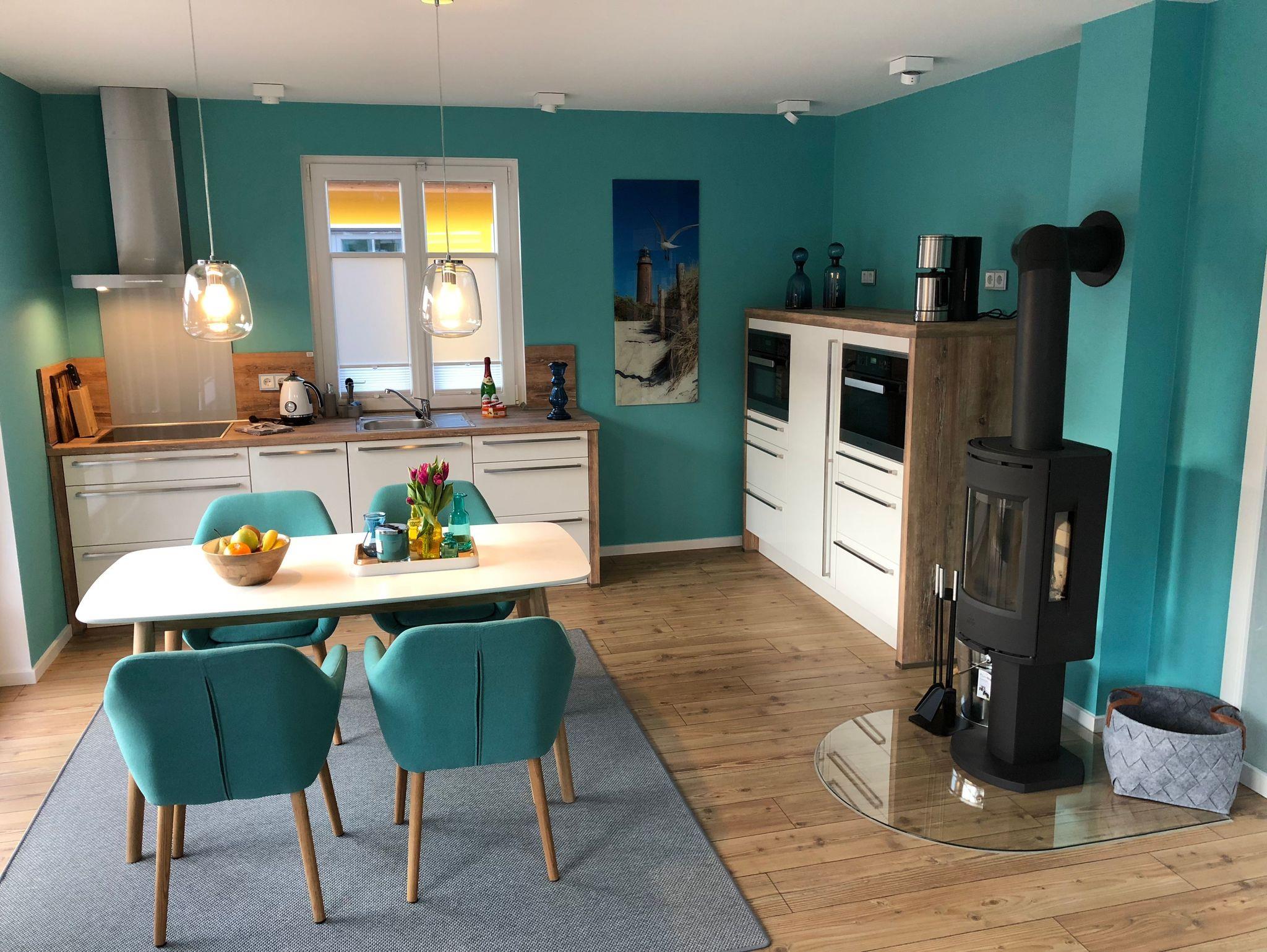 Das Erdgeschoss empfängt Sie mit einem lichtdurchfluteten Wohnbereich mit Sofalandschaft und Smart-TV, Esstisch und einer offenen Küche. An kalten Tagen können Sie es sich an einem Holzkamin gemütlich machen und an warmen Tagen die große Holzterrasse oder den Garten nutzen.