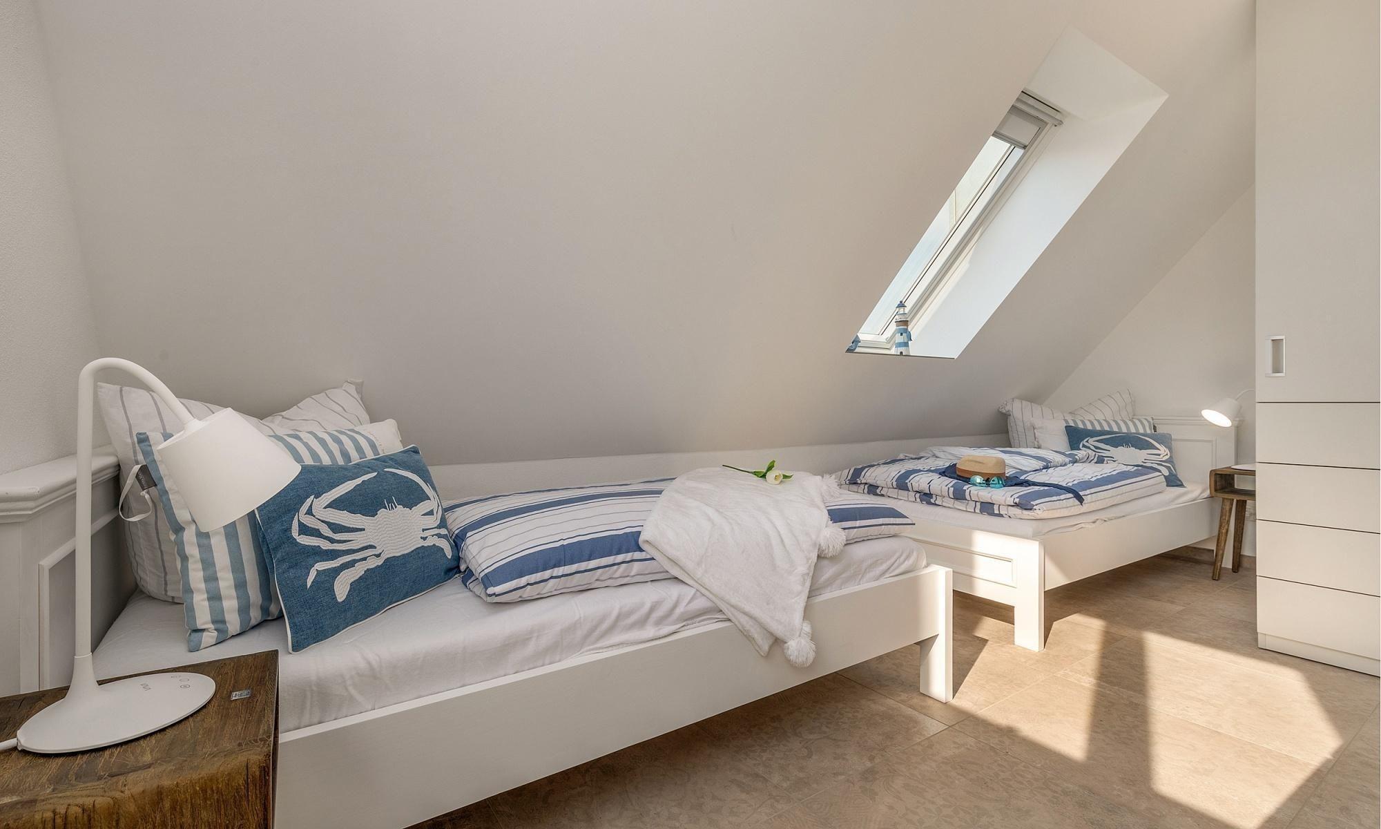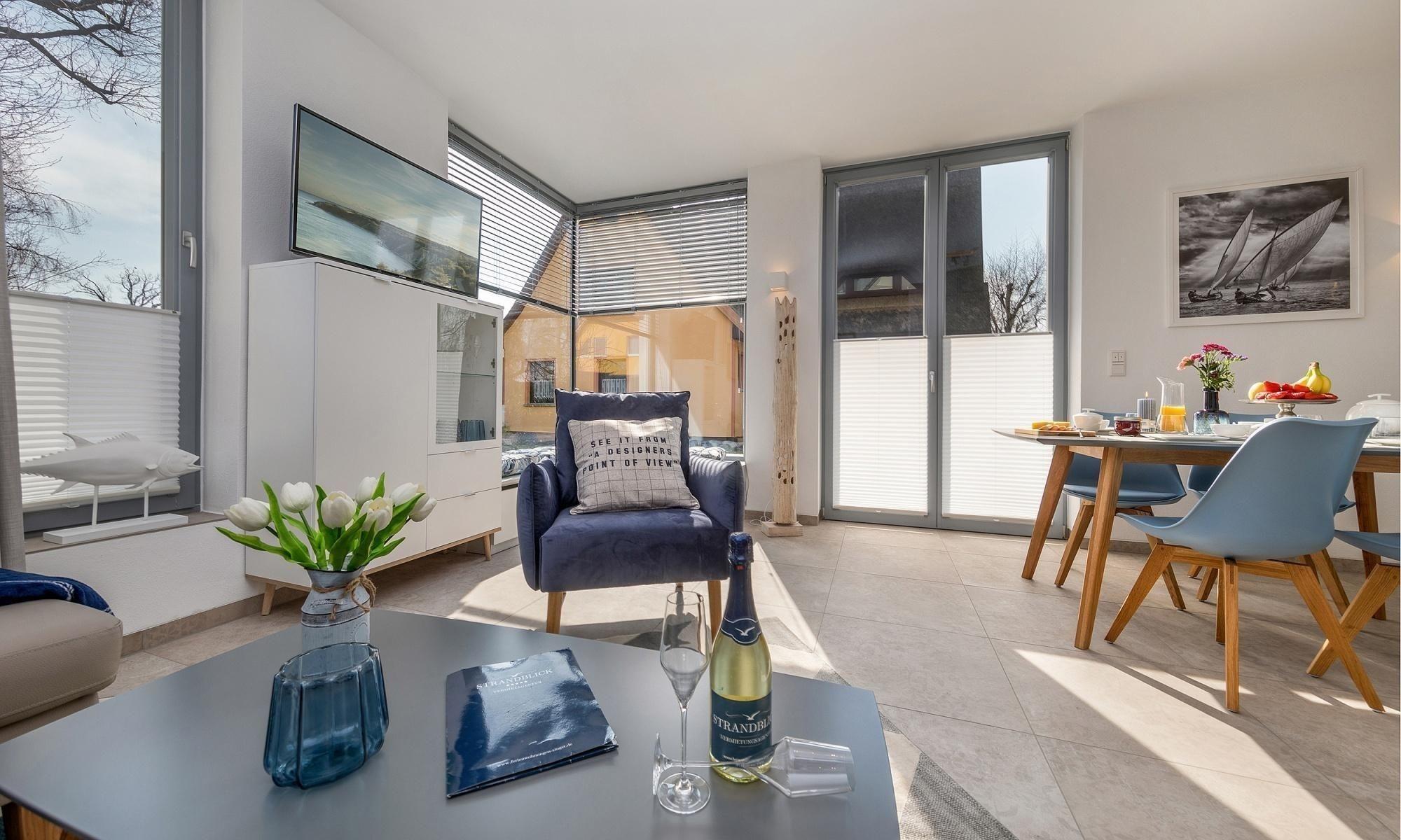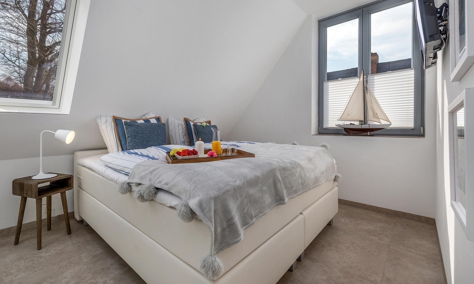 Insgesamt verfügt die Wohnung über zwei Schlafzimmer: eines mit einem luxuriösen Boxspringbett (180x200 cm) und das zweite mit zwei Einzelbetten (90x200 cm), jeweils mit TV. Ein stilvolles Badezimmer mit bodengleicher Dusche sowie ein Gäste-WC sorgen für zusätzlichen Komfort.