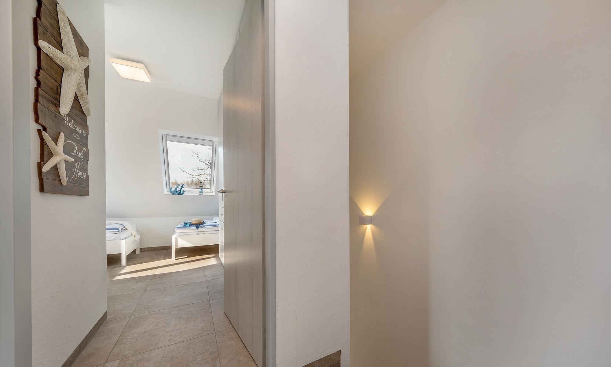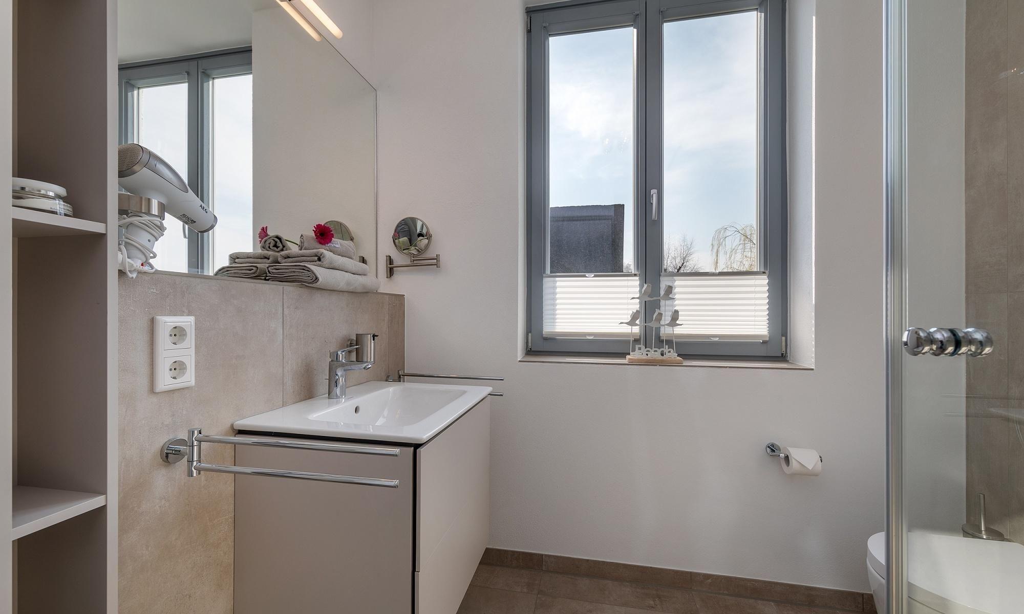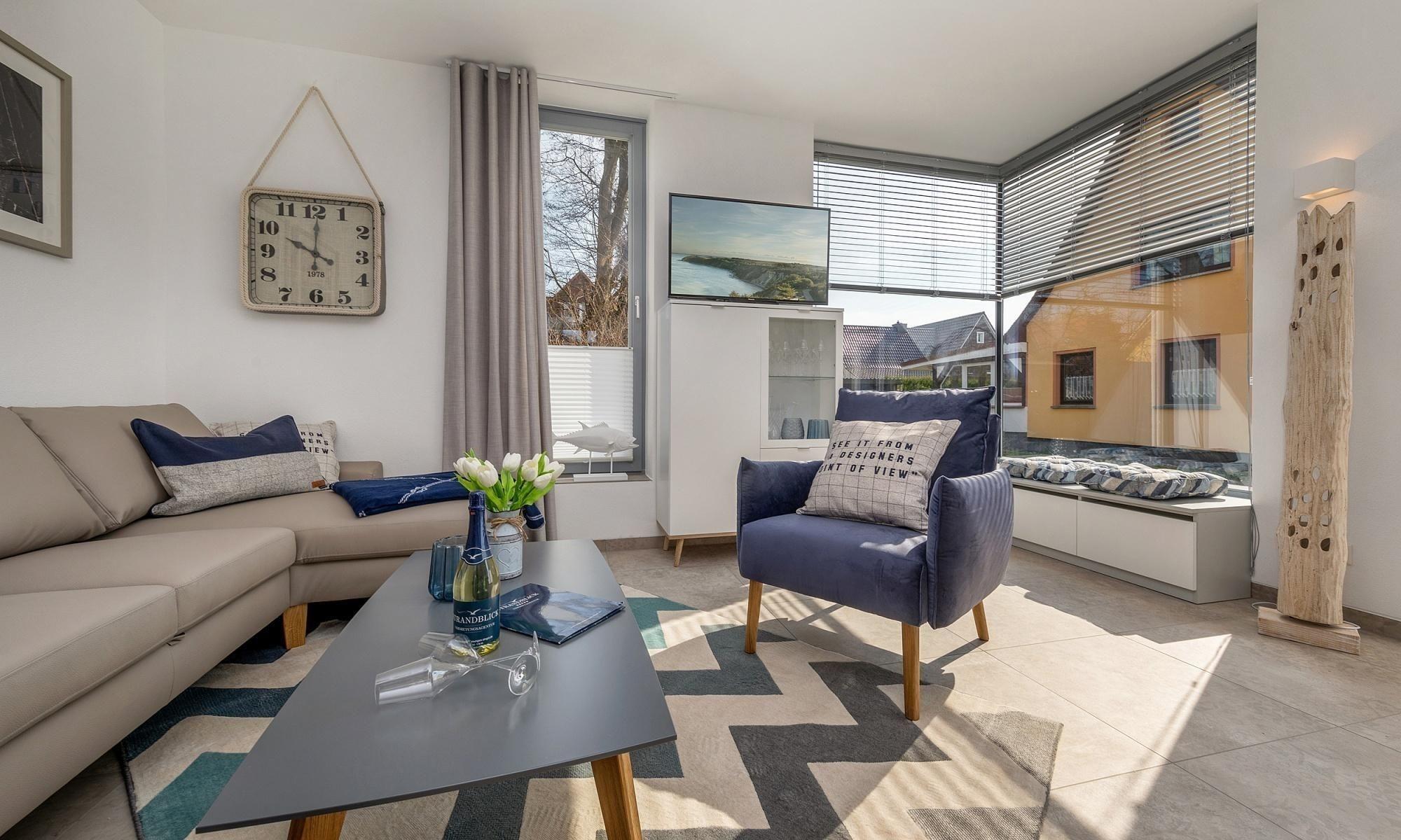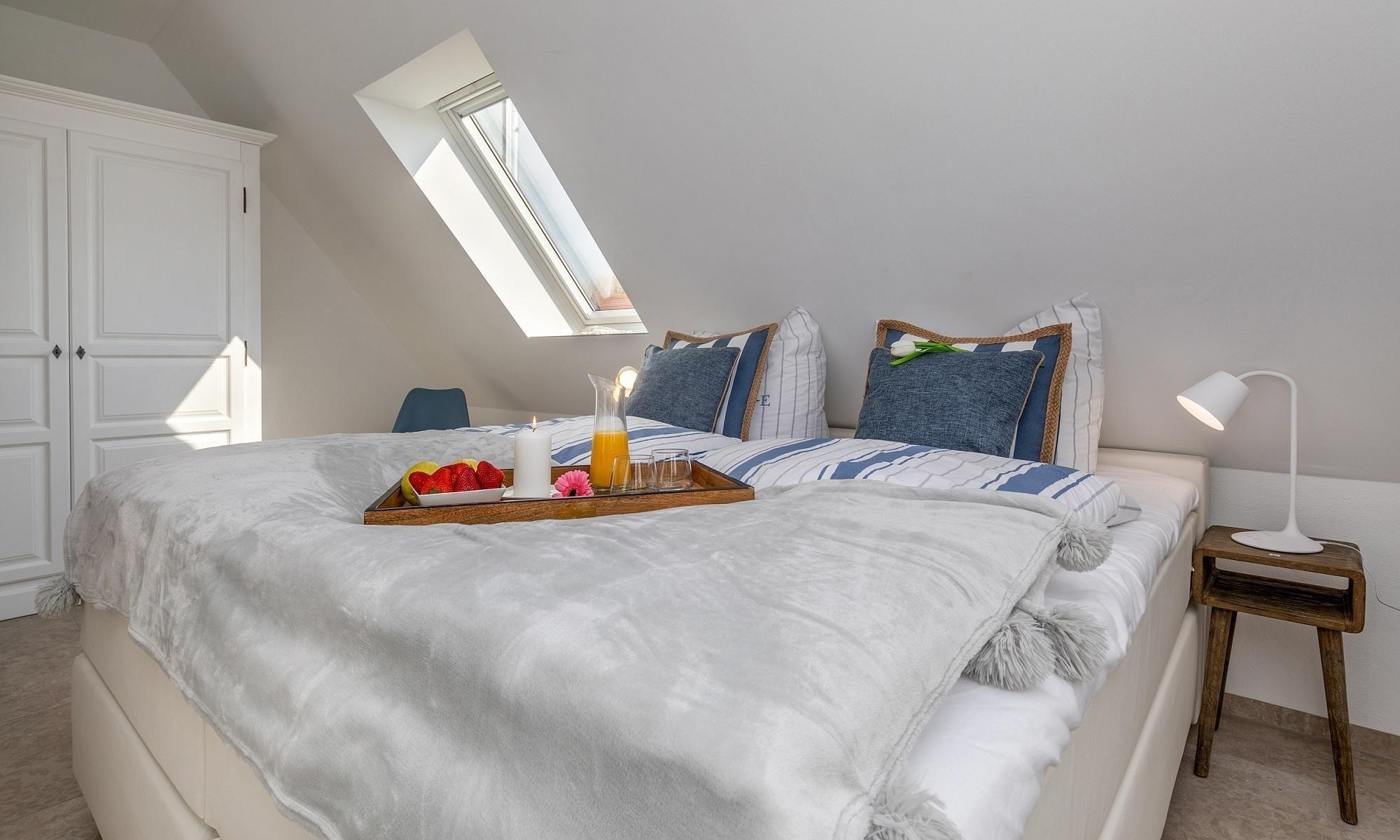 Insgesamt verfügt die Wohnung über zwei Schlafzimmer: eines mit einem luxuriösen Boxspringbett (180x200 cm) und das zweite mit zwei Einzelbetten (90x200 cm), jeweils mit TV. Ein stilvolles Badezimmer mit bodengleicher Dusche sowie ein Gäste-WC sorgen für zusätzlichen Komfort.