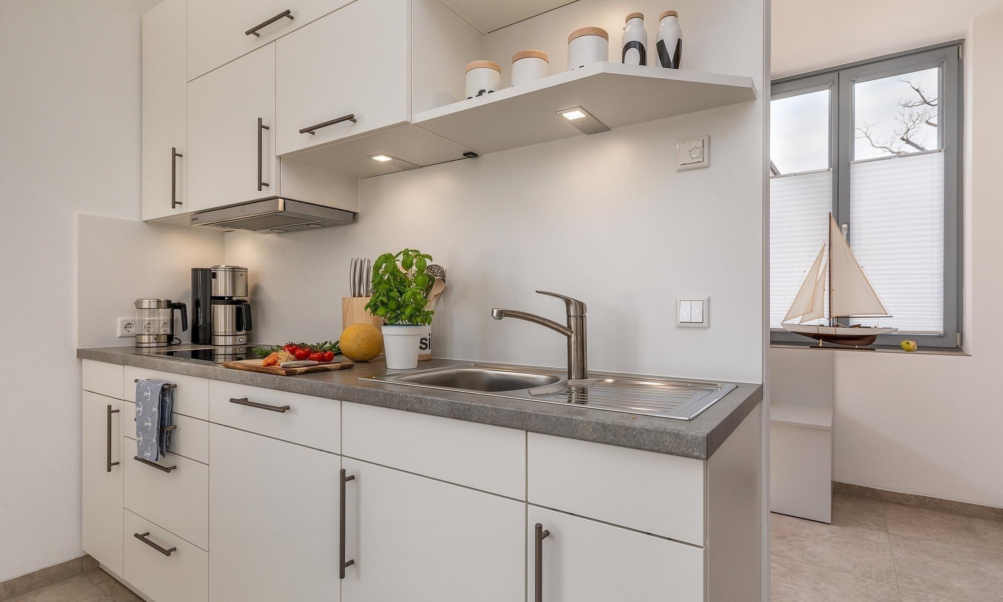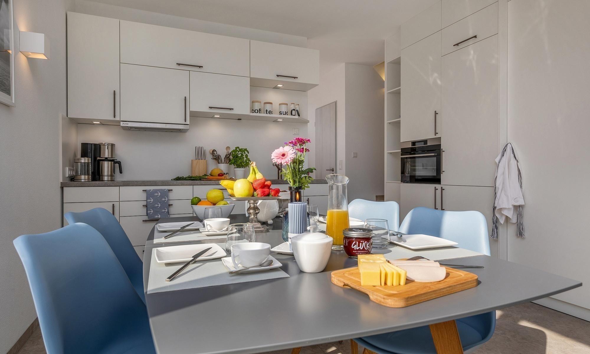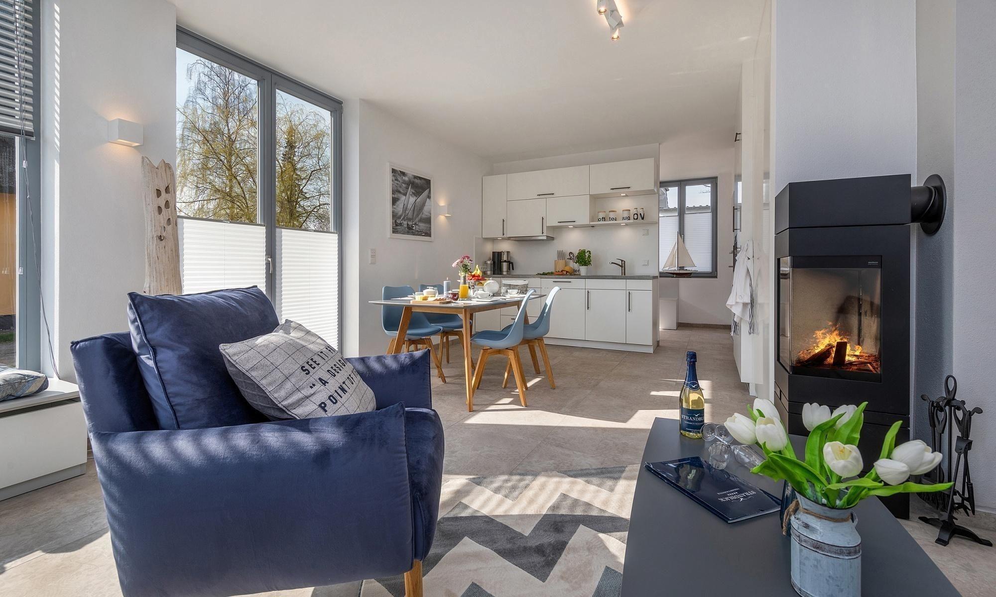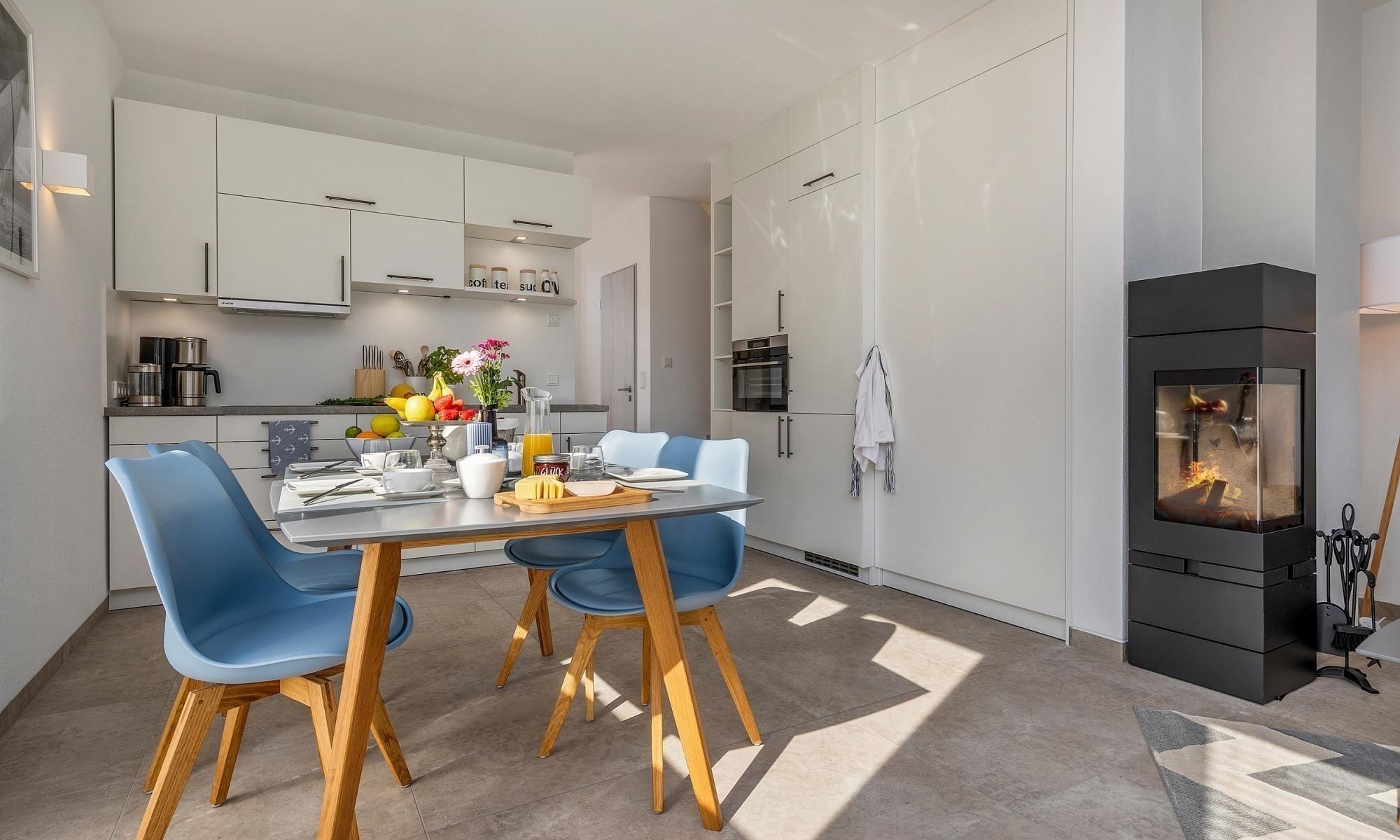Diese komfortable Ferienwohnung bietet eine großzügige, offene Wohnküche, die mit modernem Geschirrspüler, Elektro-/Gasherd, Backofen, Kühlschrank, Kaffeemaschine und Toaster ausgestattet ist. Der Essbereich lädt zu gemütlichen gemeinsamen Mahlzeiten ein. Das lichtdurchflutete Wohnzimmer begeistert mit einem einladenden Kamin sowie einer Schlafcouch, ideal für einen Erwachsenen oder zwei kleine Kinder.