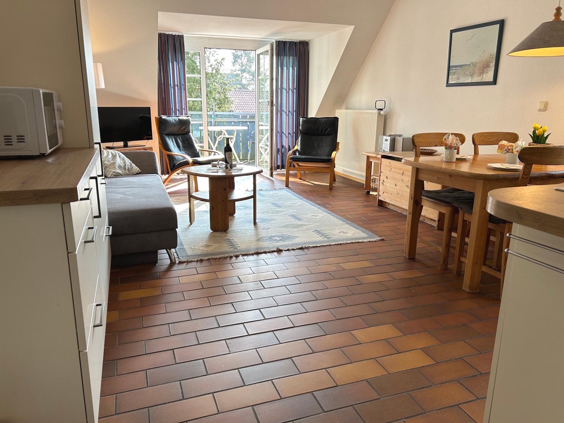 2 Zimmer ca. 50 qm für1-4 Personen, 1. OG im Gästehaus Kormoran, Waldstraße 64 b, Ostseebad Prerow. Wohnzimmer mit Schafcouch, Sitzgarnitur, SAT-TV/Radio, WLAN, Esstisch, moderner Küchenzeile mit Backofen, Ceranfeld, Spülmaschine; Schlafzimmer mit Doppelbett, Dusche/WC, Gäste-WC, Süd-West-Balkon.