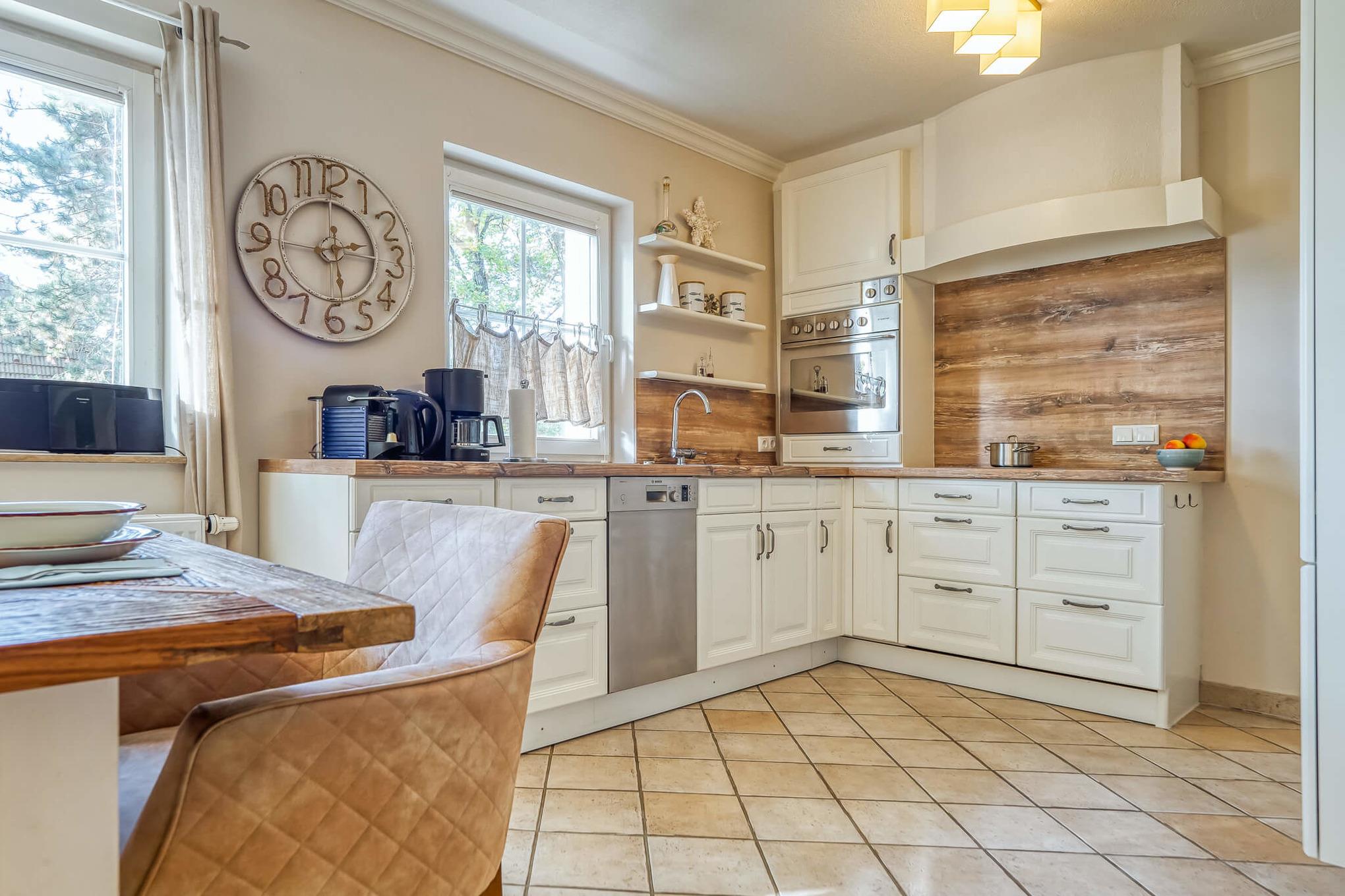 Der gut ausgestattete Küchenbereich mit Induktionsherd, Backofen, Geschirrspüler, Mikrowelle und Kühlschrank bietet jeglichen Komfort einer modernen Küche. Es gibt sowohl eine Nespresso-Kapsel-Maschine also auch eine Filter-Kaffeemaschine. In der Abstellkammer steht eine Waschmaschine zur kostenfreien Nutzung. Ebenfalls auf dieser Wohn-Etage befindet sich das Haupt-Schlafzimmer mit einem Doppelbett und Kleiderschrank. Im Bad gibt es eine geräumige Dusche, einen Waschtisch mit Spiegel und ein WC. Vom kleinen Balkon aus können Sie einen Blick in die Abendsonne genießen.