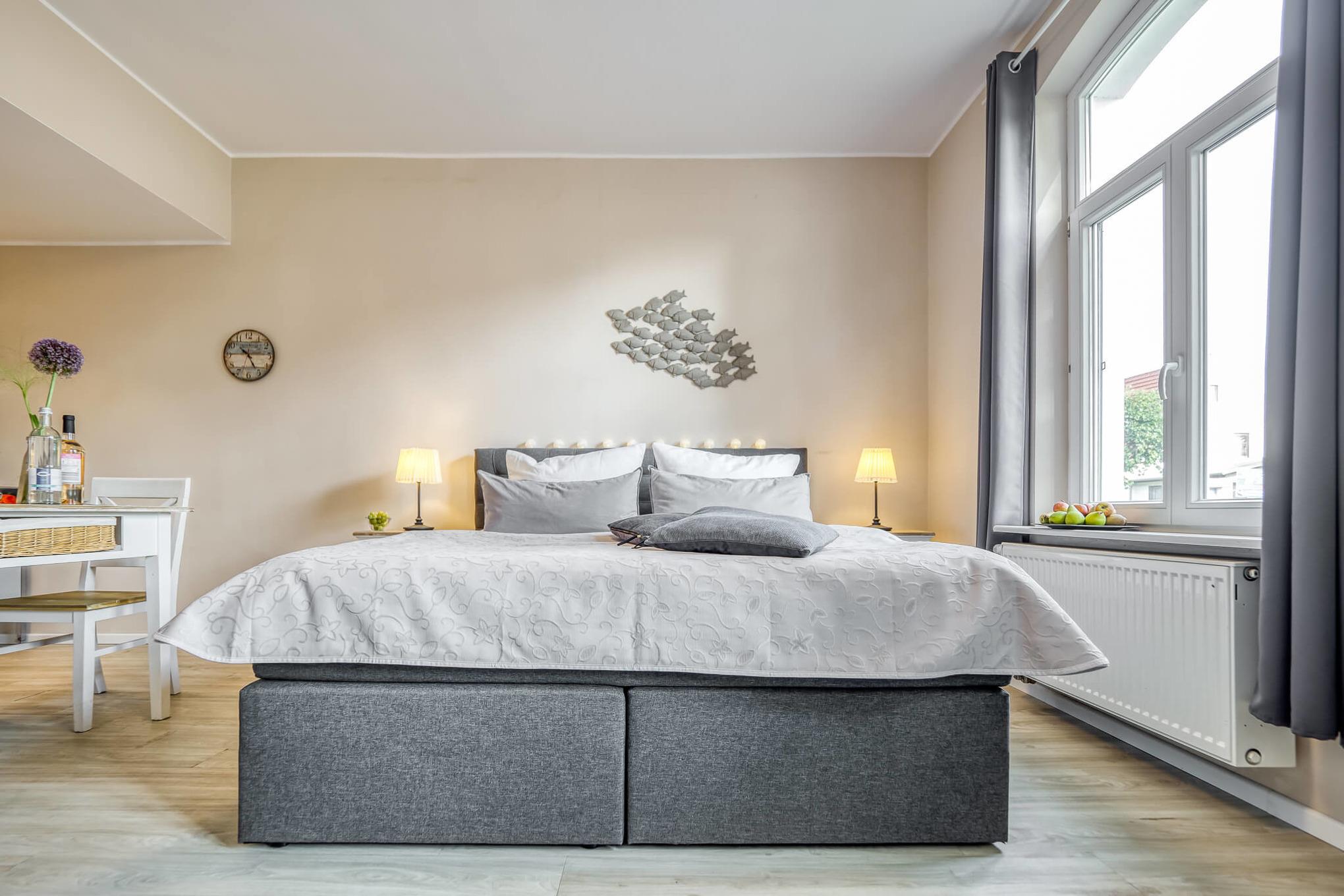 Die Ferienwohnung verfügt über ein gemütlichen, sonnigen Wohn- Schlaf- und Essraum, mit einem Boxspringbett Größe 180 x 200 cm, einem Esstisch für zwei Personen und zwei Sessel mit TV sowie und einem Bad mit Dusche.