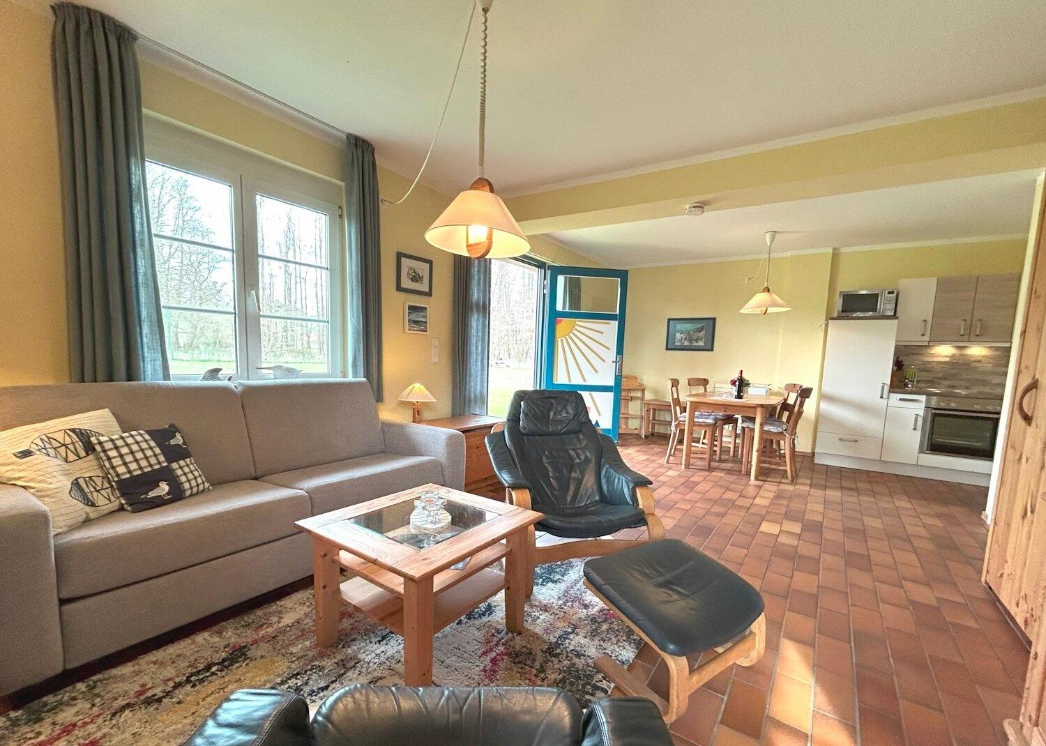 2 Zimmer ca. 54 qm, EG im Haus L, Residenz Kormoran, Grüne Straße 45A-R, Ostseebad Prerow, für 1-4 Personen. Wohnzimmer mit Schlafcouch, WLAN, Sitzgarnitur, SAT-TV/Radio, Esstisch, Küchenzeile, Schlafzimmer, Dusche/WC, extra WC, Terrasse