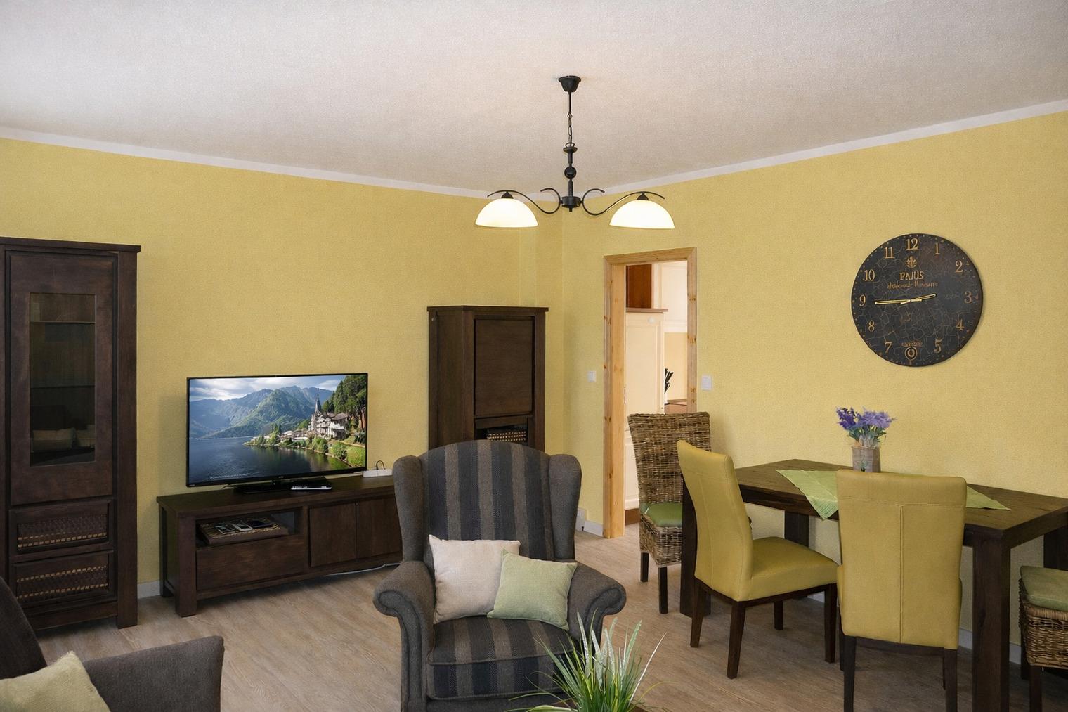 Unsere Ferienwohnung verfügt über zwei komfortable Schlafzimmer, jeweils mit einem gemütlichen Doppelbett. Das geräumige Wohnzimmer lädt zum Verweilen ein und bietet eine behagliche Atmosphäre zum Entspannen. Die hochwertige Küche ist voll ausgestattet und bietet alles, was Sie zum Kochen und Genießen benötigen. Ein Kinderhochstuhl und ein Babybett stehen für unsere kleinen Gäste zur Verfügung. Das moderne Badezimmer mit Dusche und Bidet sorgt für zusätzlichen Komfort während Ihres Aufenthalts.