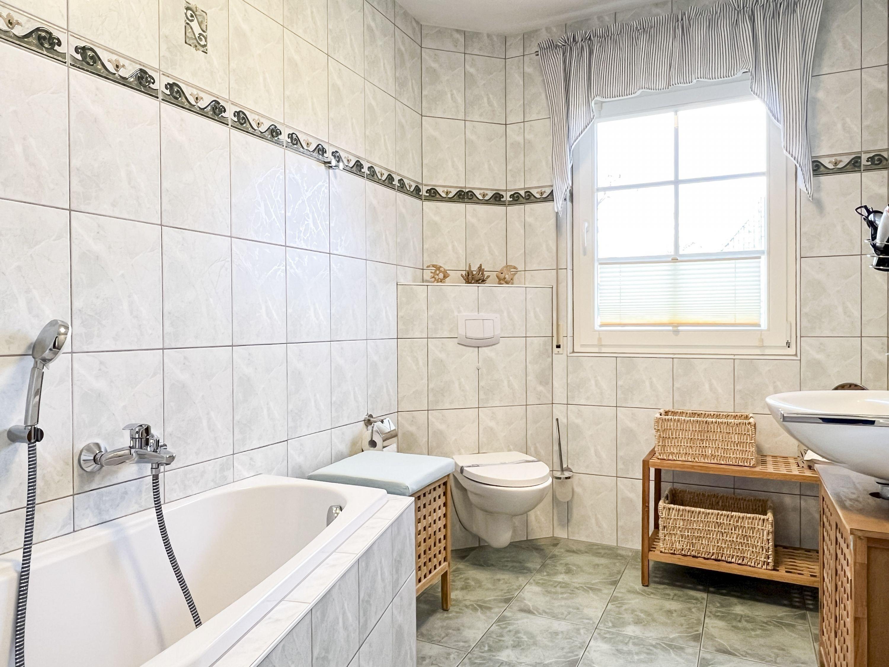 Badezimmer: Zwei moderne Bäder, eines mit Badewanne/WC, das andere mit Dusche/WC, jeweils mit Handtuchtrockner und Haartrockner