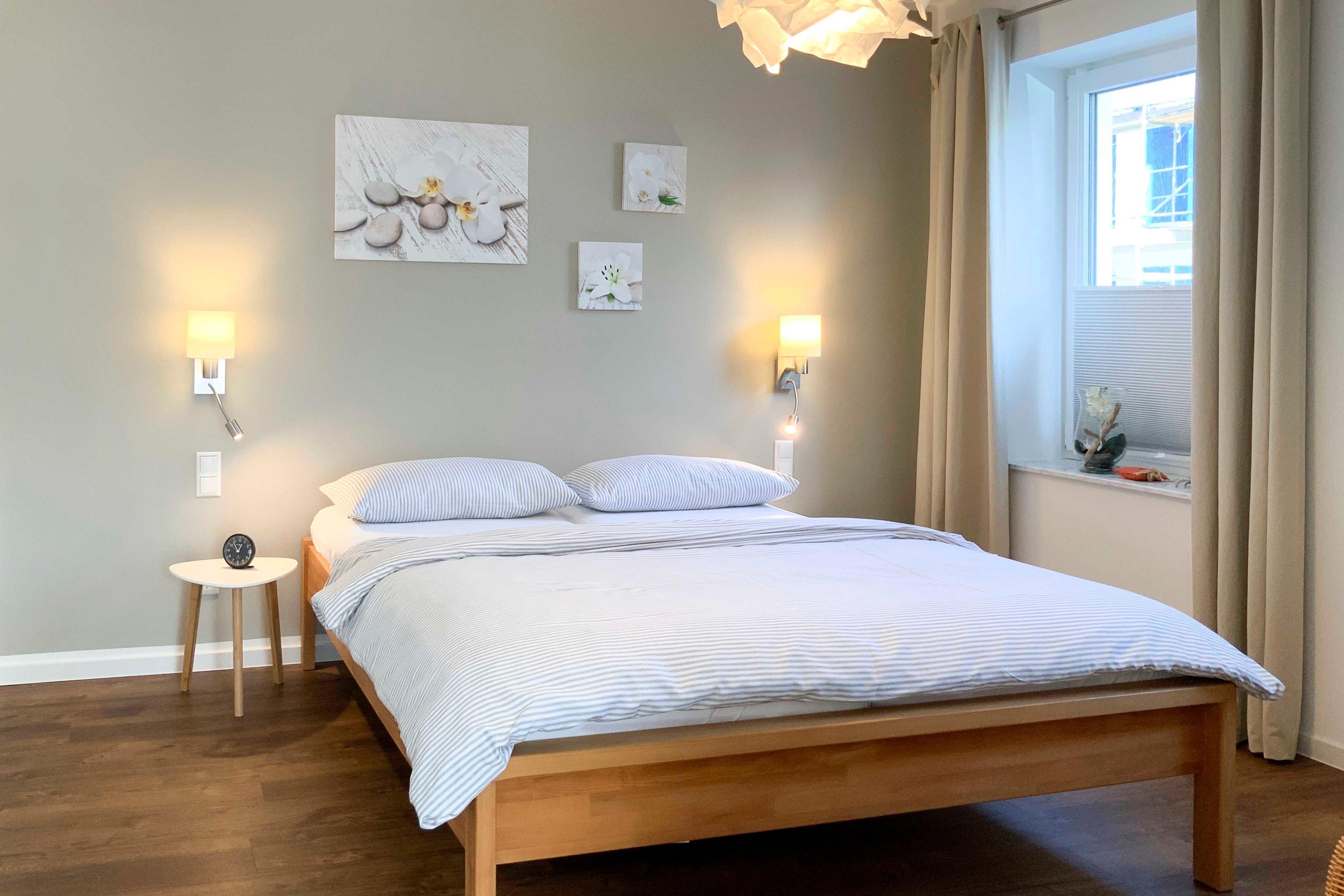 Schlafzimmer: Gemütliches Doppelbett (160 x 200 cm) und ein Schlafsofa im Wohnbereich