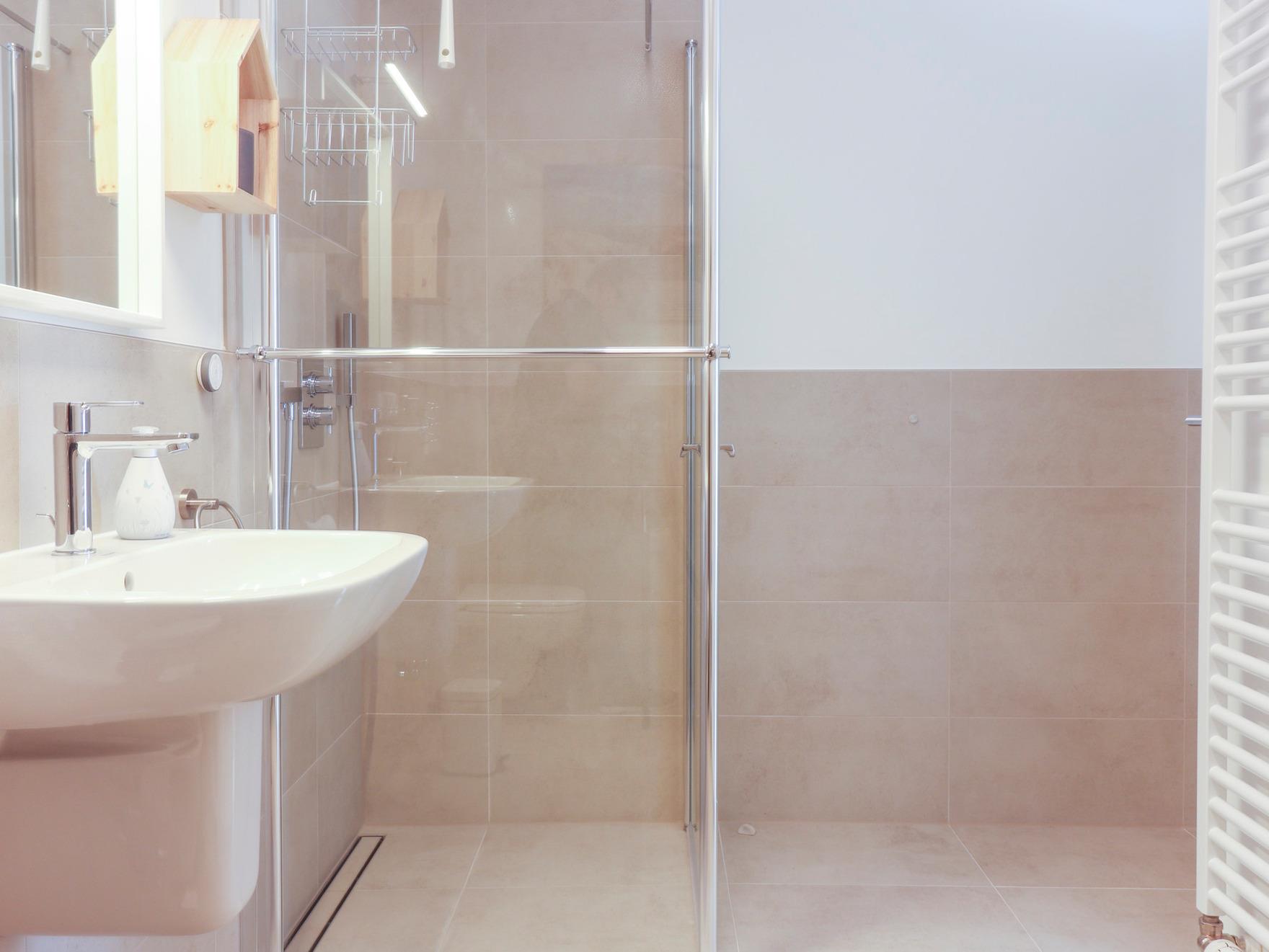 Badezimmer: Modernes Bad mit ebenerdiger Regendusche, Fußbodenheizung und Haartrockner