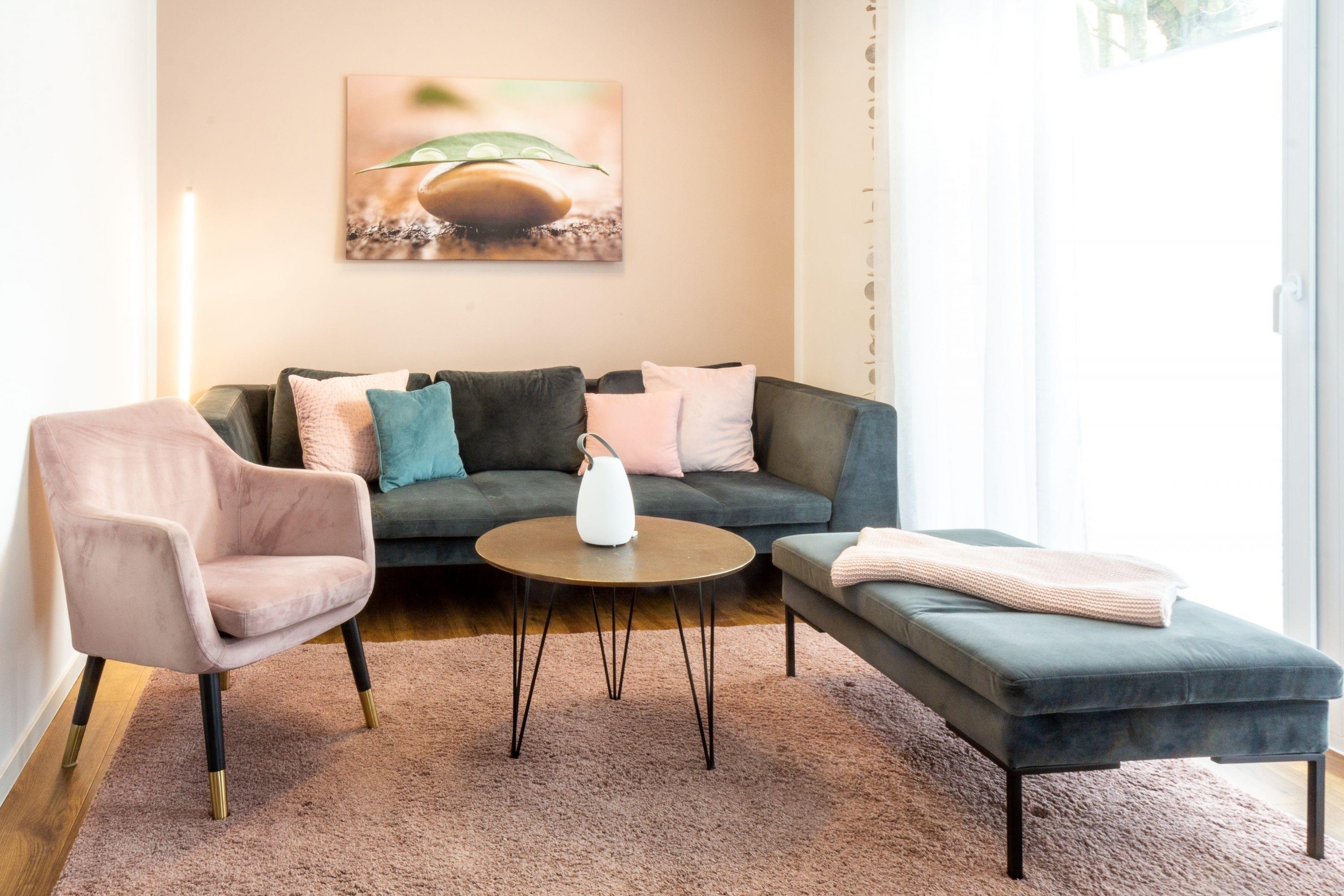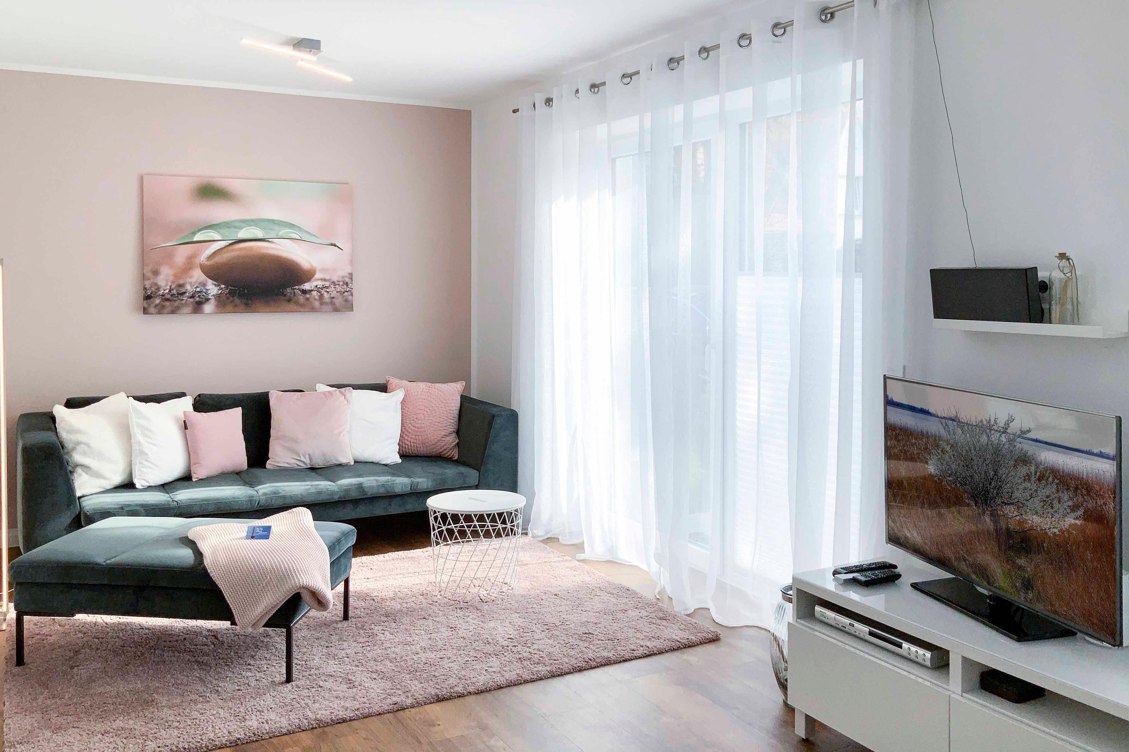 Wohnbereich: Heller Wohnraum mit bequemer Couch, Flachbild-TV, DVD-Player, HiFi-Anlage und Radio