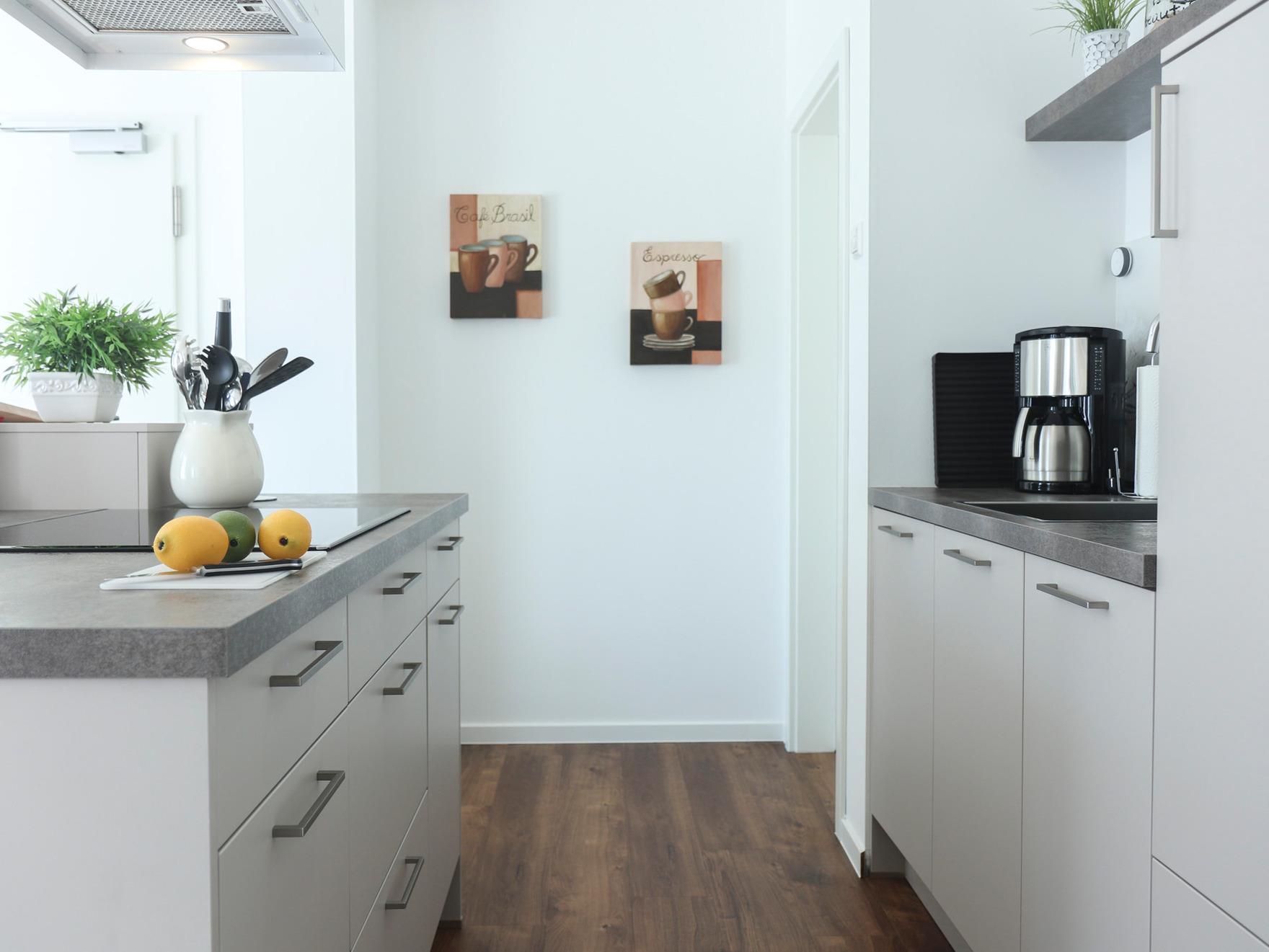 Küche: Voll ausgestattete Küchenzeile mit Kochinsel, Backofen, Kochfeld, Spülmaschine, Kühlschrank, Filterkaffeemaschine, Toaster, Wasserkocher, Küchenmixer und Eierkocher