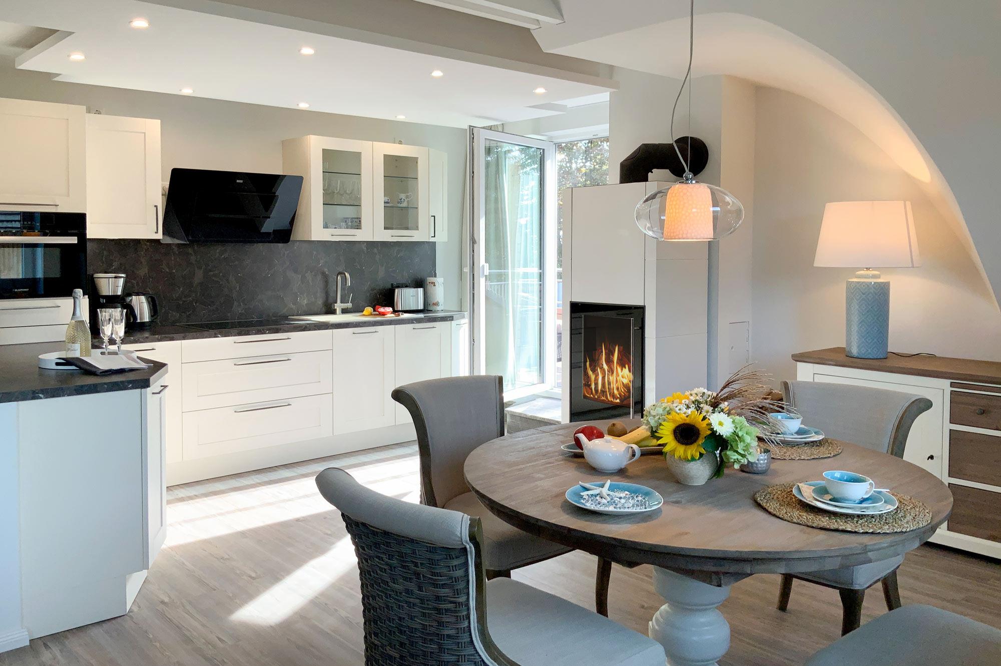 Die Ferienwohnung "Sterntaucher, Whg. 05" empfängt Sie mit einer harmonischen Kombination aus modernem Komfort und maritimem Ambiente. Der helle Wohnbereich mit Kaminofen lädt zu entspannten Stunden ein, während die voll ausgestattete Küche keine Wünsche offenlässt. Genießen Sie Ihre Mahlzeiten auf dem sonnigen Südbalkon mit gemütlichen Loungemöbeln. Das moderne Badezimmer mit eigener Infrarot-Sauna und das ruhig gelegene Schlafzimmer bieten zusätzlichen Komfort für erholsame Nächte.