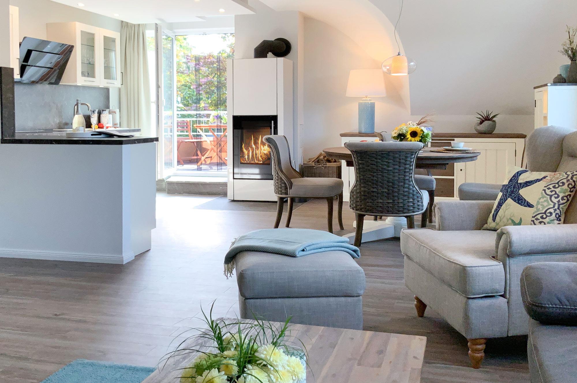 Wohnbereich: Heller Wohnraum mit bequemer Couch, Kaminofen für gemütliche Abende und direktem Zugang zum Südbalkon