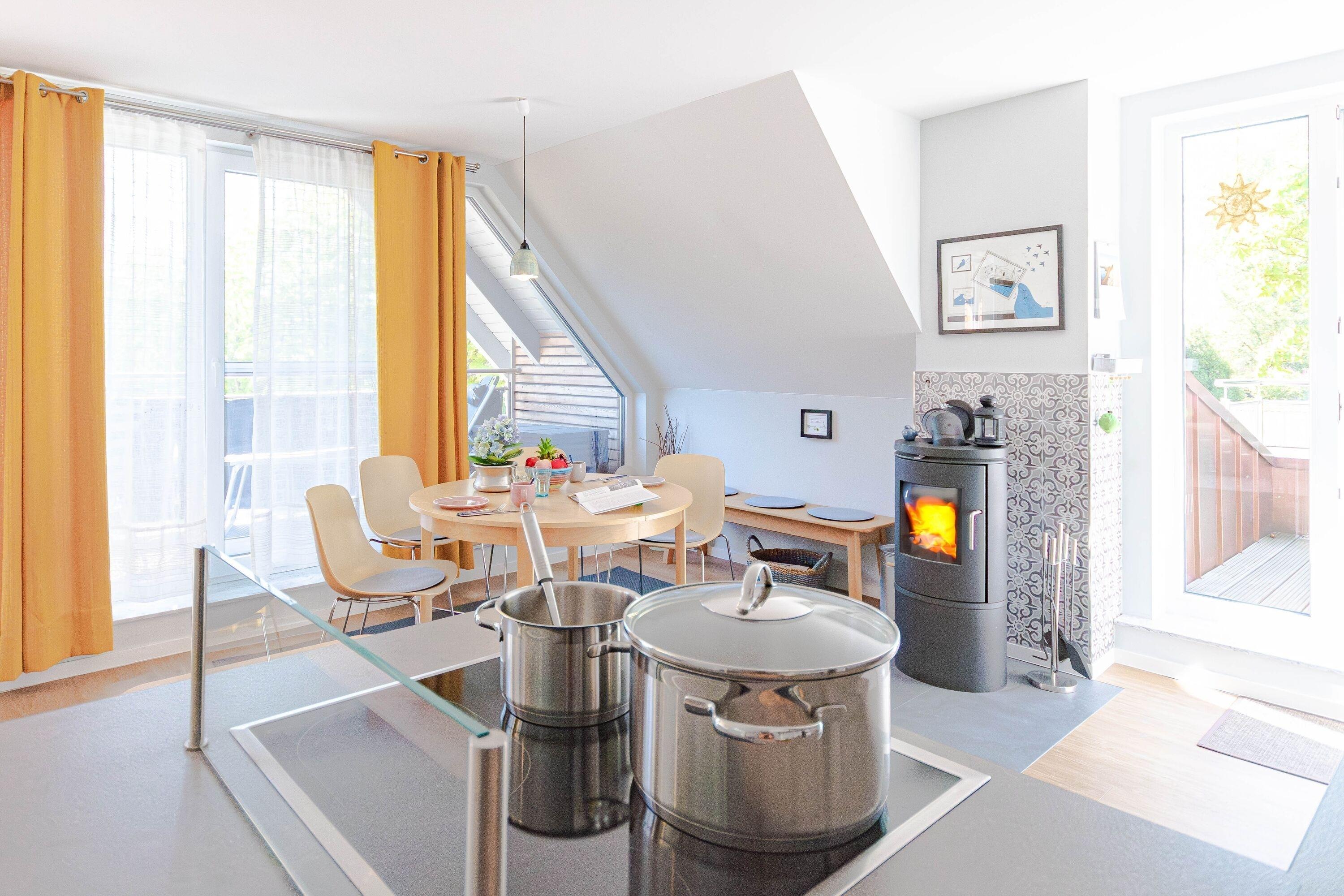 Die Ferienwohnung "Sterntaucher, Whg. 06" empfängt Sie mit einer harmonischen Kombination aus modernem Komfort und maritimem Ambiente. Der helle Wohnbereich mit Kaminofen lädt zu entspannten Stunden ein, während die voll ausgestattete Küche keine Wünsche offenlässt. Genießen Sie Ihre Mahlzeiten auf der überdachten Loggia oder dem Balkon mit Loungemöbeln. Das moderne Badezimmer und das gemütliche Schlafzimmer bieten zusätzlichen Komfort für erholsame Nächte.