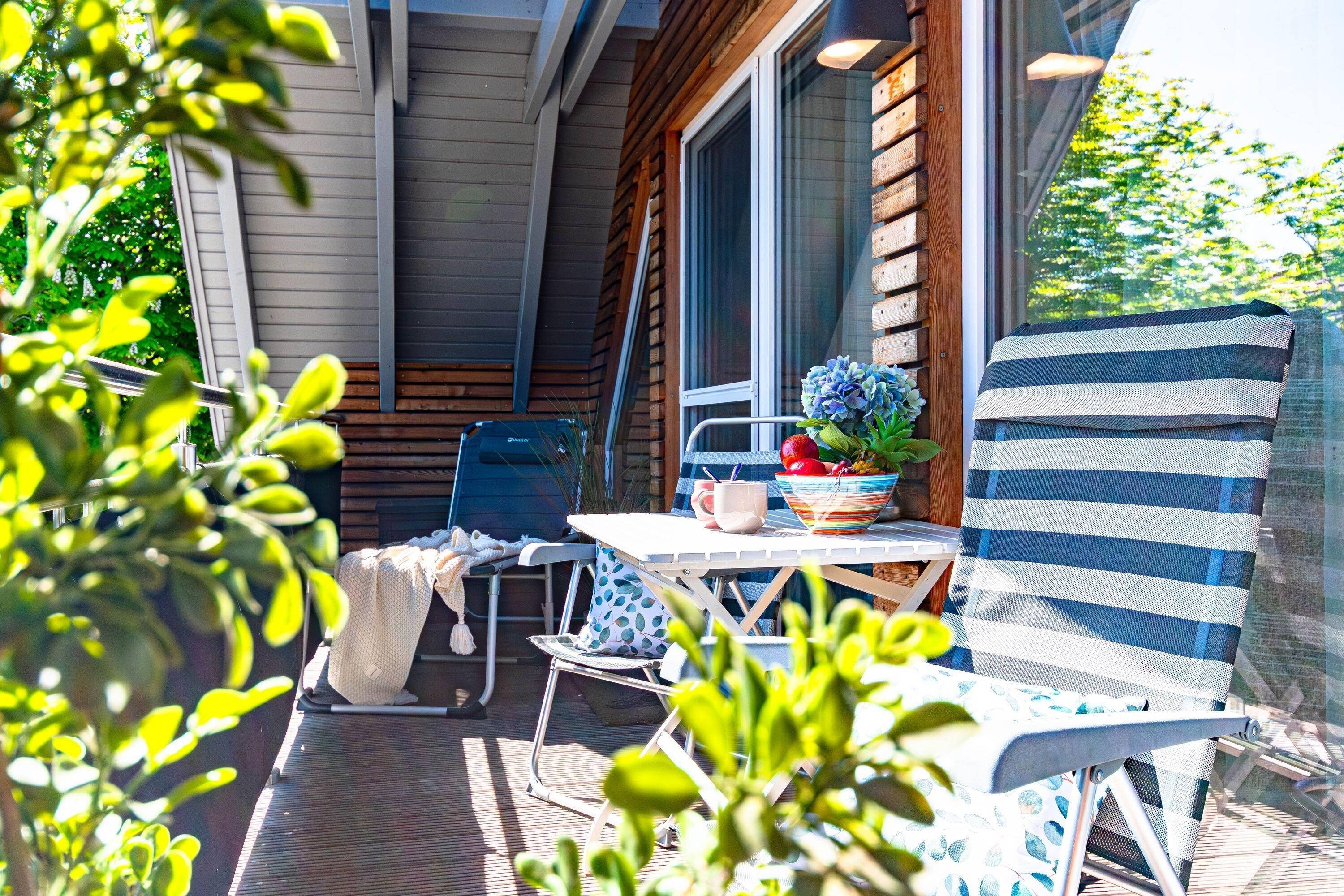 Balkon/Loggia: Überdachte Loggia und Balkon mit Loungemöbeln und Sonnenschirm, ideal zum Entspannen