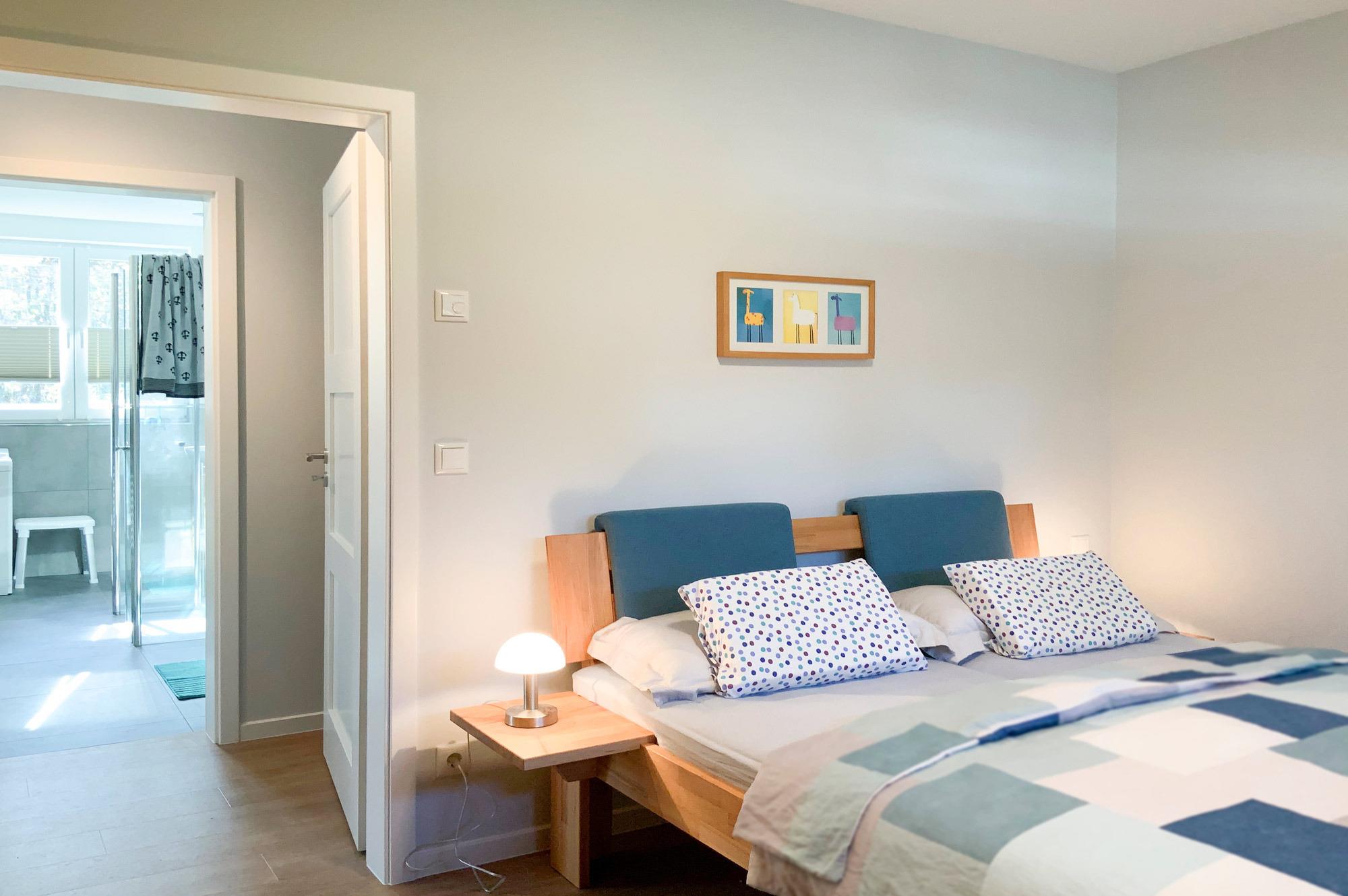 Schlafzimmer: Gemütliches Doppelbett (160 x 200 cm) mit lichtundurchlässigen Gardinen für erholsame Nächte