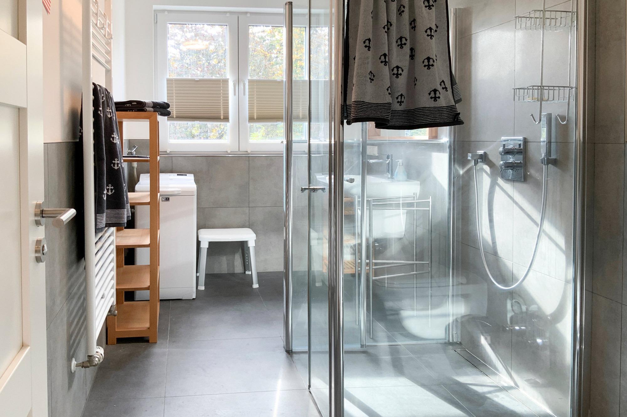 Badezimmer: Modernes Bad mit ebenerdiger Dusche, Fußbodenheizung und Haartrockner