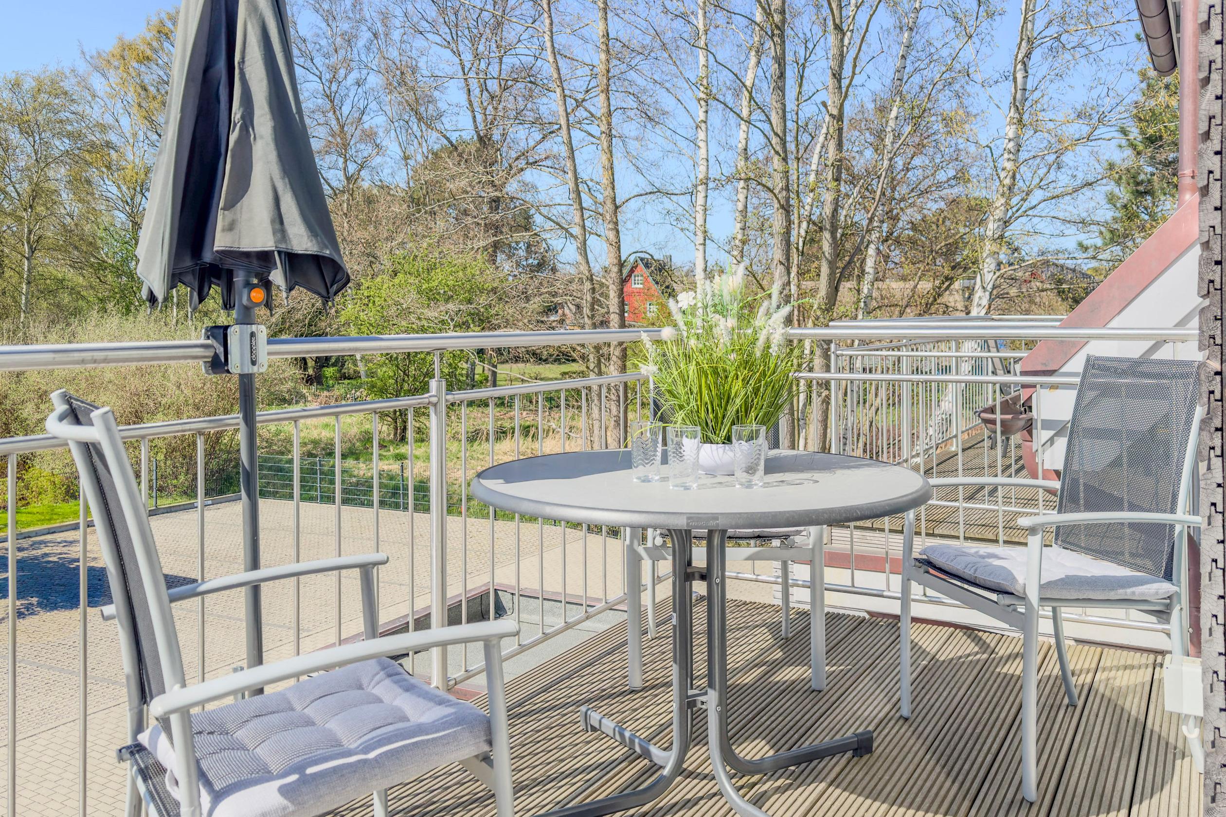 Balkon: Westlich ausgerichteter Balkon mit Sitzgruppe, ideal zum Entspannen und Genießen des milden Ostseeklimas.