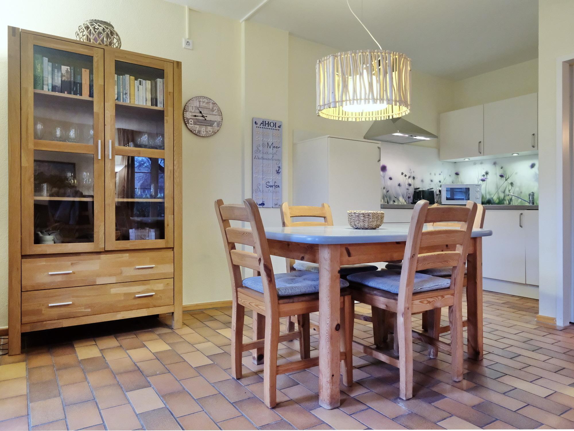 Die Ferienwohnung liegt im EG eines reetgedeckten Ferienhauses und besteht aus einem Wohnraum mit Einbauküche, einem großzügigen Schlafraum, einem Bad mit Dusche und WC, sowie einem zusätzlichen Gäste-WC.
