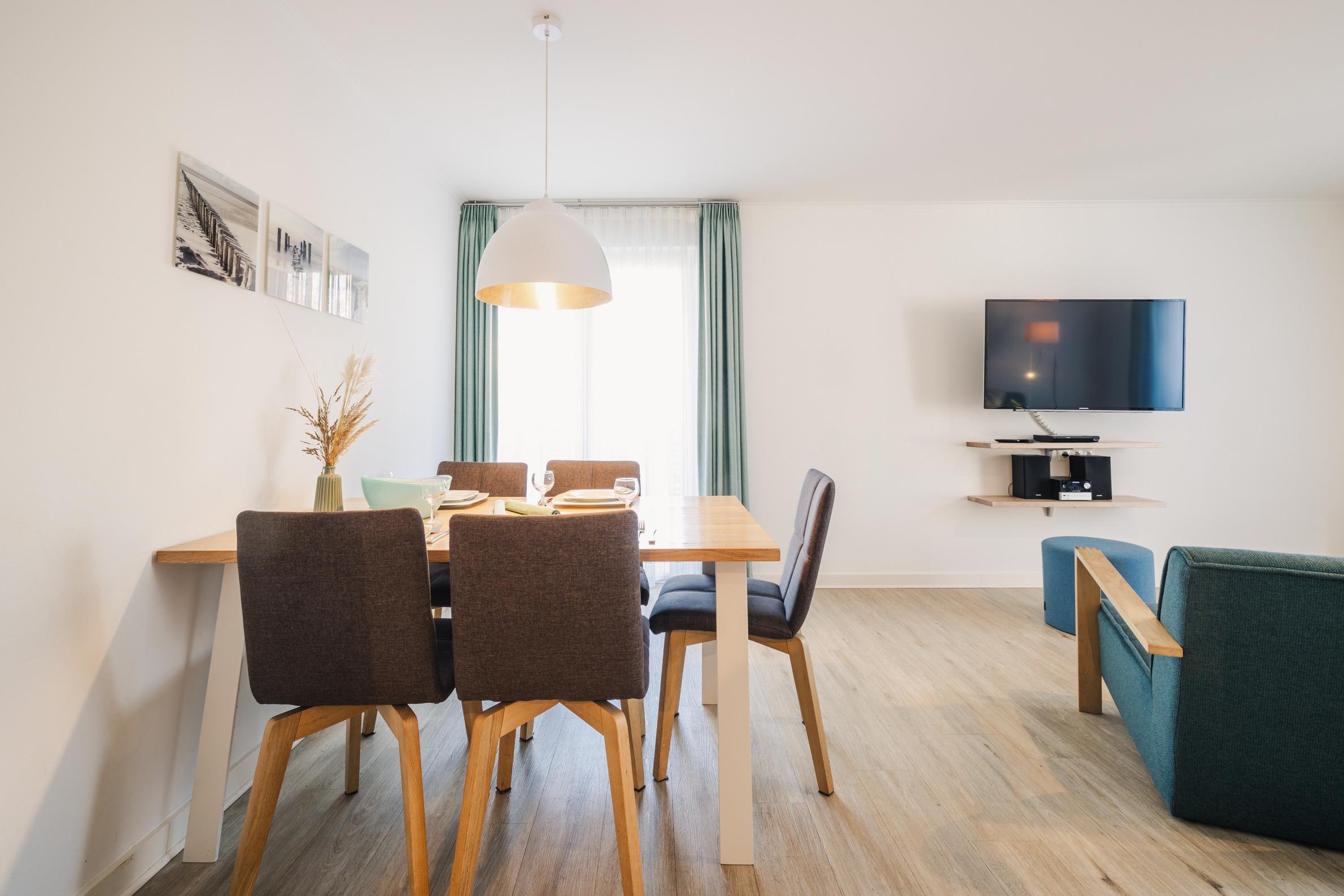 Zwei separate Schlafzimmer mit komfortablen Boxspring-Doppelbetten und TV sorgen für erholsame Nächte. Der gemütliche Wohnbereich mit großer Schlafcouch und Flat-TV lädt zu entspannten Stunden und gemeinsamen Abenden ein.