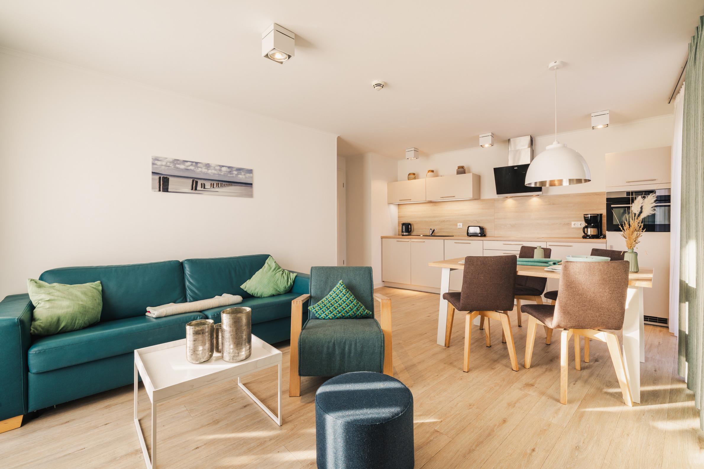 Diese helle 3-Zimmer-Wohnung im Obergeschoss bietet auf rund 60 m² Wohnfläche viel Raum für Familien, Paare oder Freunde. Mit Schlafmöglichkeiten für bis zu sechs Personen, einer hochwertigen maritimen Gestaltung und einer durchdachten Aufteilung ist dieses Appartement der ideale Ort für entspannte Tage im Ostseebad Prerow.