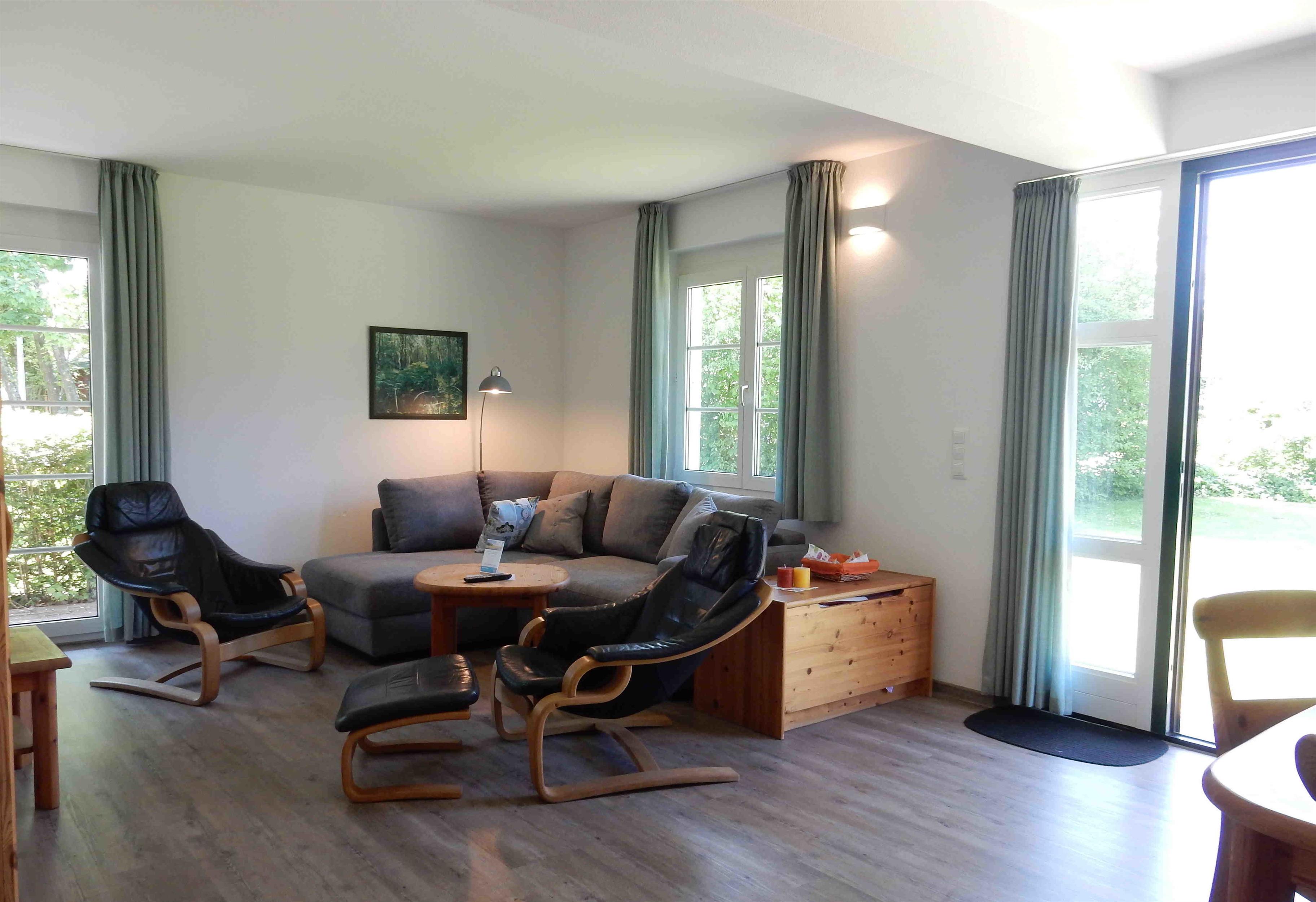 2 Zimmer ca. 54 qm, EG im Haus A, Residenz Kormoran, Grüne Straße 45A-R, Ostseebad Prerow, für 1-4 Personen. Wohnzimmer mit Schlafcouch, WLAN, Sitzgarnitur, SAT-TV/Radio, Esstisch, moderne Küchenzeile, Schlafzimmer, Dusche/WC, extra WC, Terrasse