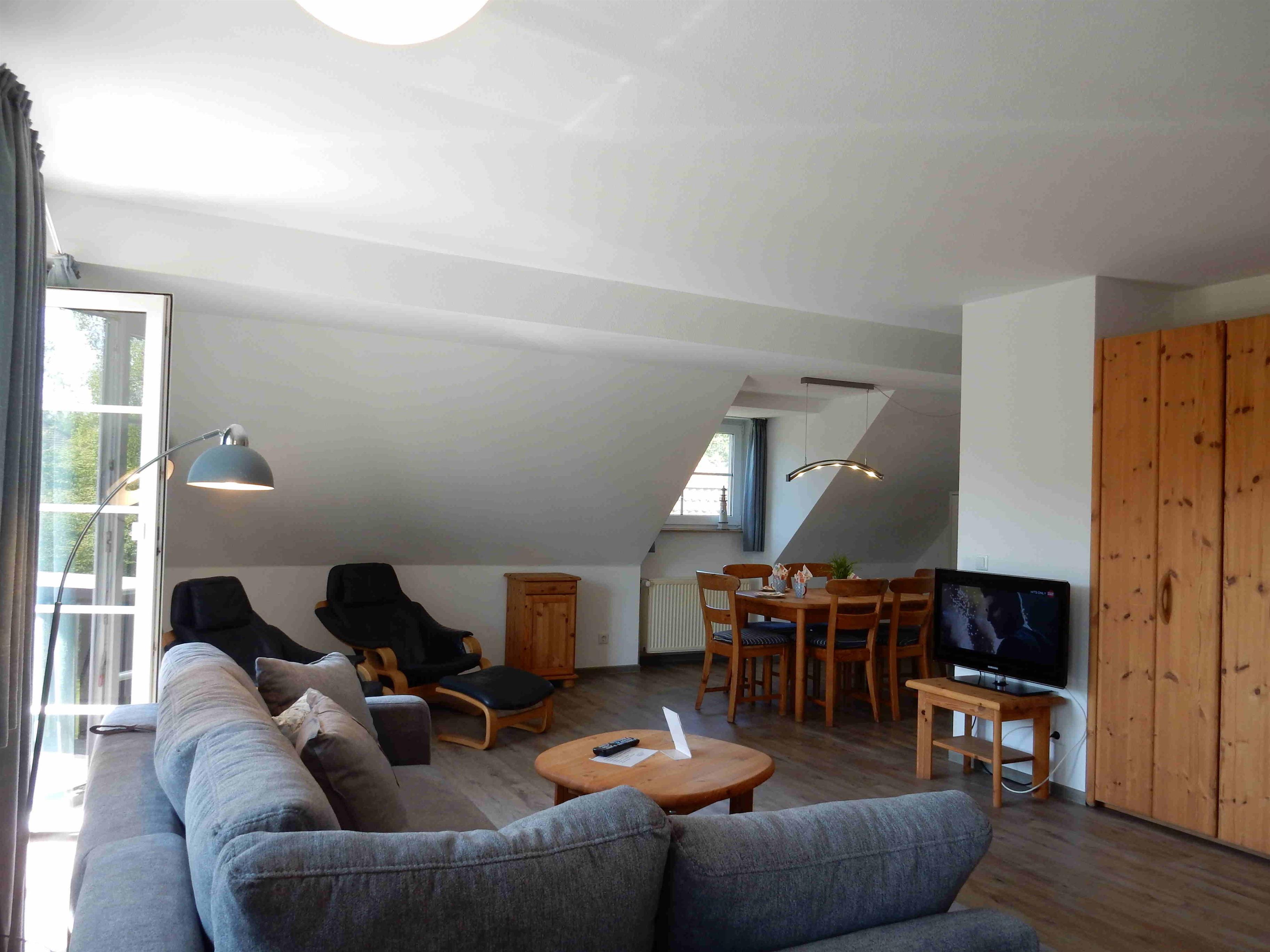 3 Zimmer-Maisonette ca. 75 qm für 2-6 Personen, Haus A in der Residenz Kormoran, Grüne Straße 45A-R, Ostseebad Prerow. 1.OG: Wohnzimmer mit Schlafcouch, Sitzgarnitur, Kleiderschrank, SAT-TV/Radio, WLAN, Duschbad/WC, Balkon, Essecke mit Küchenzeile (Spülmaschine). 2.OG: 2 Schlafzimmer, 1x Doppelbett, 1x 2 Einzelbetten, Dusche/WC