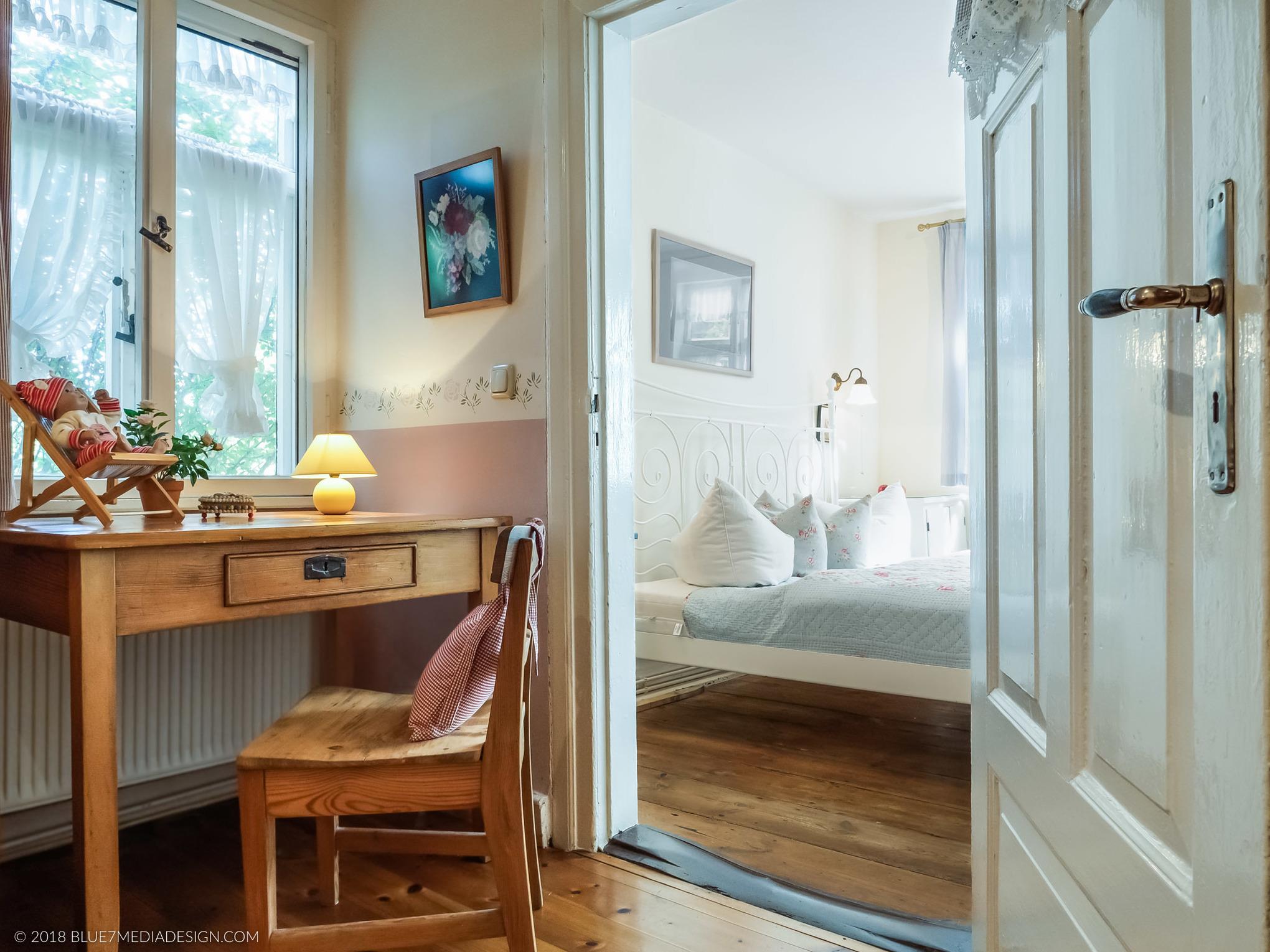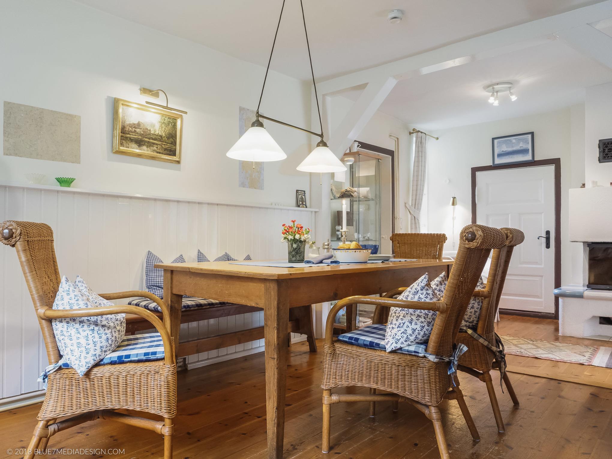 Kamin, gemütliche, z.T. antike Möbel, zahlreiche Bücher mit Bezug zur See, zu Natur und Kultur der Region (aber auch spannende Romane), Jugenstilveranda, draußen ein hübscher Bauerngarten vorm Haus, Liegewiese und Terrasse - alles sichtgeschützt umgeben von dichten, blühenden Hecken, Sträuchern und Bäumen-und auf der Ostseite ein wohnlicher, teilüberdachter Innenhof: all`dies macht die besondere Atmosphäre des kleinen Anwesens aus. Die technische Ausstattung von Küche und Sanitärbereich (mit Fußbodenheizung) ist auf moderstem Stand und vermittelt dennoch ein Gefühl von Behaglichkeit.